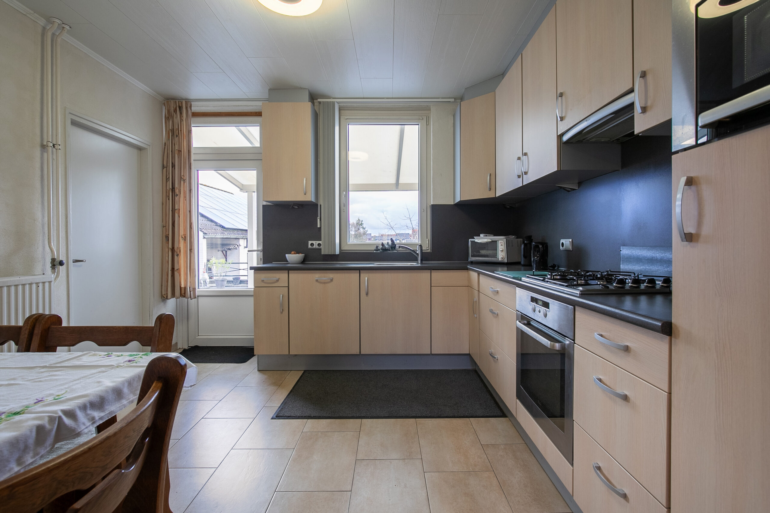 De halfopen keuken is uitgerust met een hoekopstelling en beschikt over een inductiekookplaat, afzuigkap, oven, vaatwasser, koelkast, 1,5 spoelbak en diverse kastruimte. Aansluitend bevindt zich een portaal met toegang tot de achtertuin en de bijkeuken.