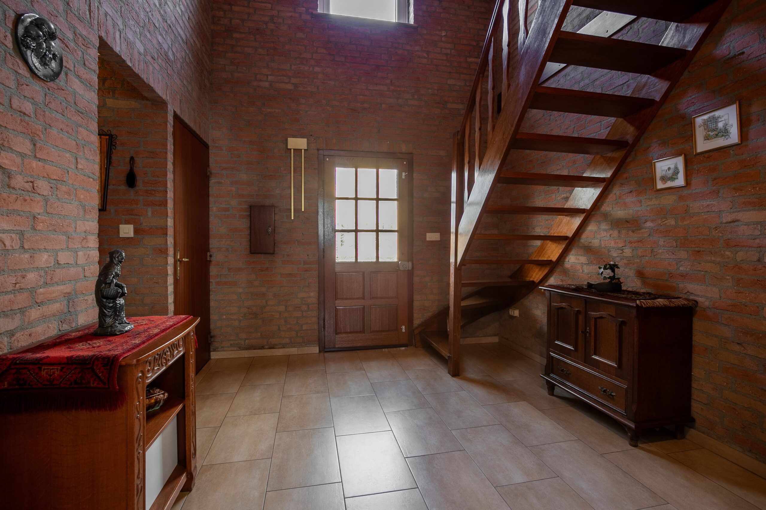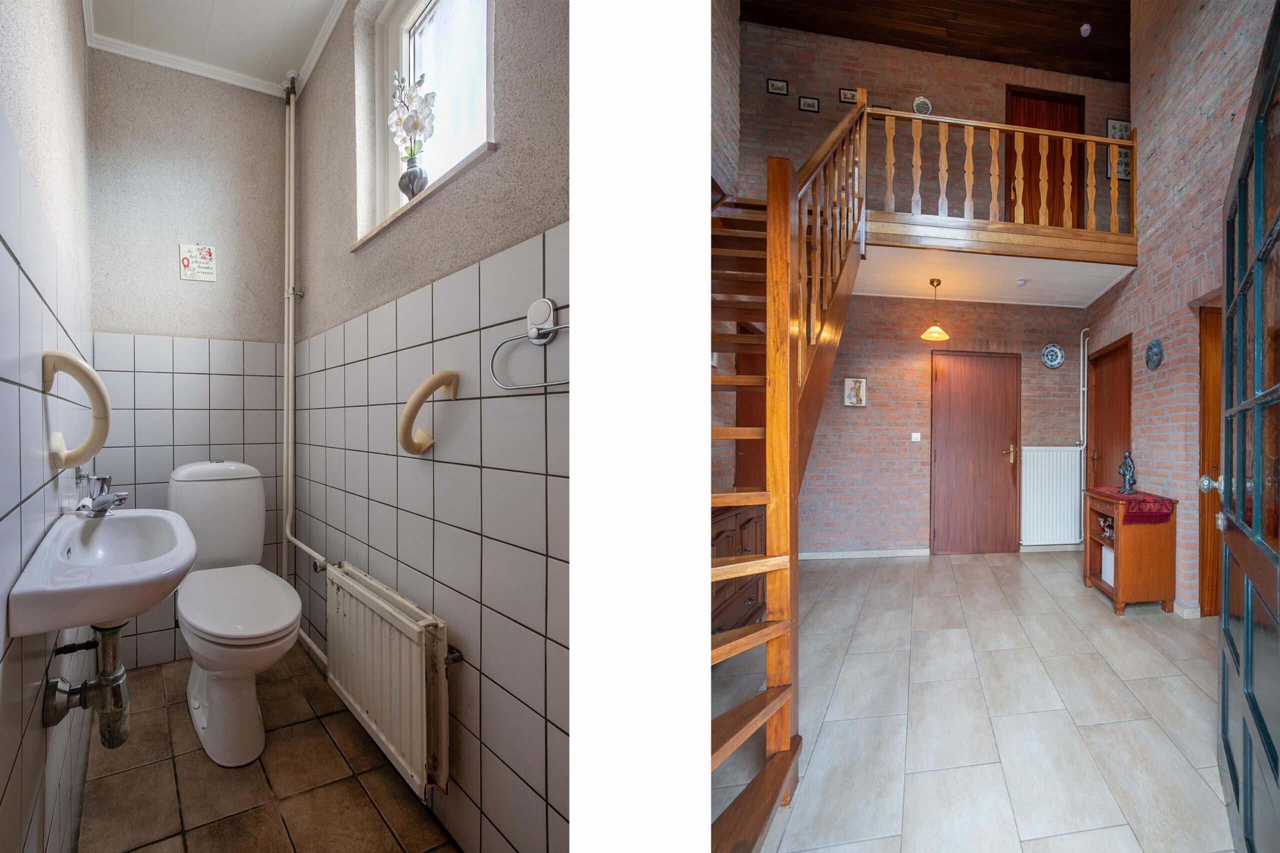 Entree/hal met tegelvloer, trapopgang, garderobenis, meterkast en toegang tot woonkamer, keuken, berging en toiletruimte. Deels betegeld gastentoilet met fonteintje.