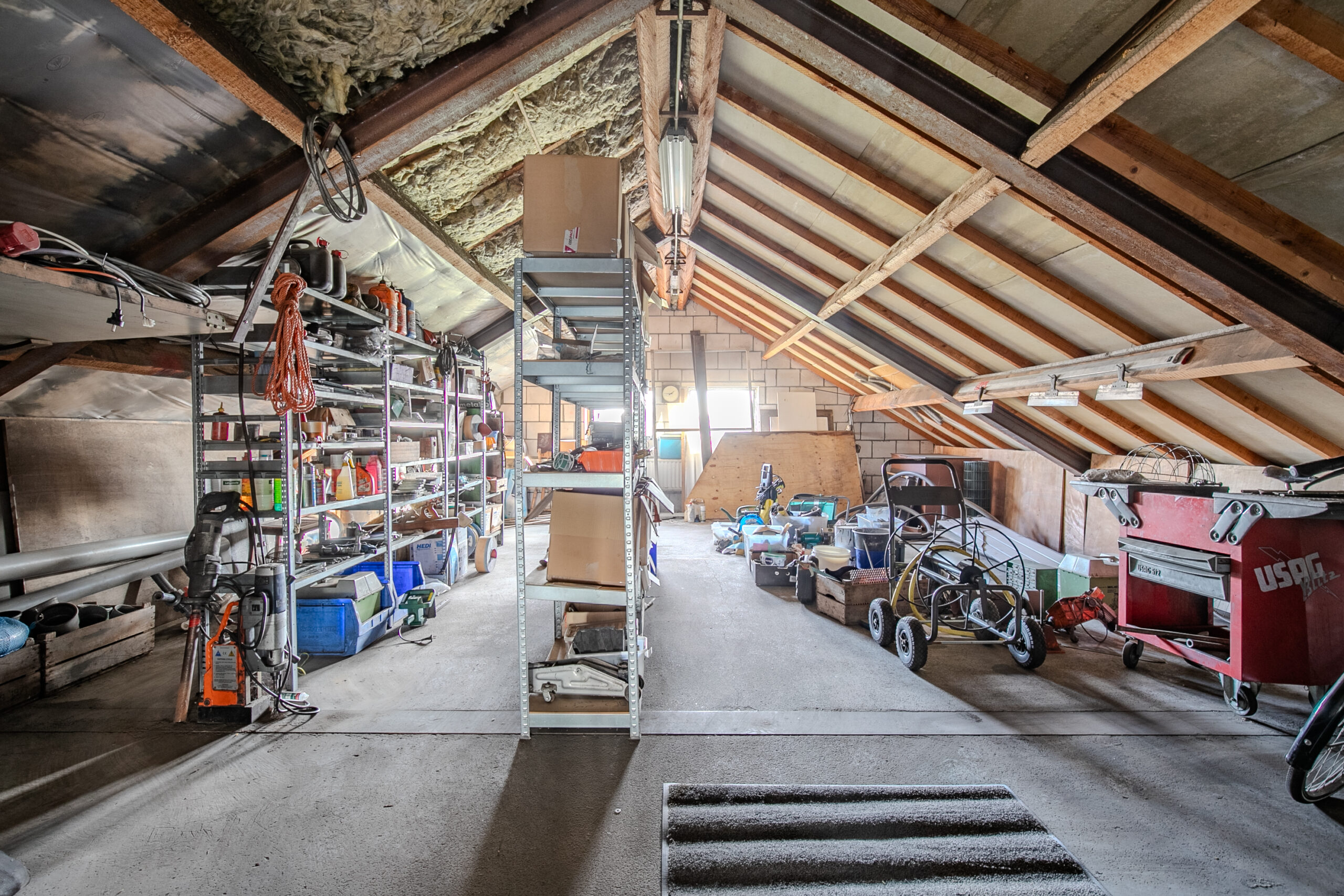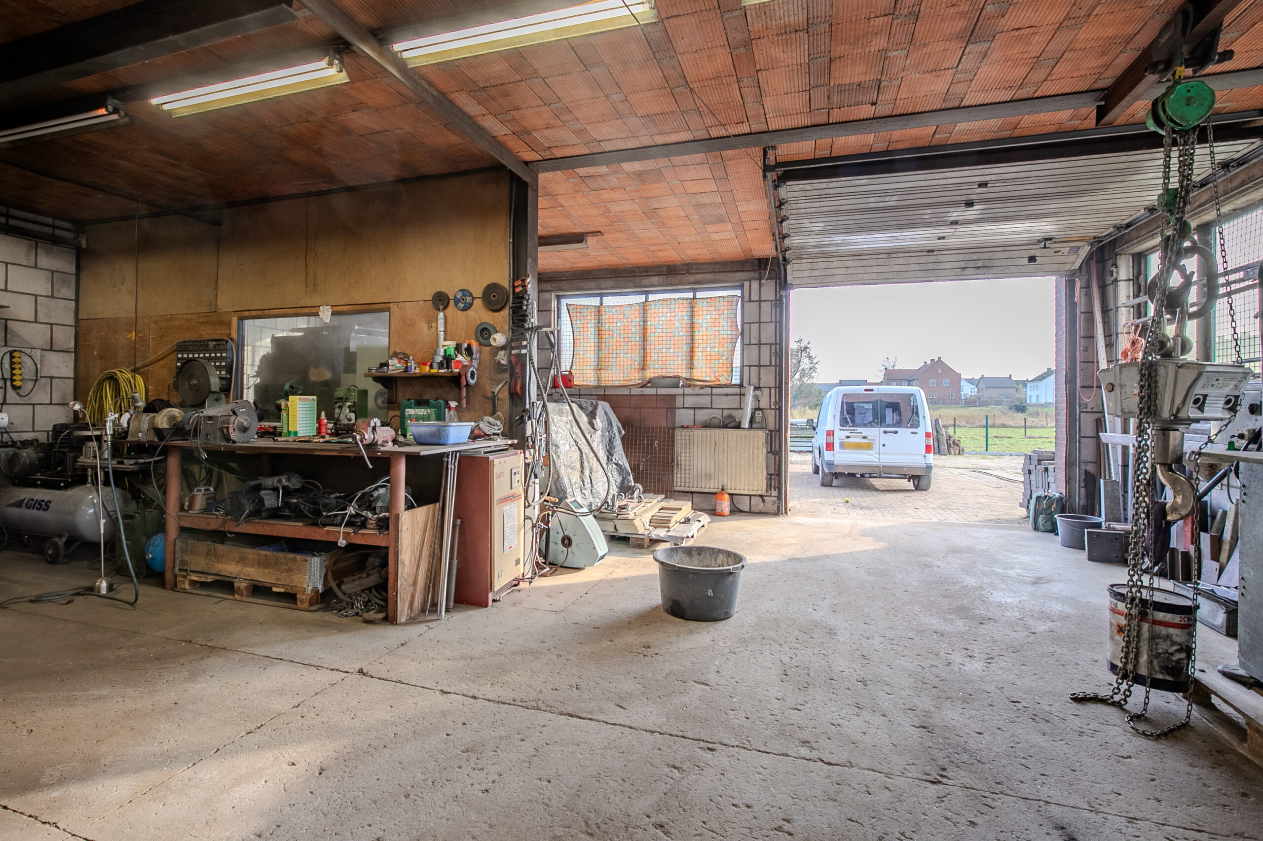 Daarnaast beschikt het object over een multifunctionele loods, ideaal voor een bedrijf aan huis. De loods is verdeeld over twee etages. Op de begane grond bevindt zich een ruime werkruimte, die momenteel is ingericht met diverse machines en opslag, en tevens mogelijkheden biedt voor het realiseren van een kantine.