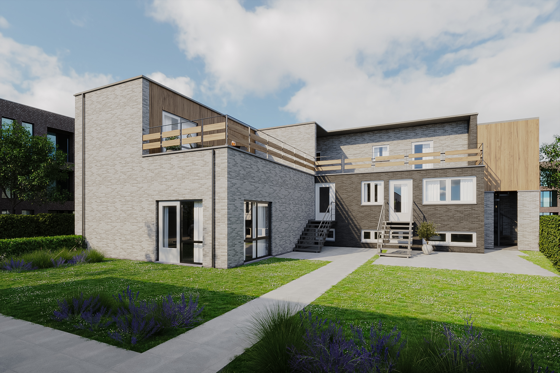 Aan de achterzijde wordt een maisonnette woning van twee verdiepingen met 2 slaapkamers en eigen ingang gerealiseerd. Deze woning heeft een ruime woonkamer met open keuken, badkamer en berging op de begane grond en twee slaapkamers op de verdieping met een heel ruim dakterras. De woning heeft een woonoppervlak van circa 85 m2.