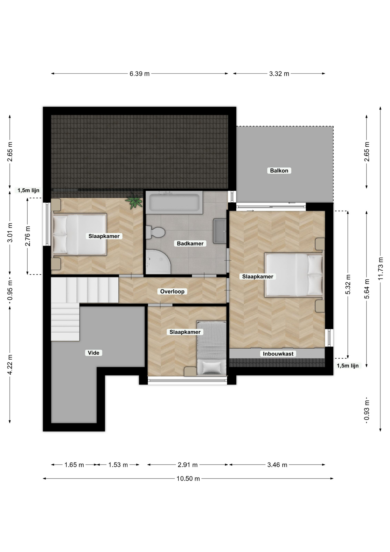 3) 2.91 m x 2.53 m — voorzien van een dakkapel en rolluik.