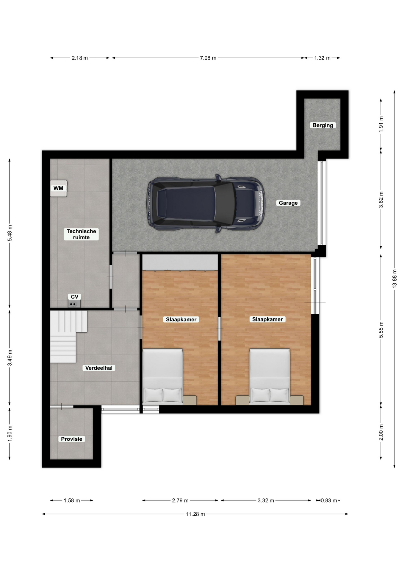 2) 3.33 m x 3.01 m — Via de achtergelegen slaapkamer bereikt u een berging met de omvormer ten behoeve van de zonnepanelen.