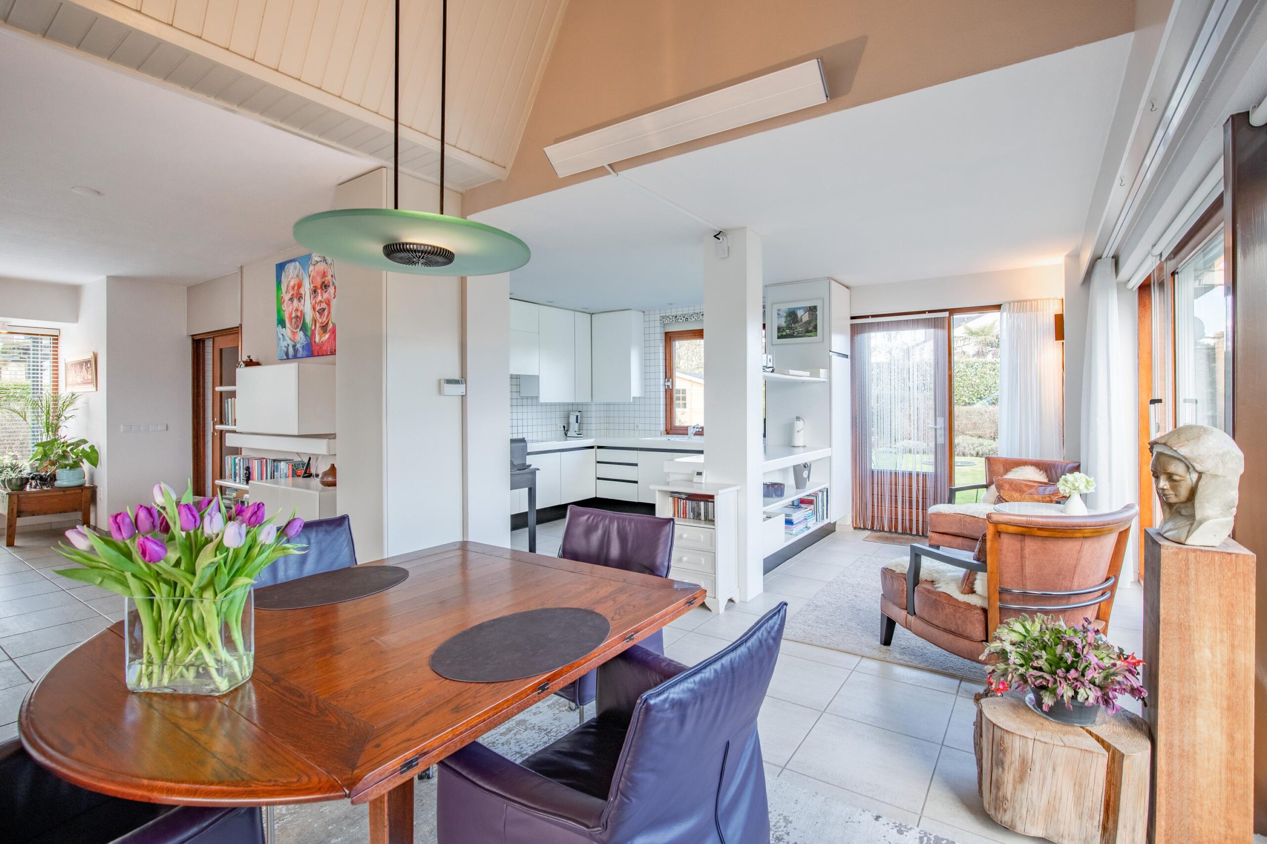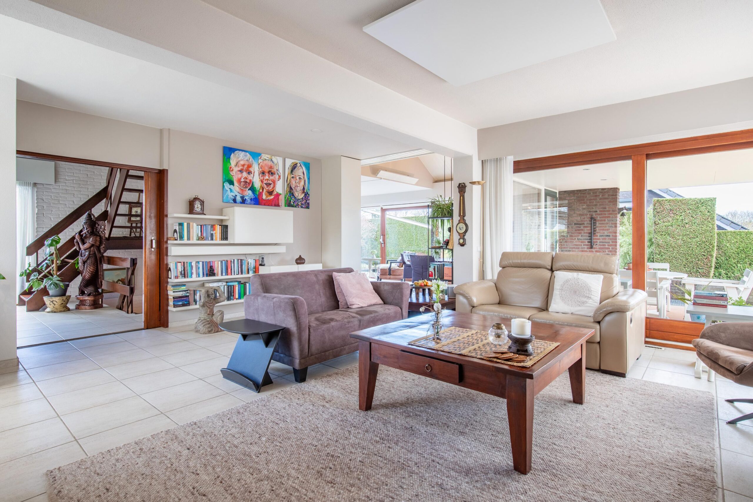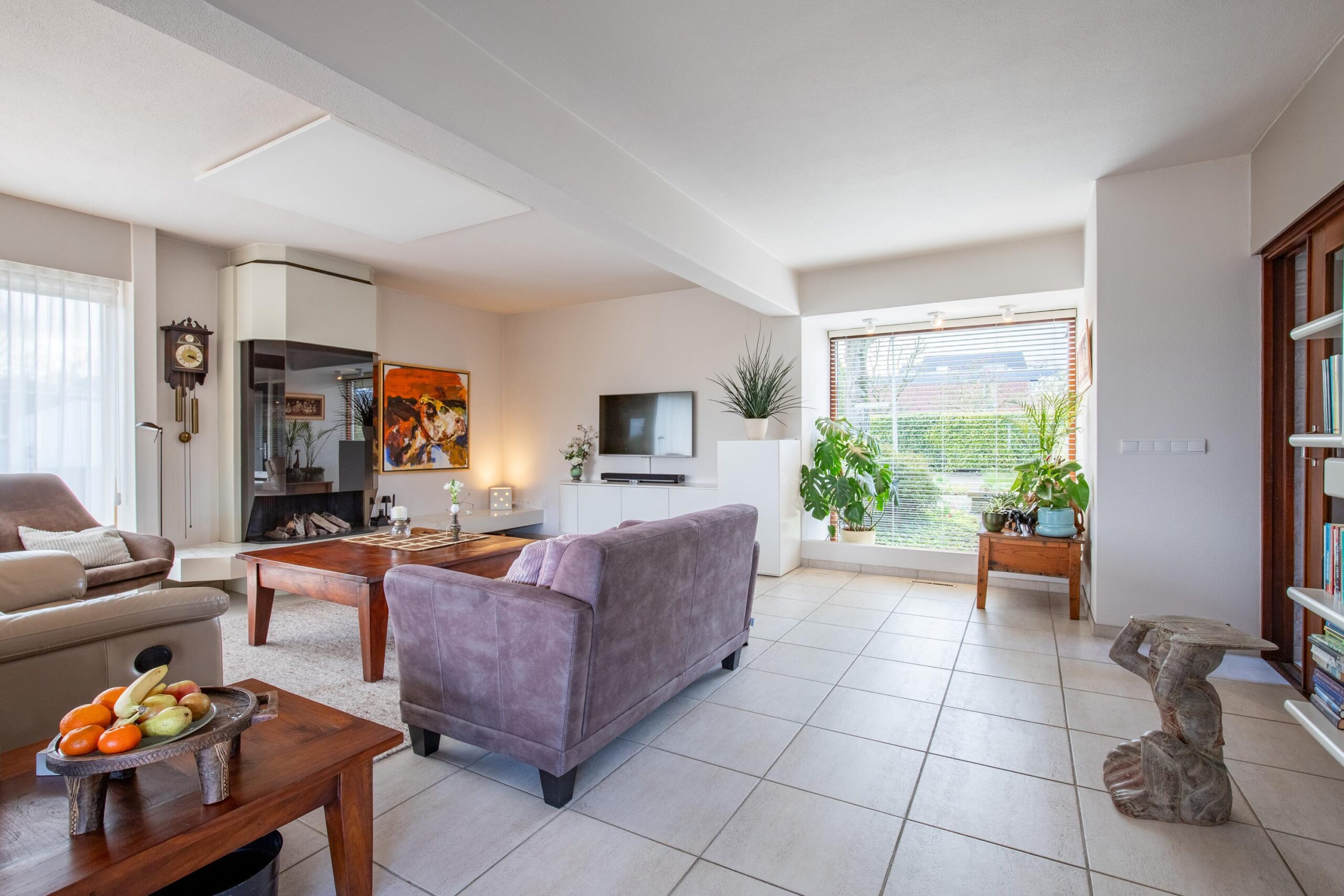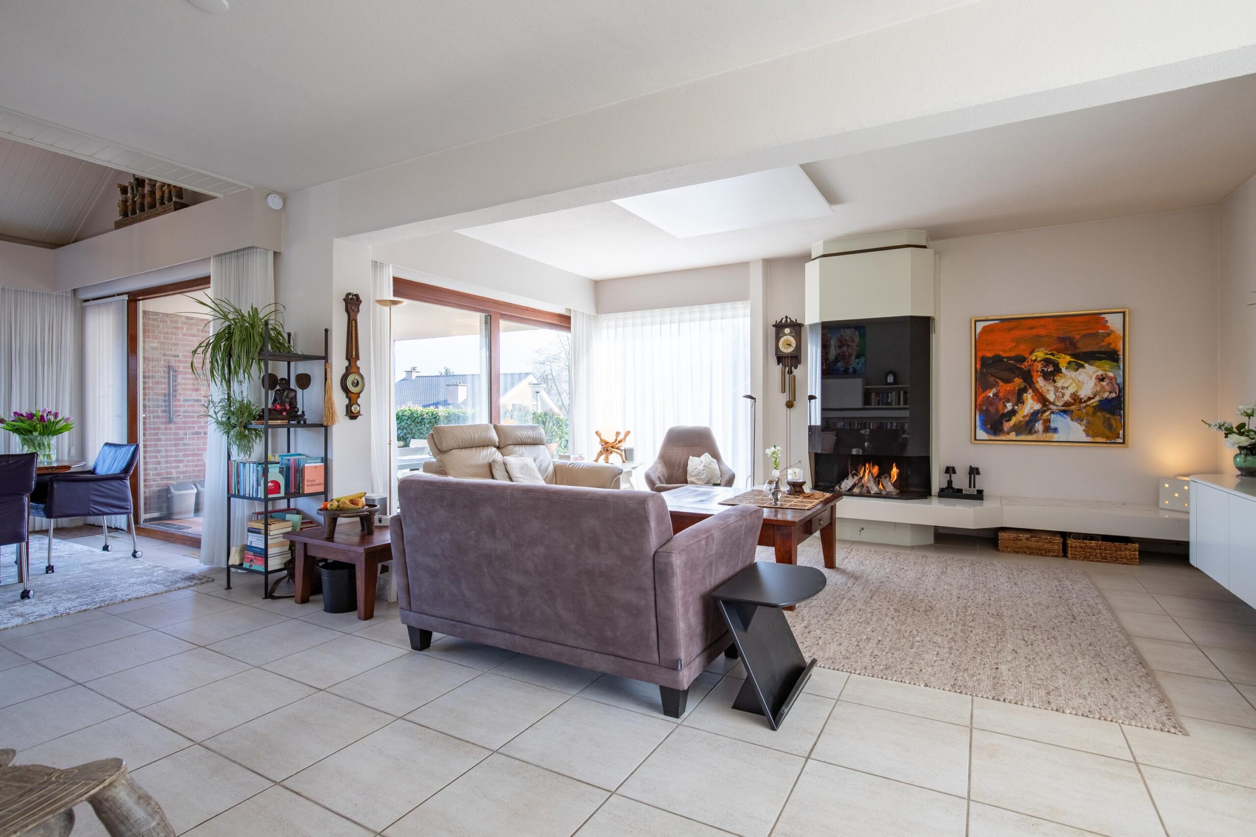 De gehele living is afgewerkt met een doorlopende lichte plavuizenvloer.