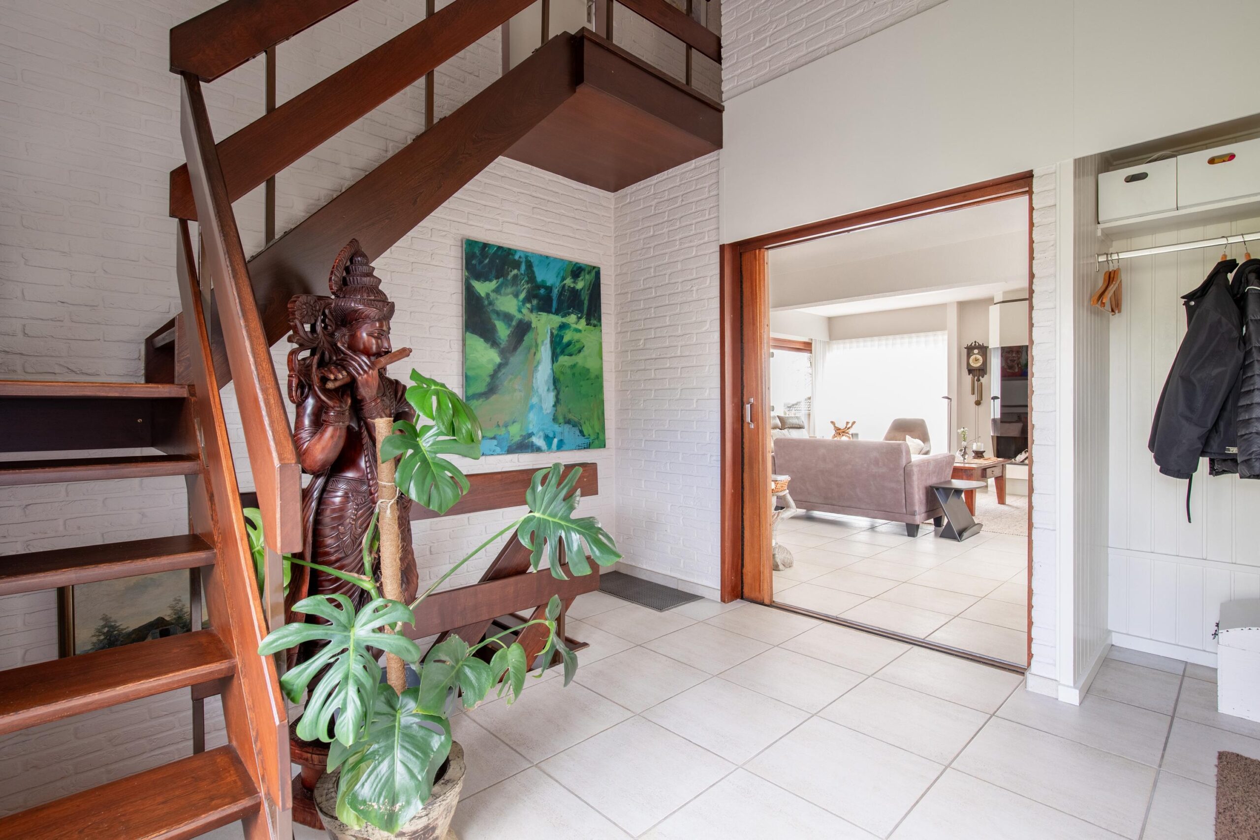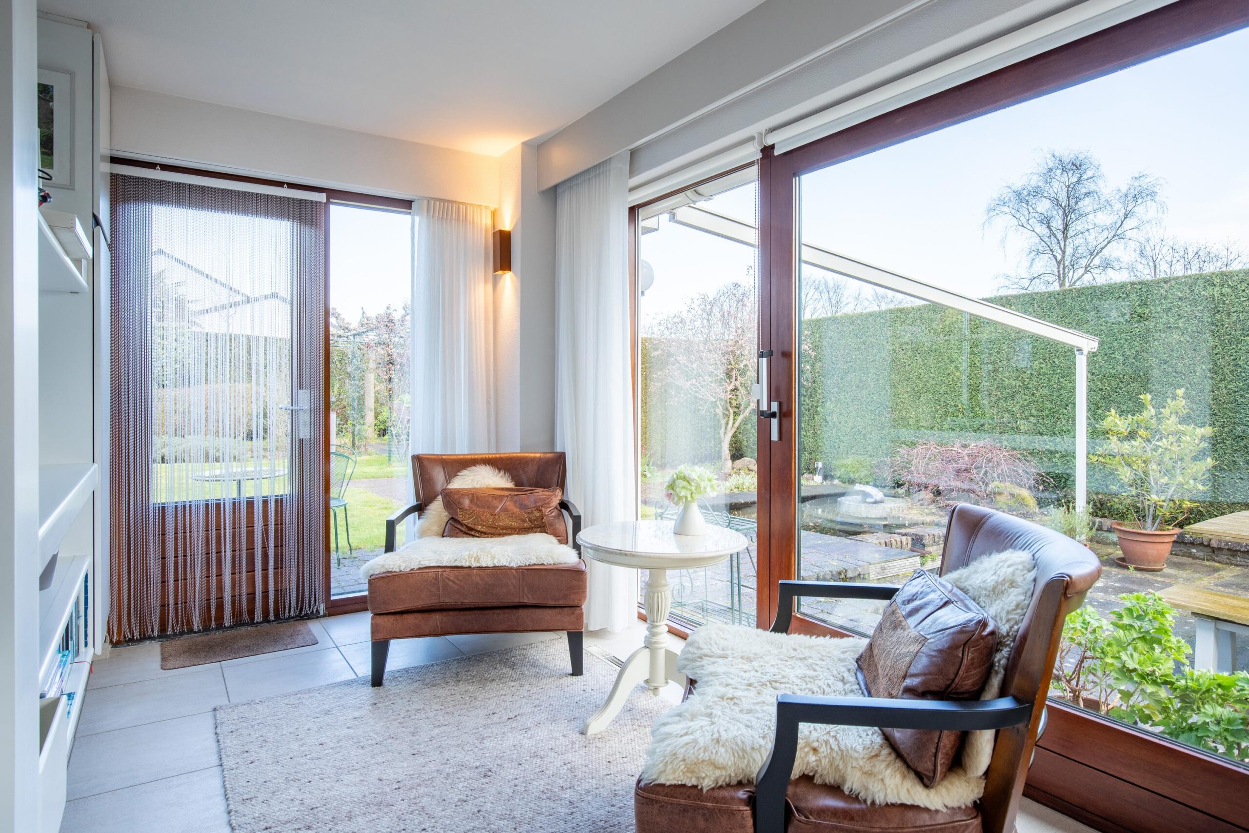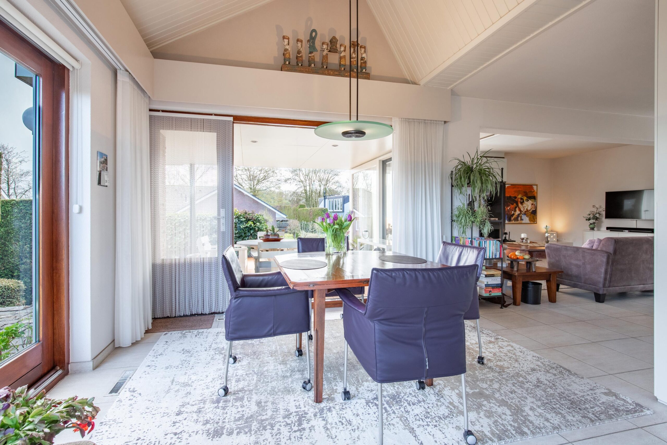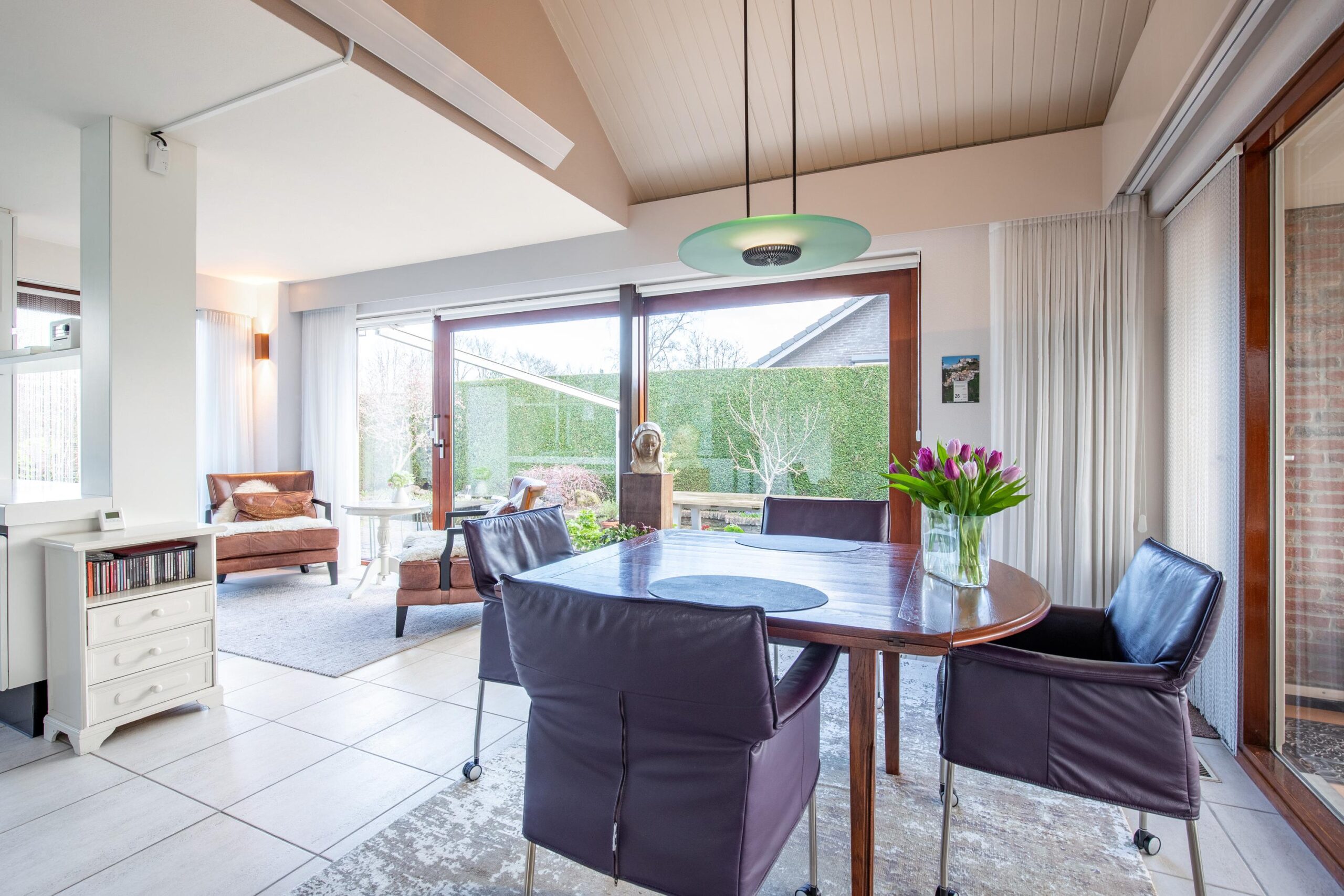 De gehele living is afgewerkt met een doorlopende lichte plavuizenvloer.