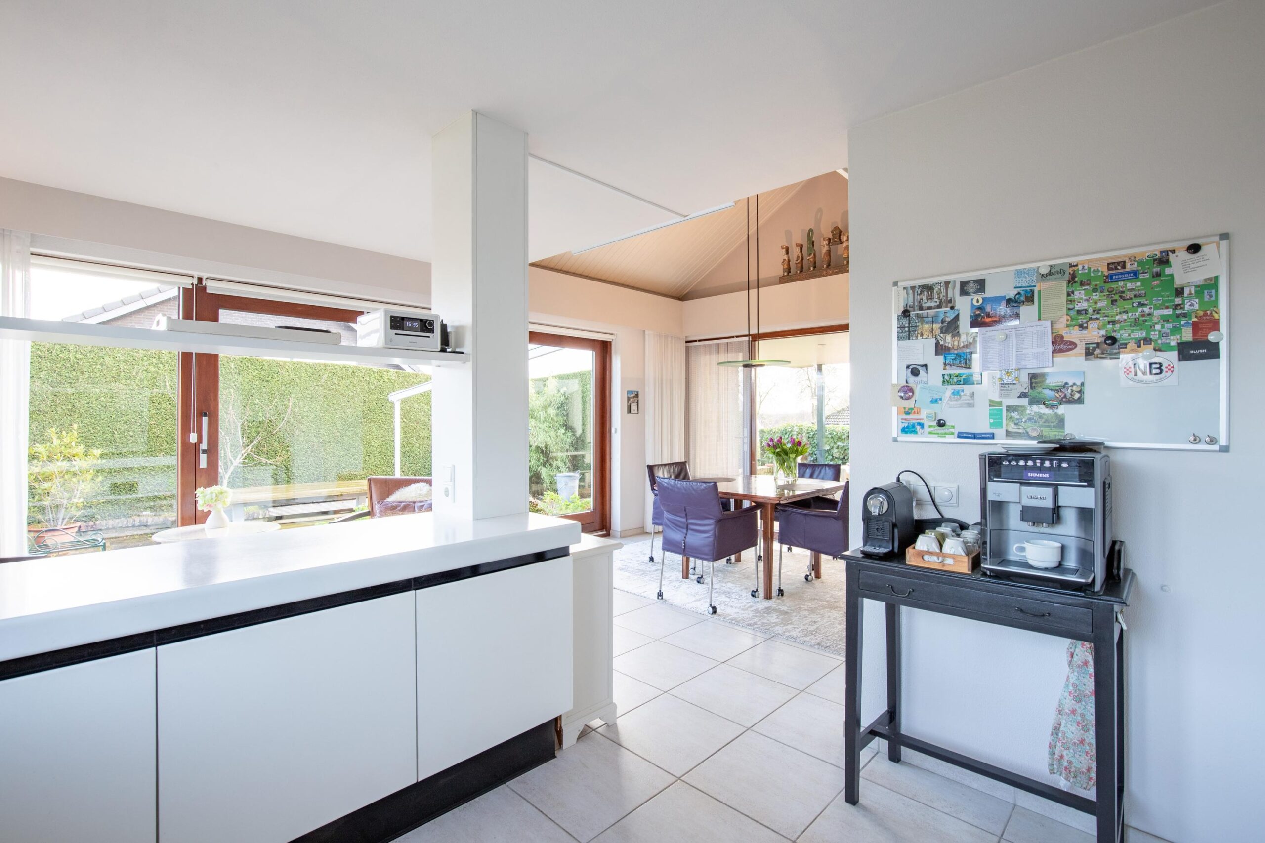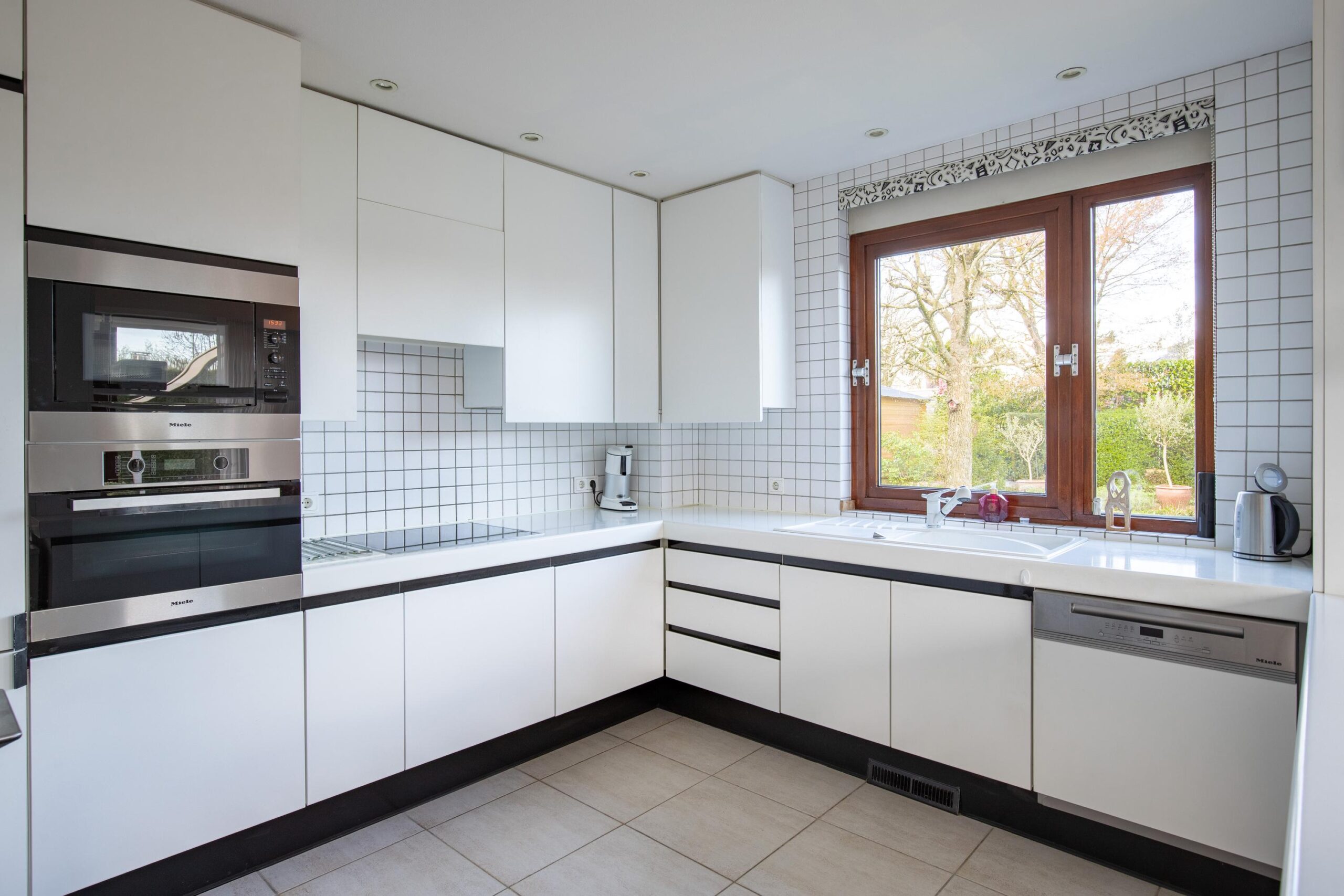 Het separate eetgedeelte biedt uitzicht op de tuin en geeft eveneens toegang tot een terras. De zeer royale, moderne witte keuken in U-opstelling is greeploos uitgevoerd en voorzien van hoogwaardige Miele apparatuur, waaronder een keramische kookplaat, magnetron, oven, koel-vriescombinatie, vaatwasser en spoelbak.