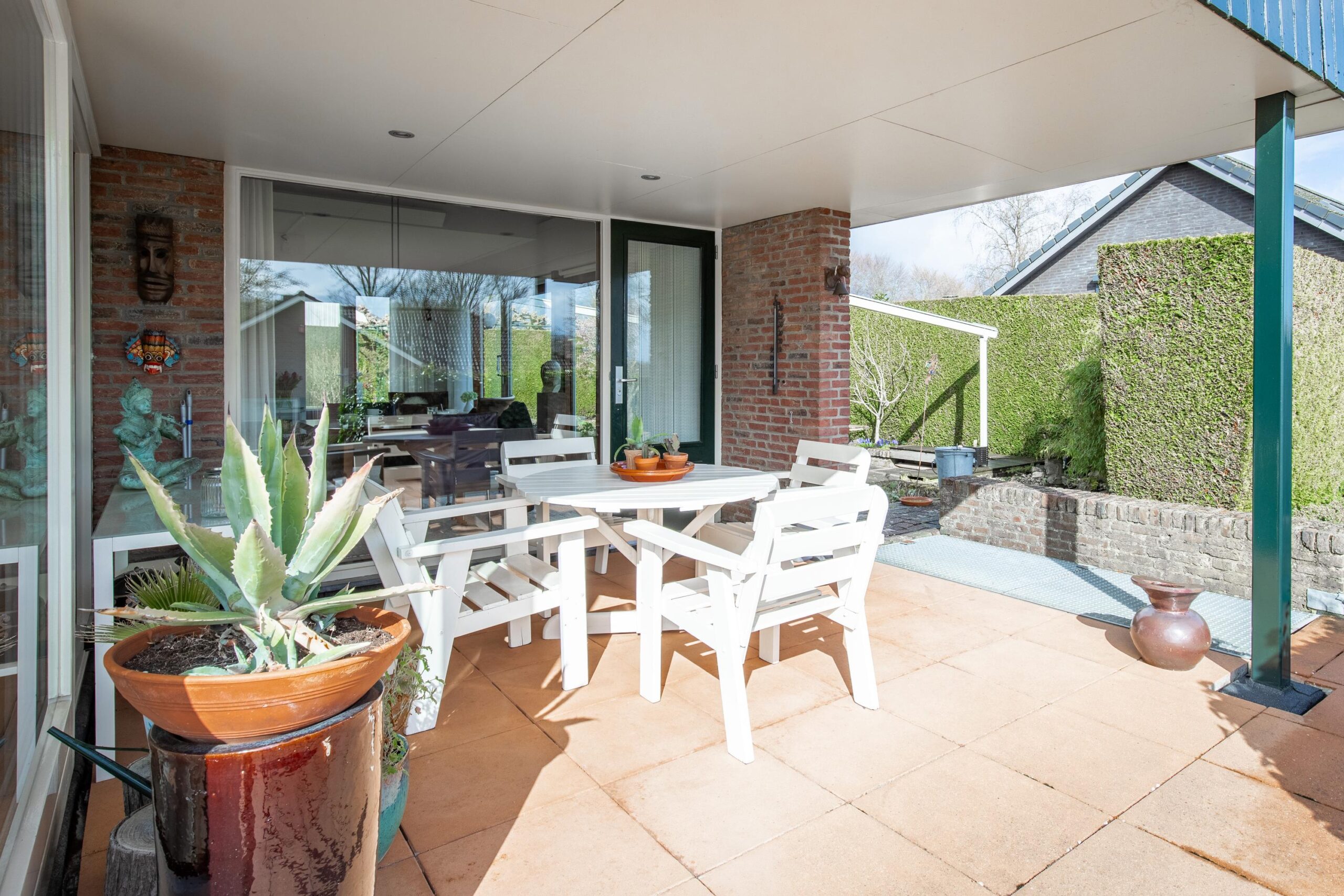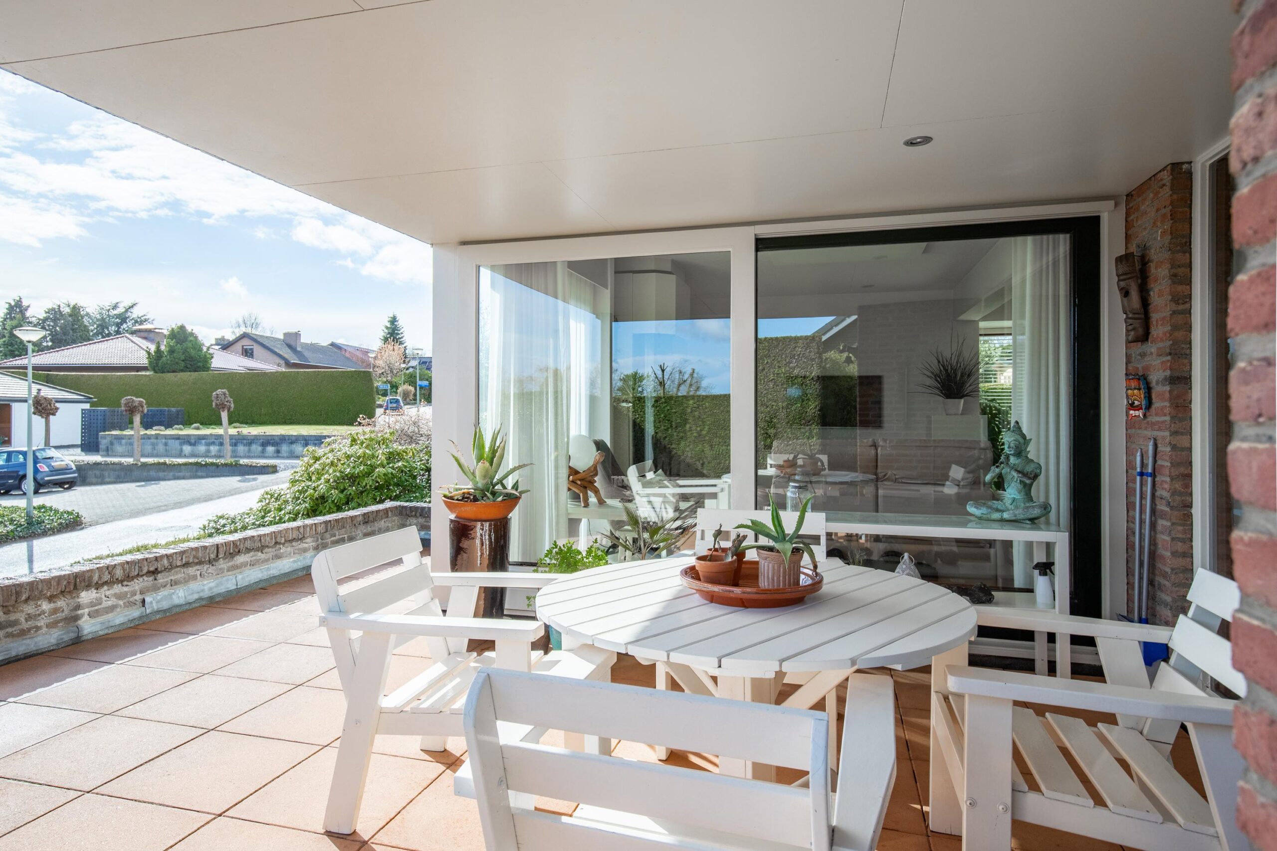 Via de schuifpui bereikt u het overdekte terras aan de voorzijde, waar u kunt genieten van een panoramisch uitzicht over de omgeving.