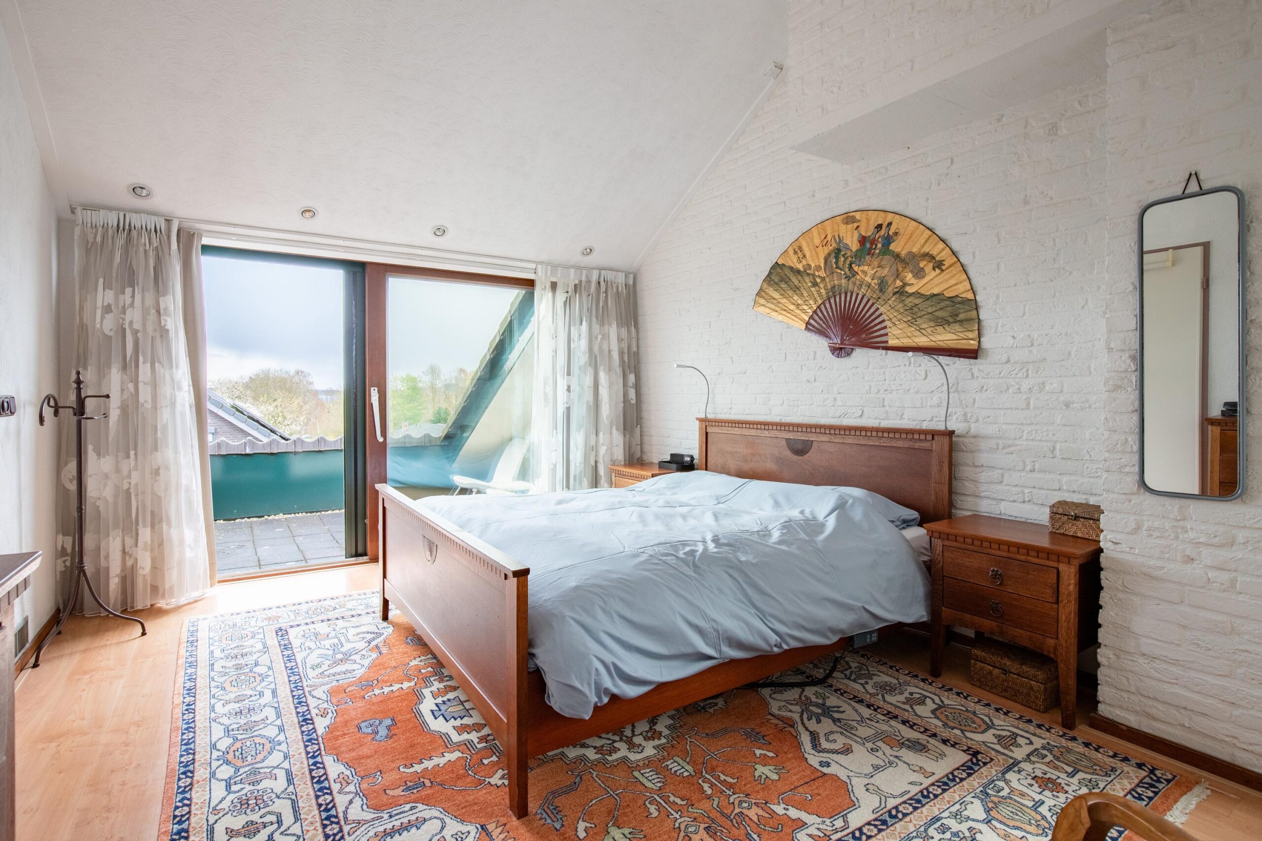 1) 5.64 m x 3.46 m — De masterbedroom is voorzien van een schuifkastenwand, laminaatvloer en een hardhouten schuifpui naar het balkon met fraai uitzicht over de omgeving.