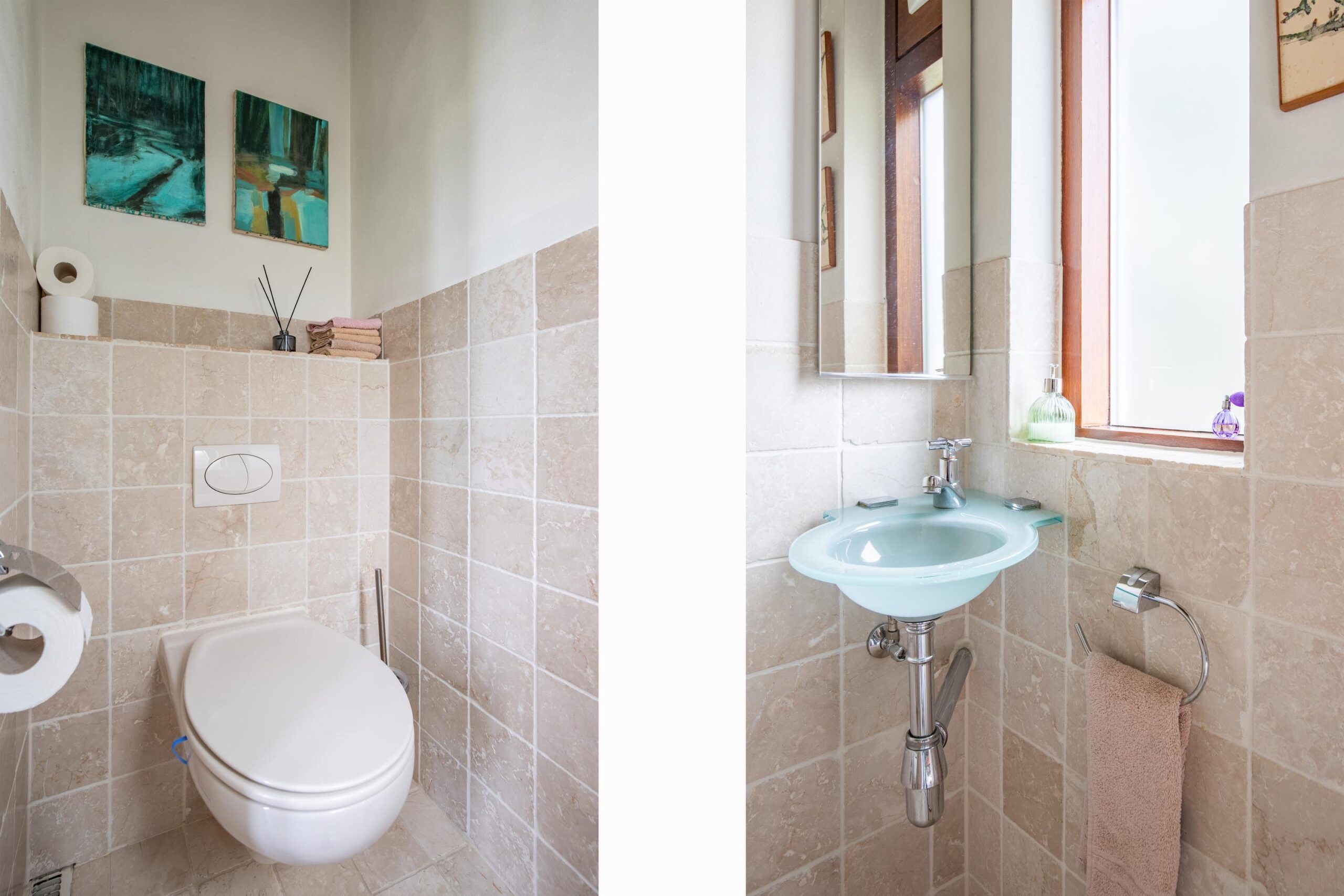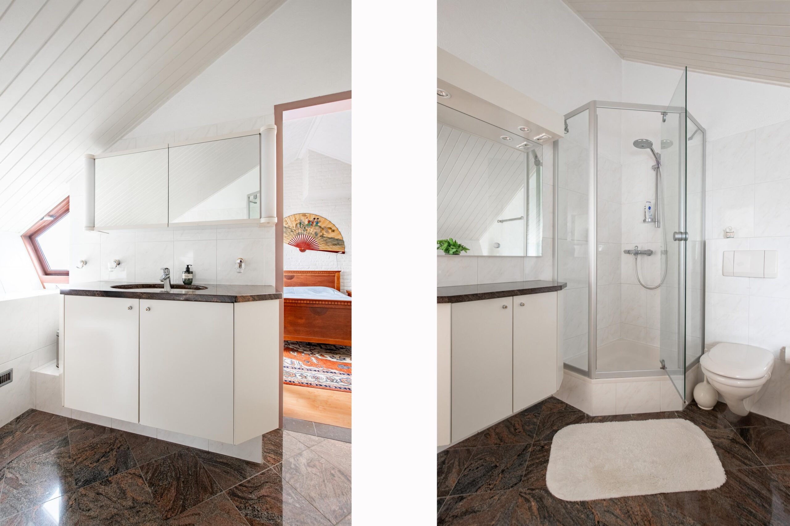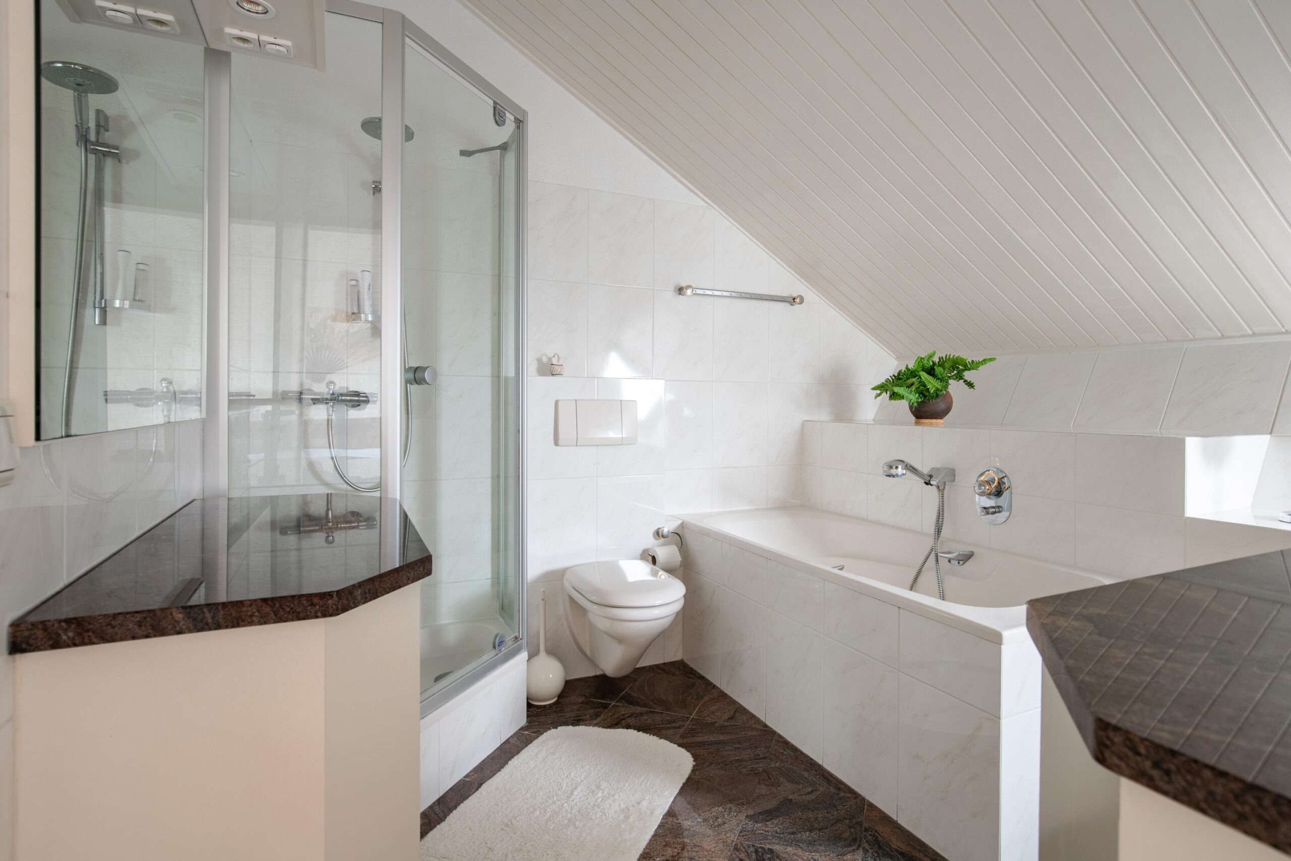 De luxe, volledig betegelde badkamer en suite beschikt over een wastafel met granieten blad, tweede vrijhangend toilet, kunststof ligbad en een douche met hardglazen douchedeuren.