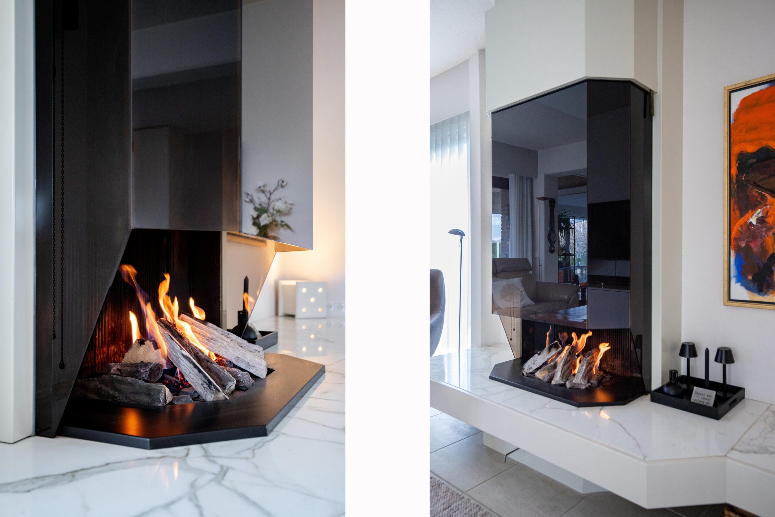 De speels ingedeelde living is toegankelijk via een hardhouten schuifdeur en kenmerkt zich door een uitstekende lichtinval dankzij grote raampartijen. De ruimte is voorzien van infraroodverwarming, designkasten en een sfeervolle design gashaard met glazen schouw.