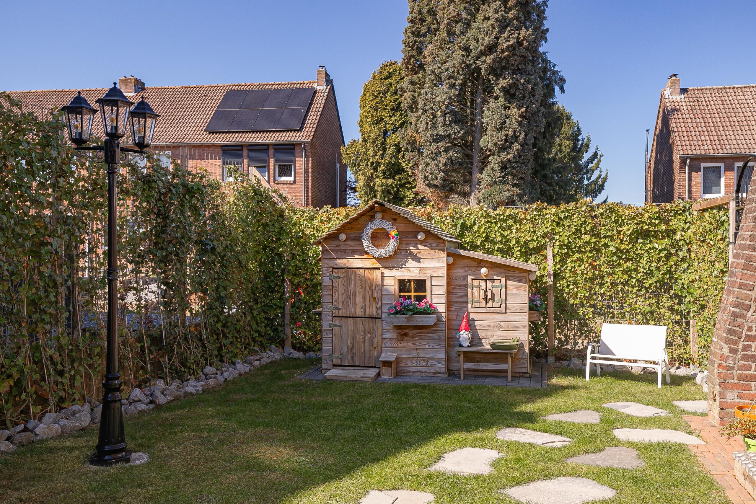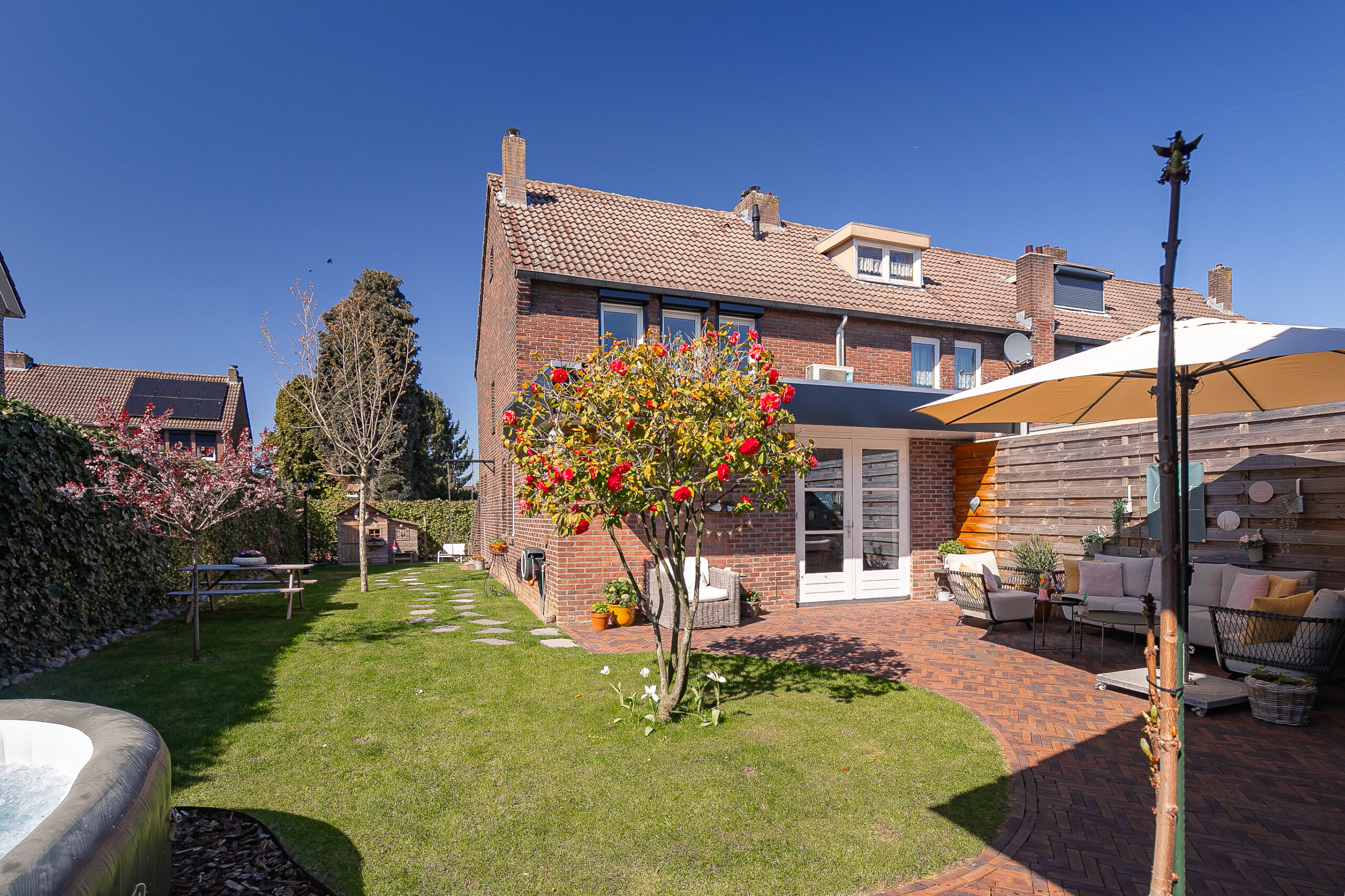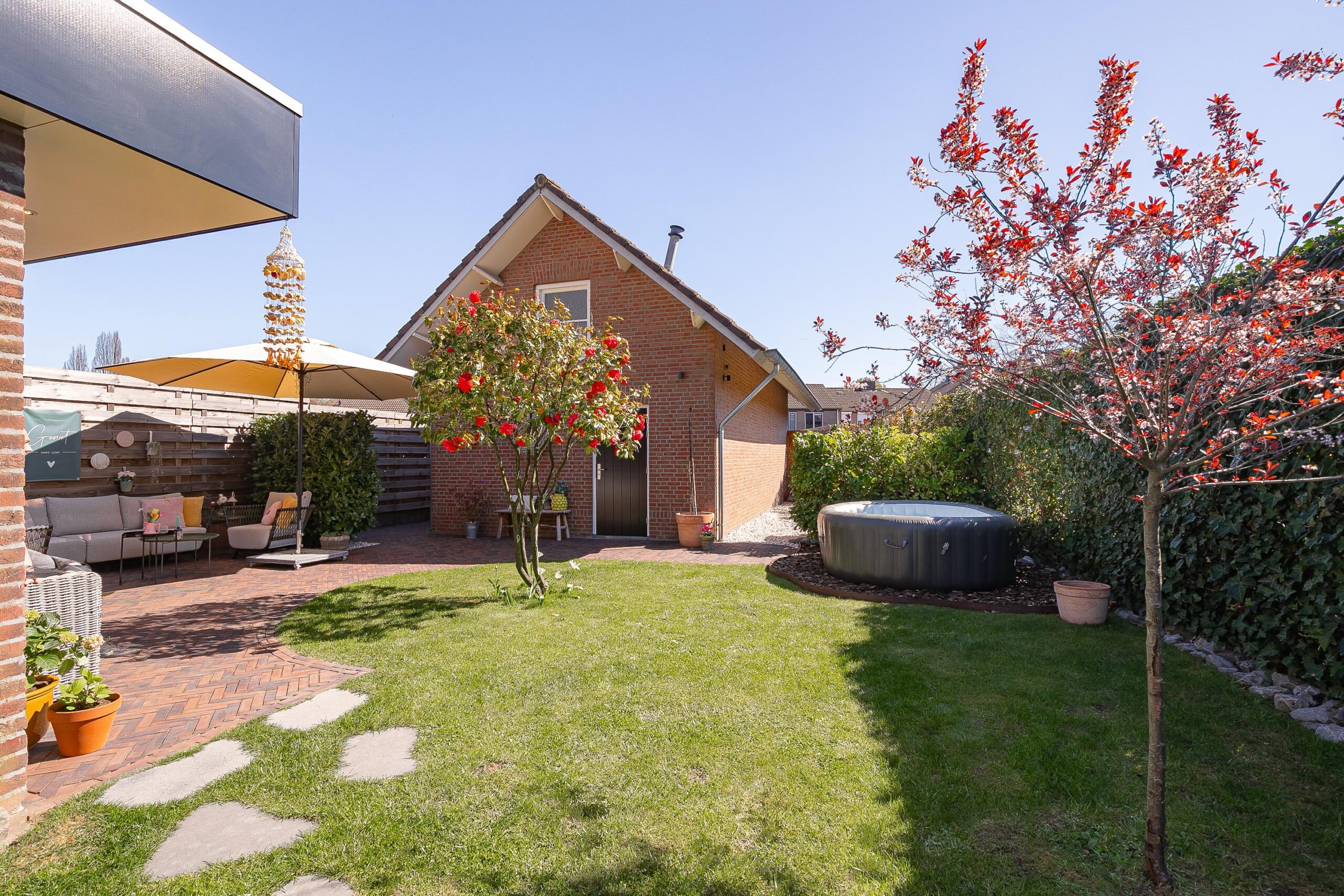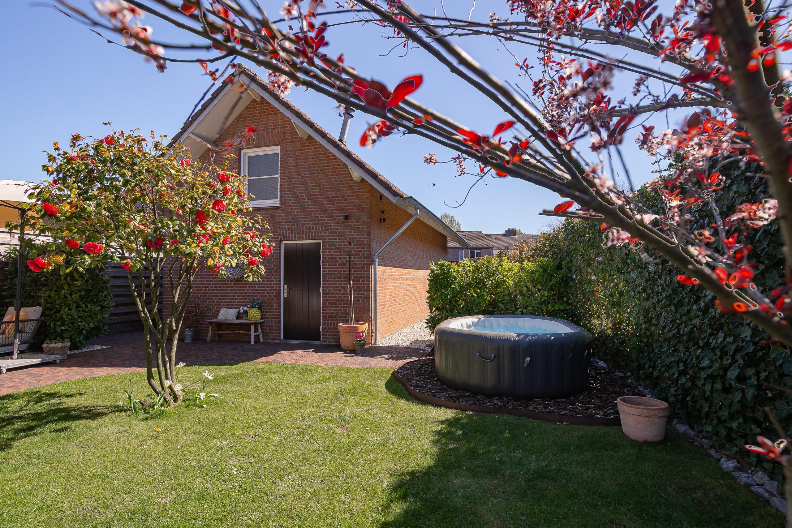Verder is de tuin voorzien van een ruim gazon, omheind middels schuttingen met groenhagen voor extra privacy. De tuin is zowel aan de voorzijde als achterzijde bereikbaar.