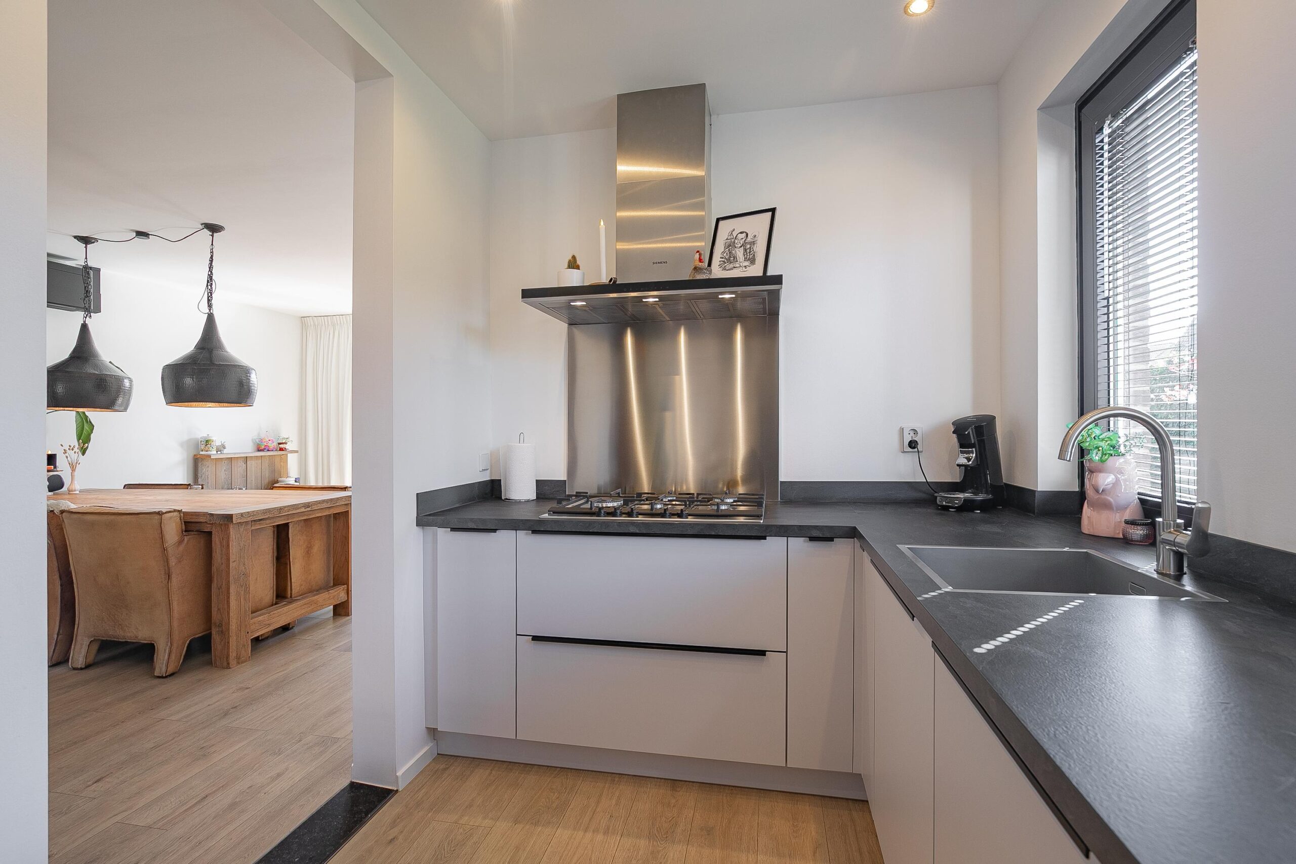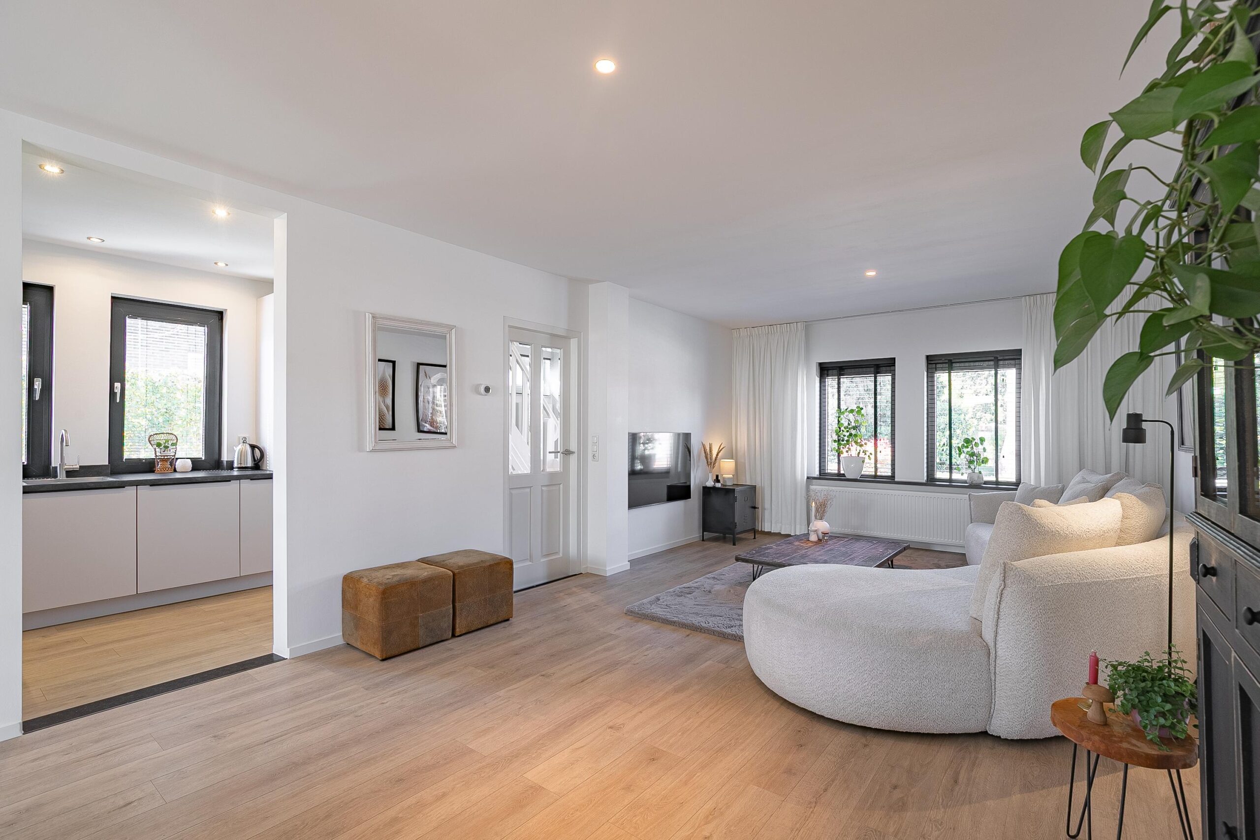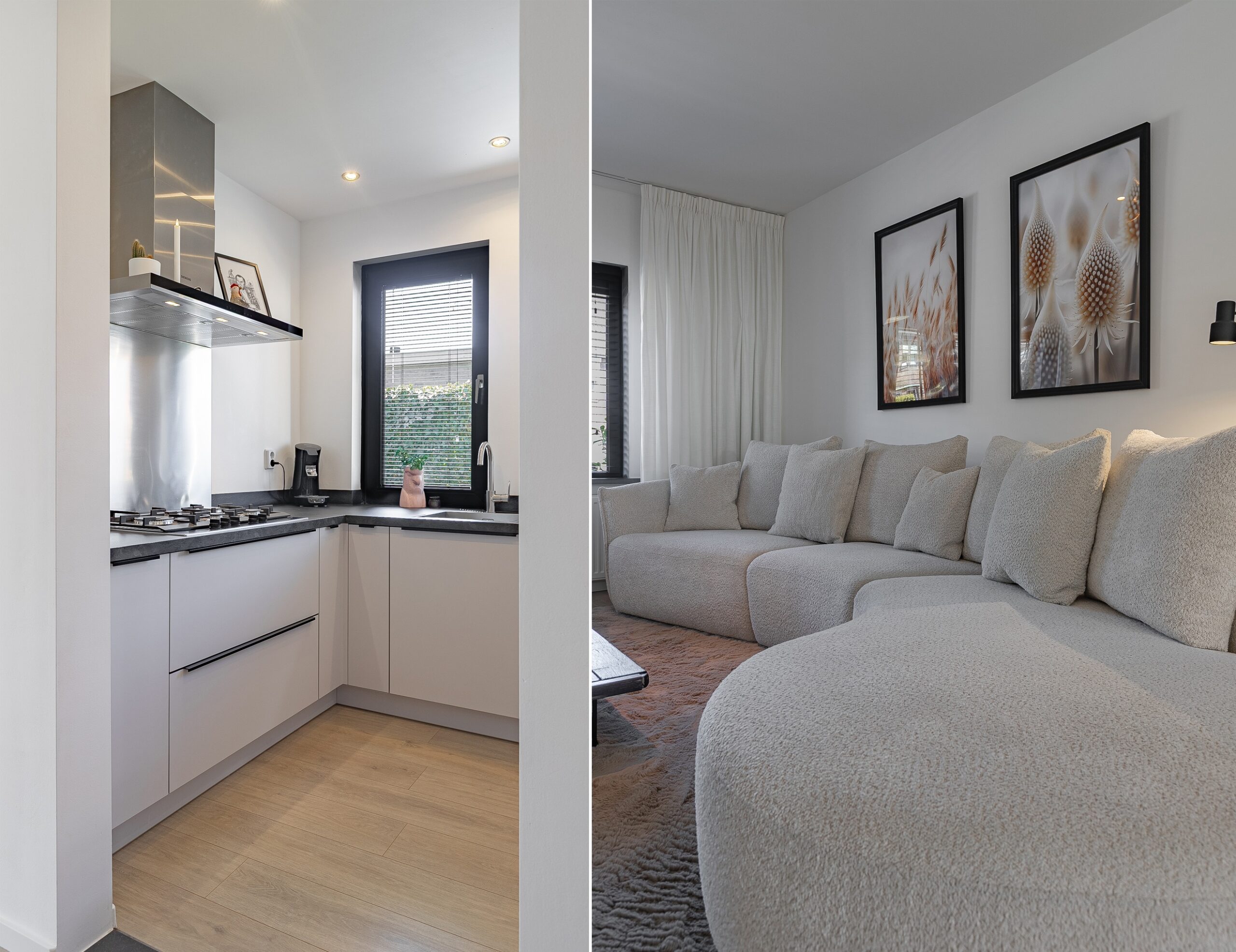 De woonkamer is zeer ruim van opzet doordat de woning is aangebouwd waardoor een woon- en eetkamer gecreerd is van 10.19m lang. De woonkamer geniet veel lichtinval en is voorzien van een kwalitatieve laminaatvloer. De eetkamer staat in verbinding met de half open keuken alwaar de moderne keuken is opgesteld. De keuken is voorzien van een L-vormige keuken met diverse kasten en de navolgende apparatuur: gaskookplaat, afzuigkap, vaatwasser, koelkast en oven. Naast de keuken is de bijkeuken c.q. wasruimte gelegen. Hier zijn diverse aansluitingen voor wasapparatuur en kan gebruikt worden als bijkeuken.
