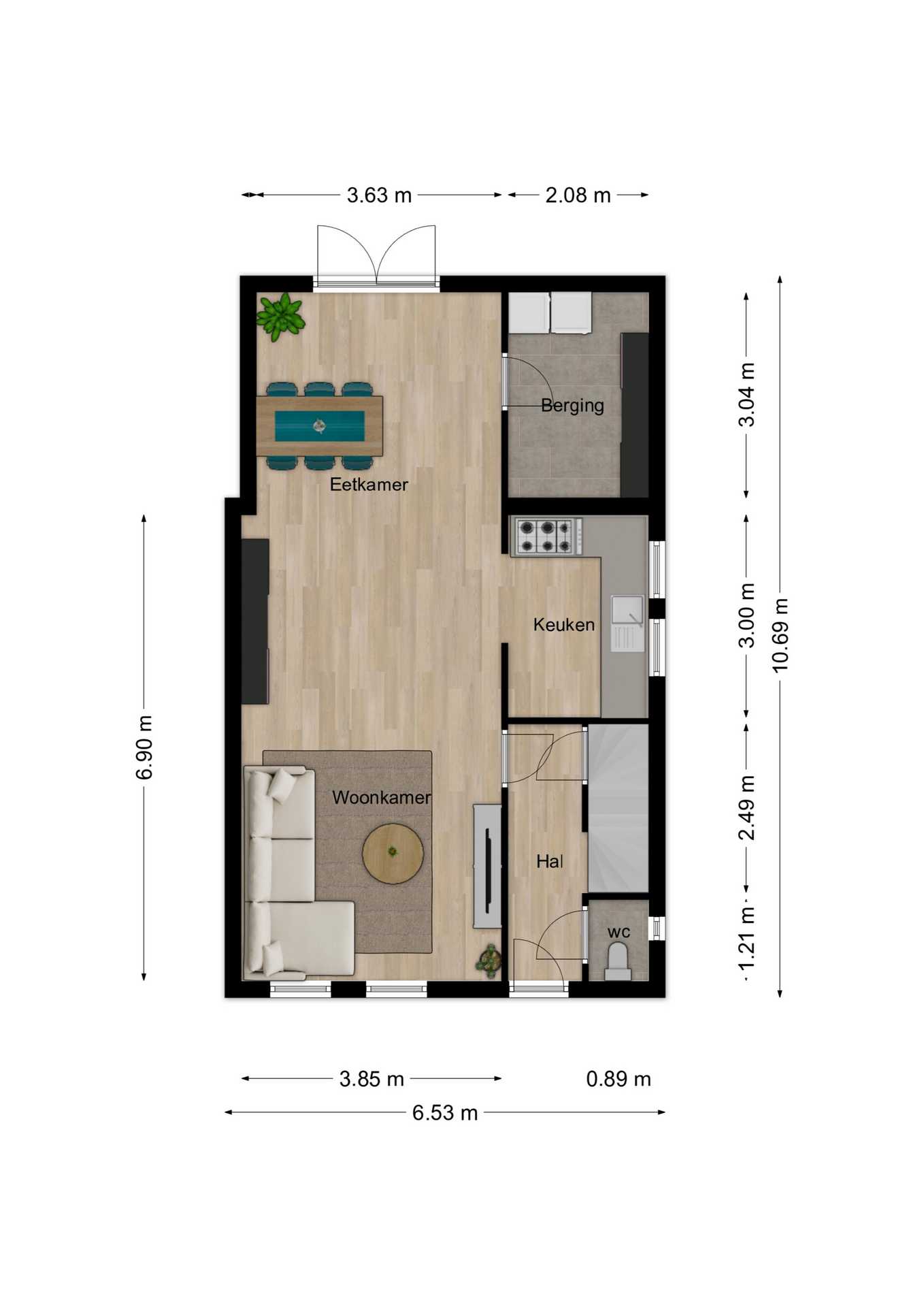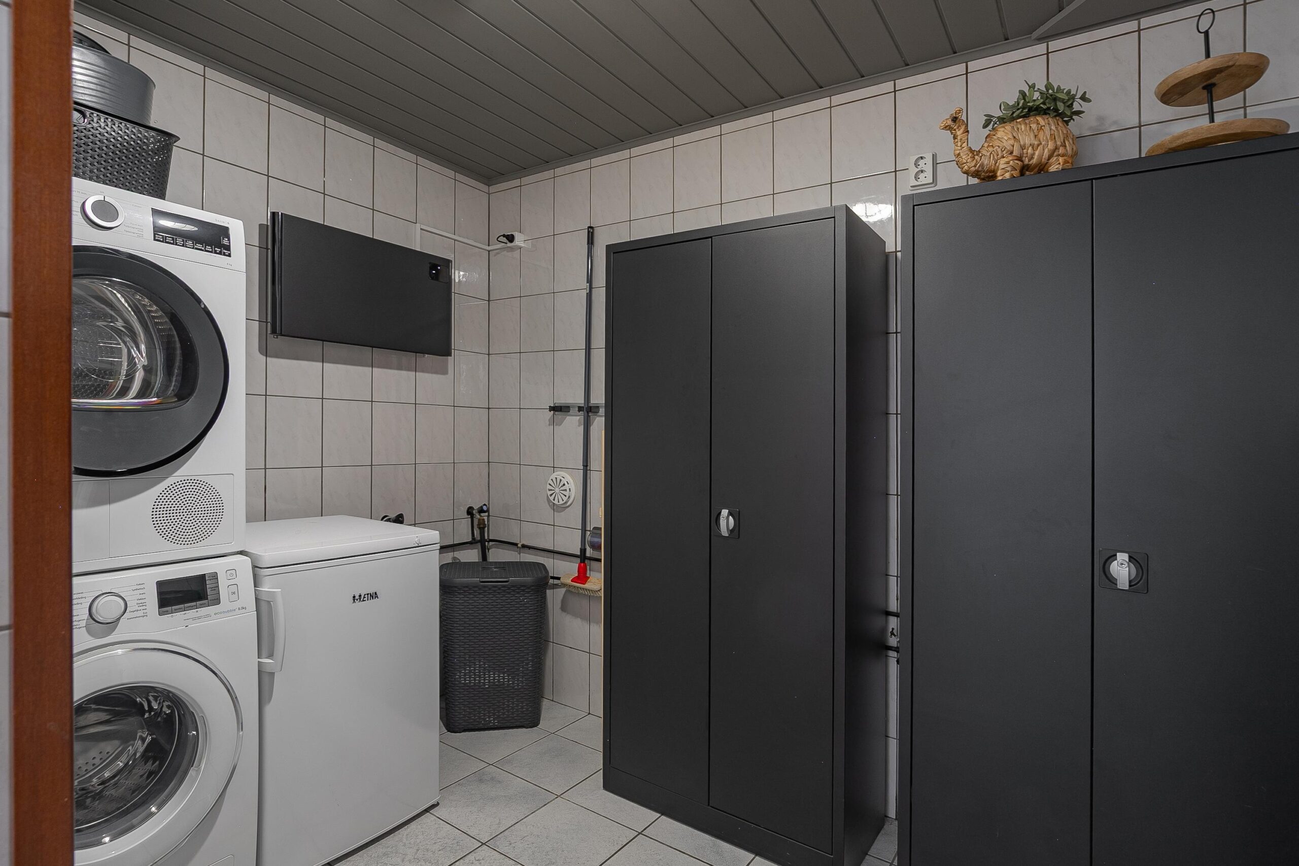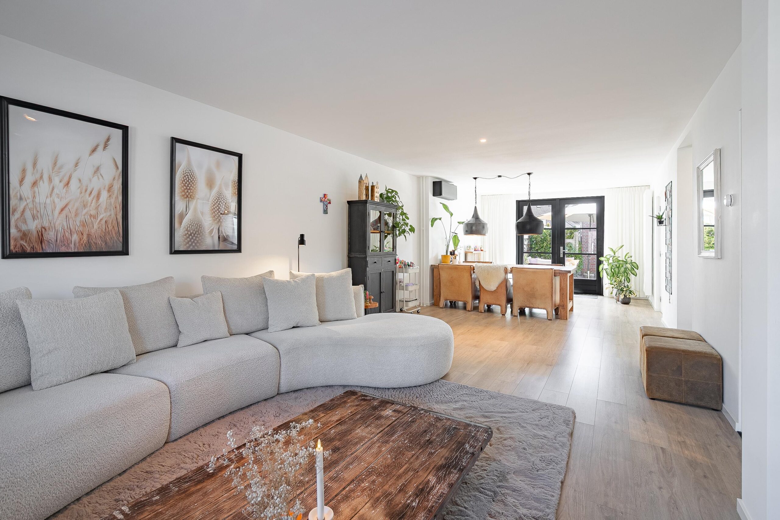 De woonkamer is zeer ruim van opzet doordat de woning is aangebouwd waardoor een woon- en eetkamer gecreerd is van 10.19m lang. De woonkamer geniet veel lichtinval en is voorzien van een kwalitatieve laminaatvloer. De eetkamer staat in verbinding met de half open keuken alwaar de moderne keuken is opgesteld. De keuken is voorzien van een L-vormige keuken met diverse kasten en de navolgende apparatuur: gaskookplaat, afzuigkap, vaatwasser, koelkast en oven. Naast de keuken is de bijkeuken c.q. wasruimte gelegen. Hier zijn diverse aansluitingen voor wasapparatuur en kan gebruikt worden als bijkeuken.