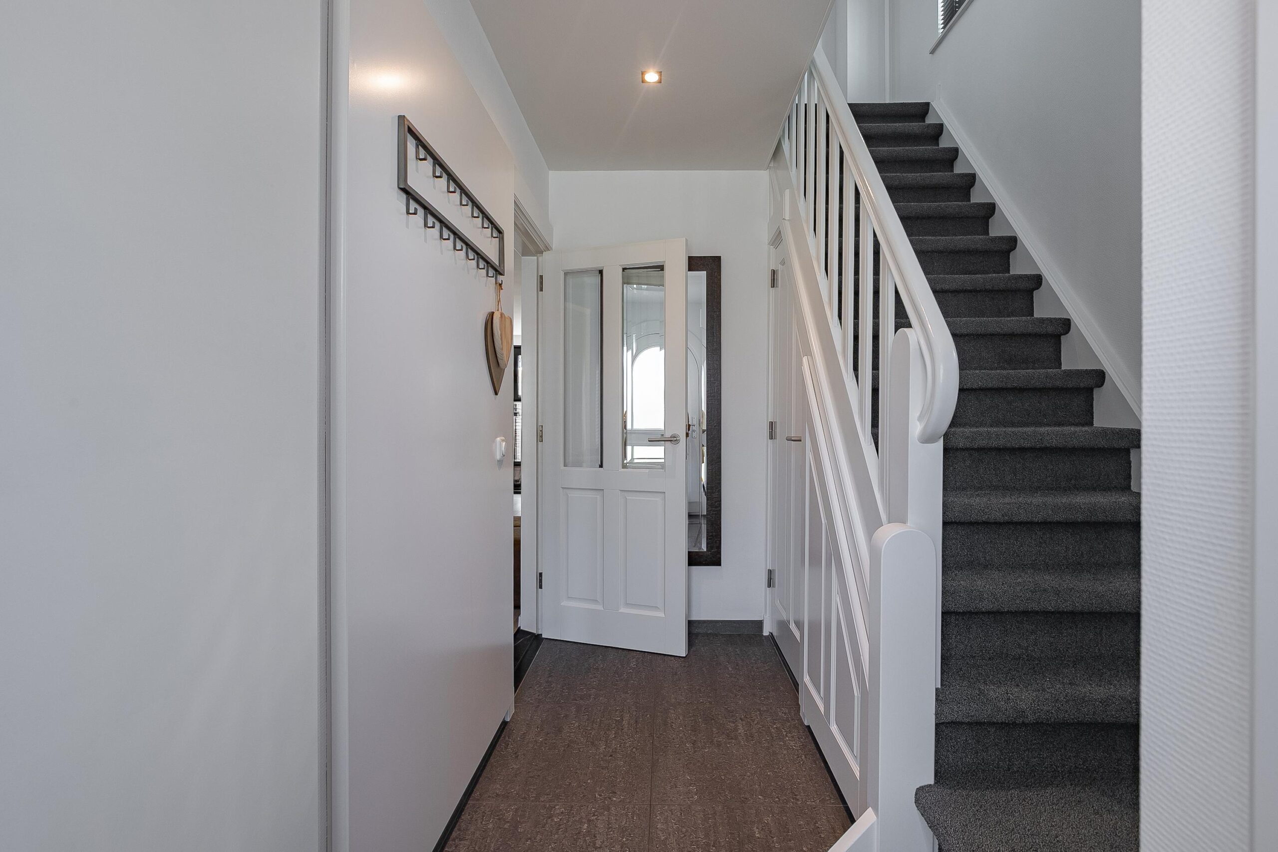 Onderhoudsvriendelijke voortuin met trap naar de entree. Hal met meterkast, betegelde toiletruime met zwevend toilet en toegang naar de woonkamer.