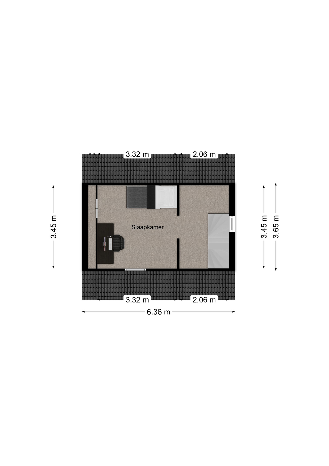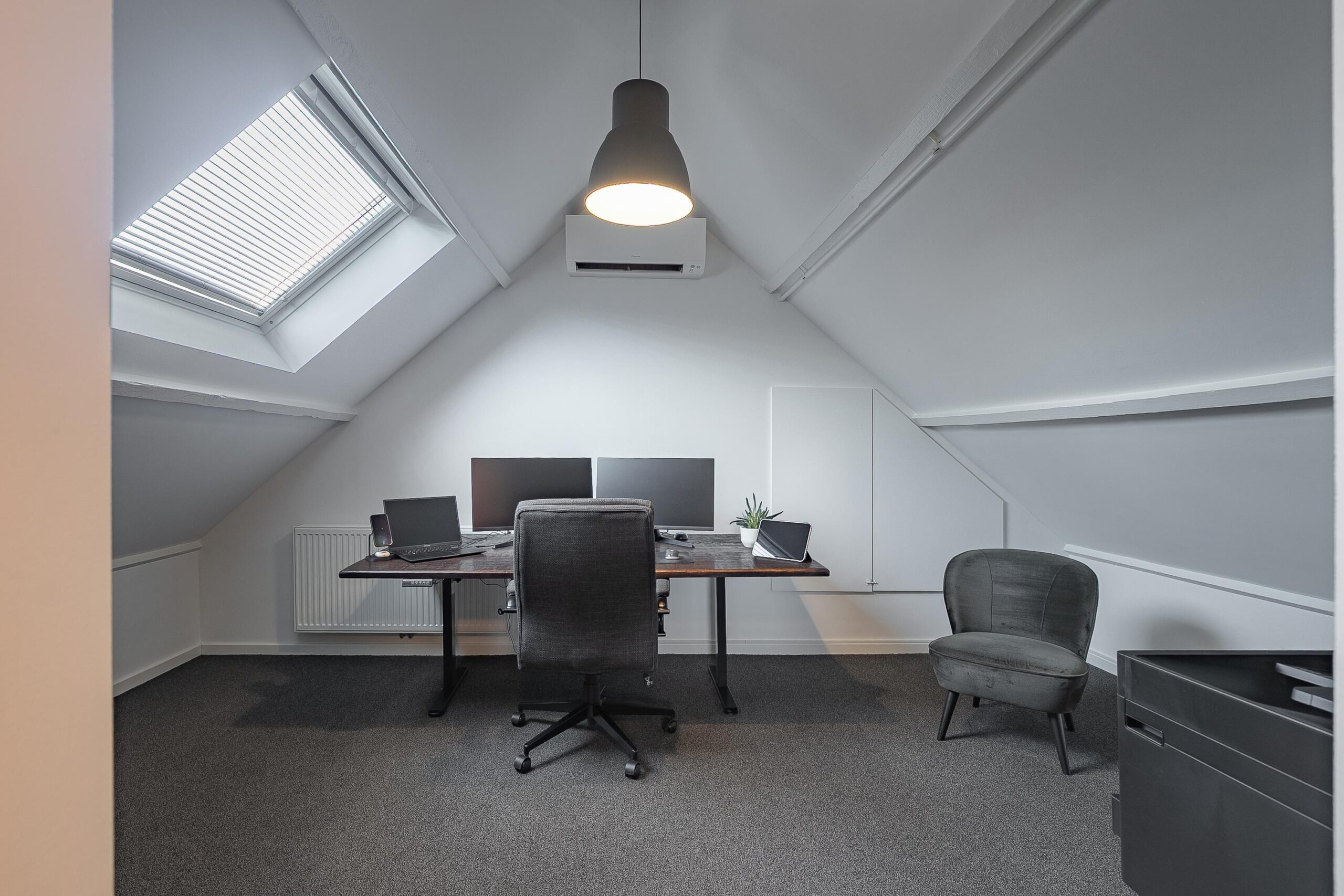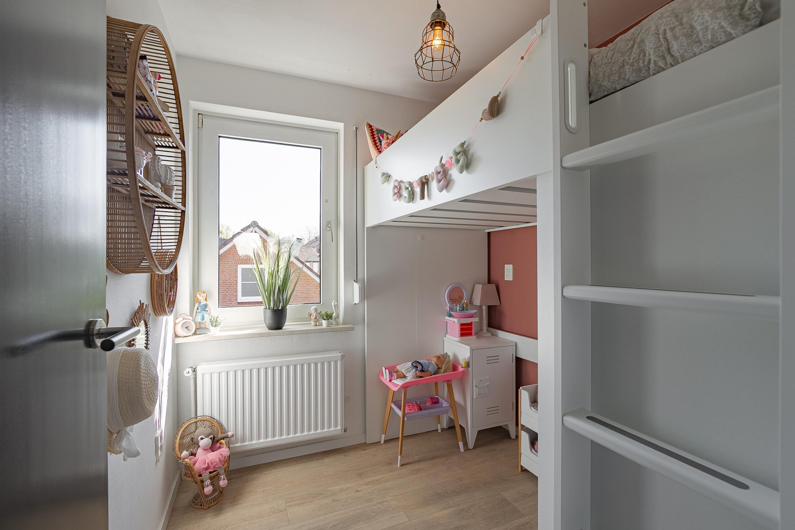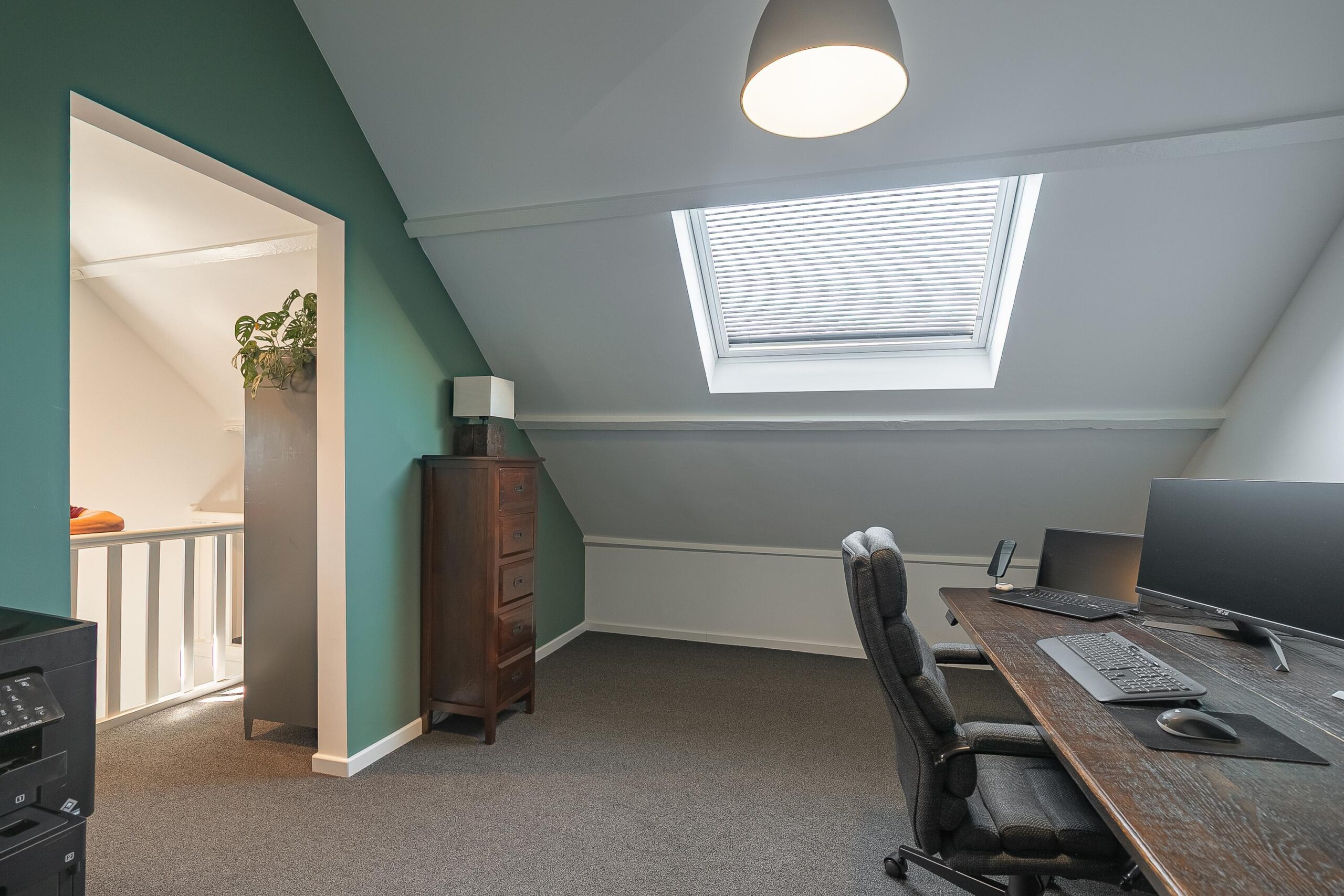 Hier is de vierde slaapkamer gesitueerd, voorzien van vloerbedekking en een groot Velux dakraam. De overloop biedt de mogelijkheid voor extra opslag.