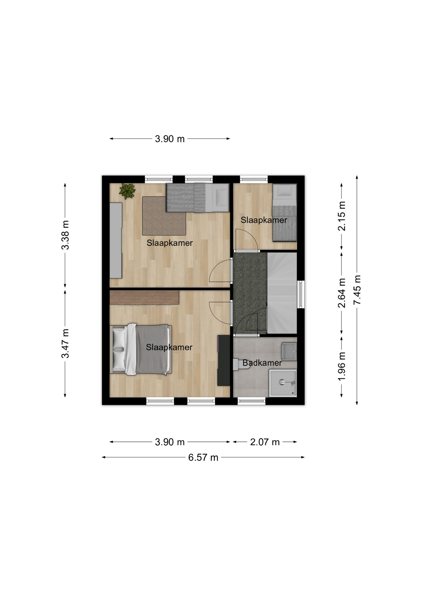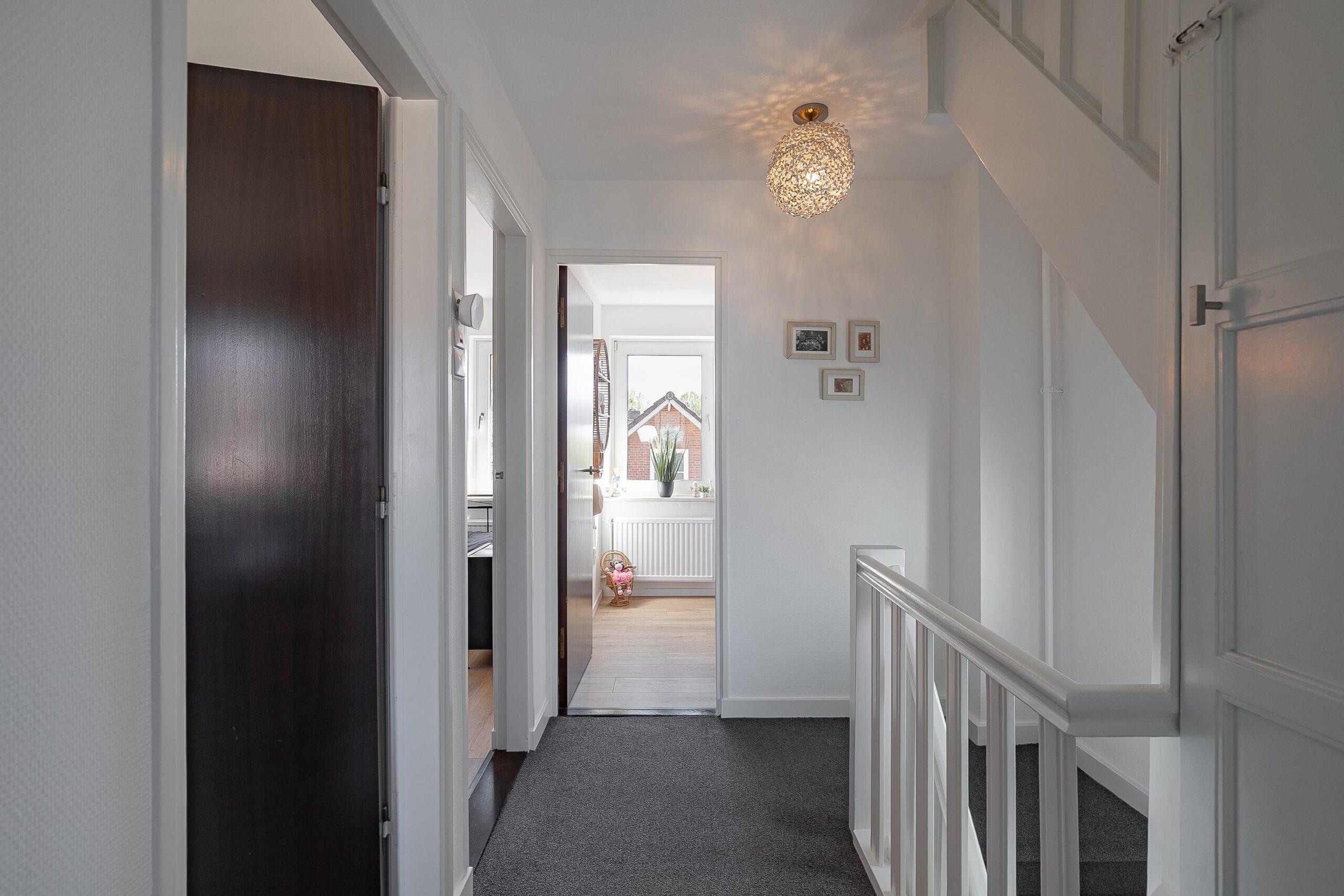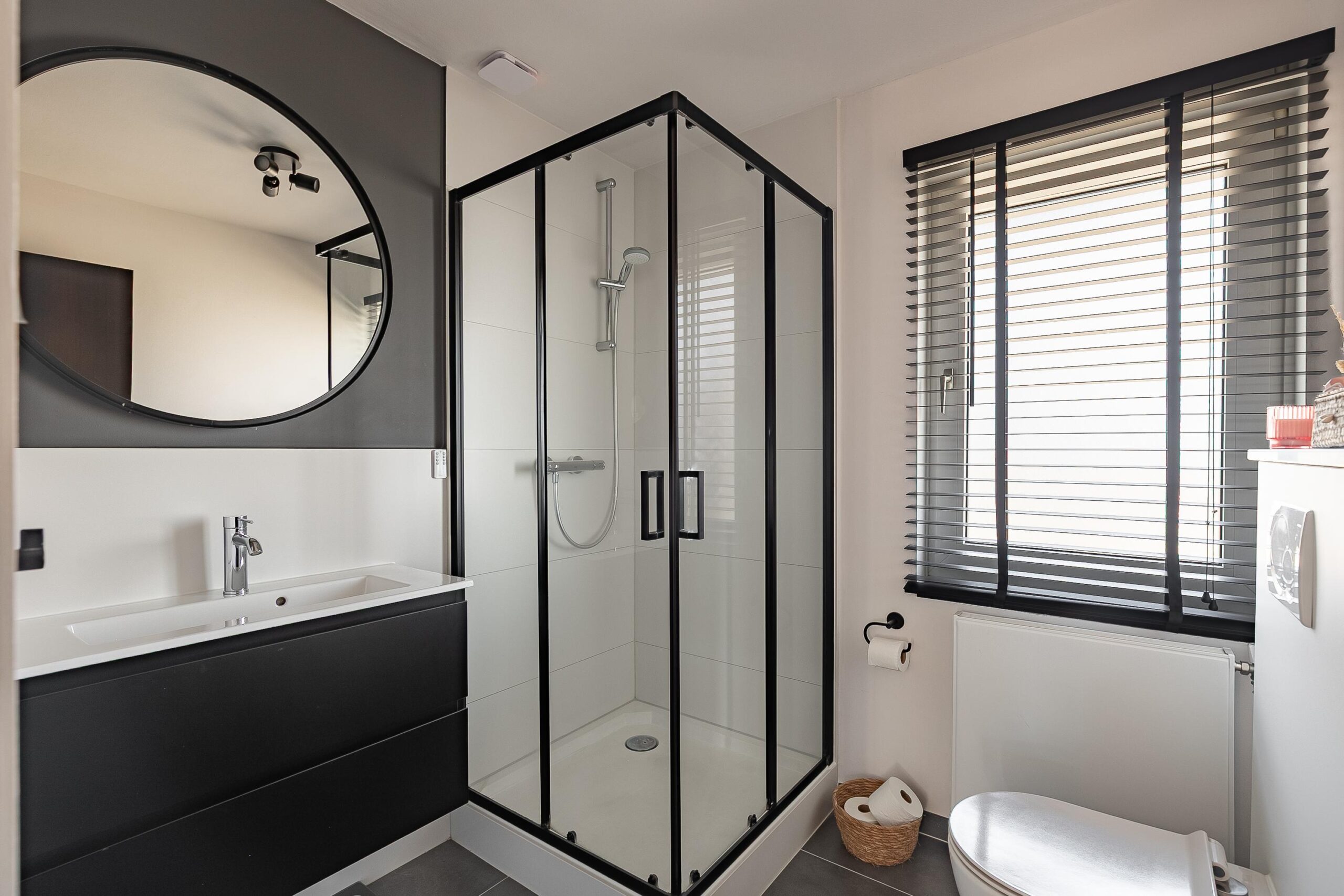 Overloop met toegang naar drie slaapkamers die prima zijn afgewerkt met een laminaatvloer. De moderne badkamer is voorzien van een douchecabine met glazen wanden, wastafel met meubel en zwevend toilet.