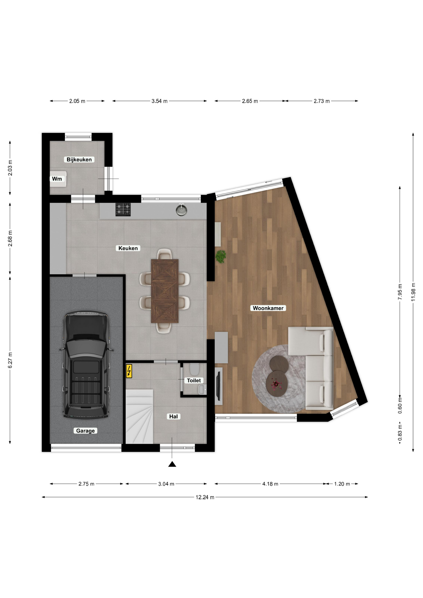 De hal, leefkeuken, bijkeuken en het toilet zijn voorzien van een moderne antracietkleurige plavuizenvloer met vloerverwarming.