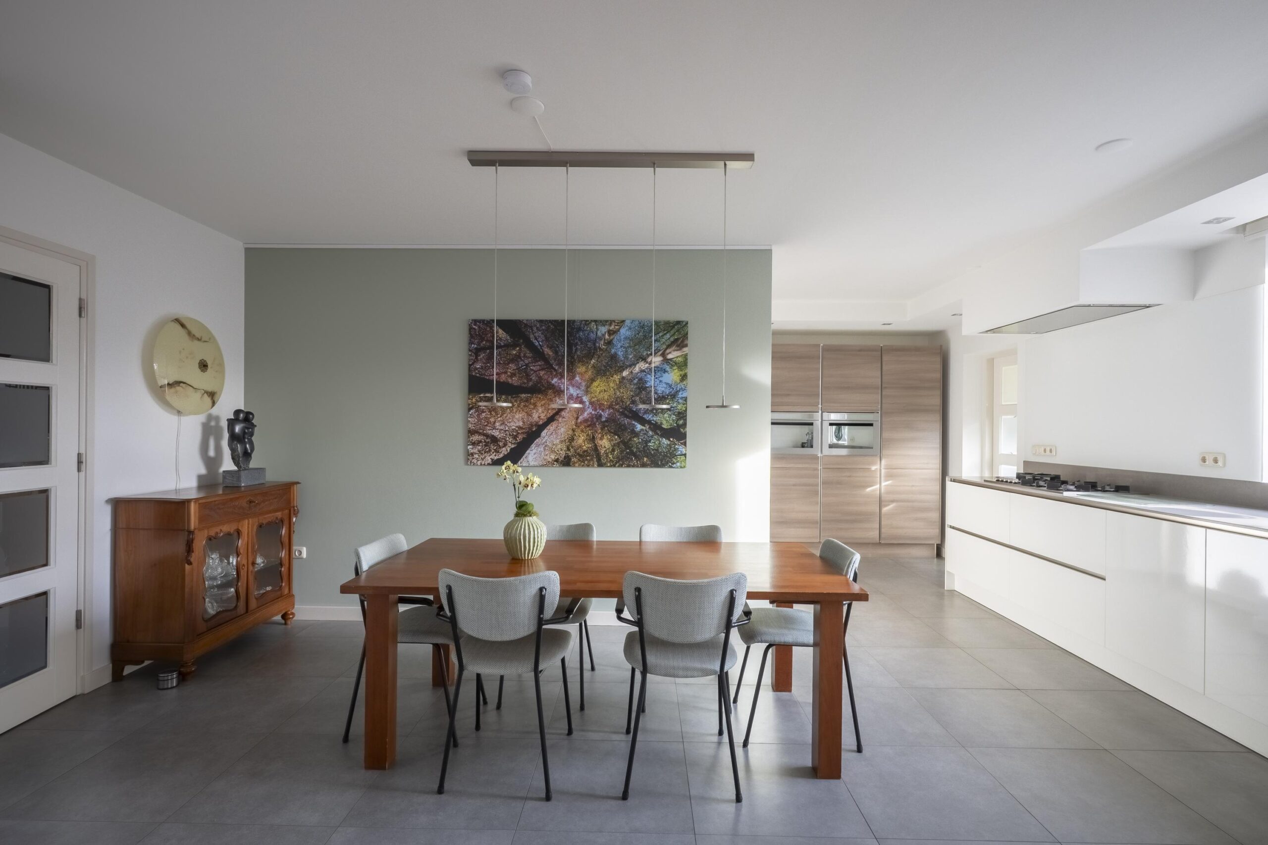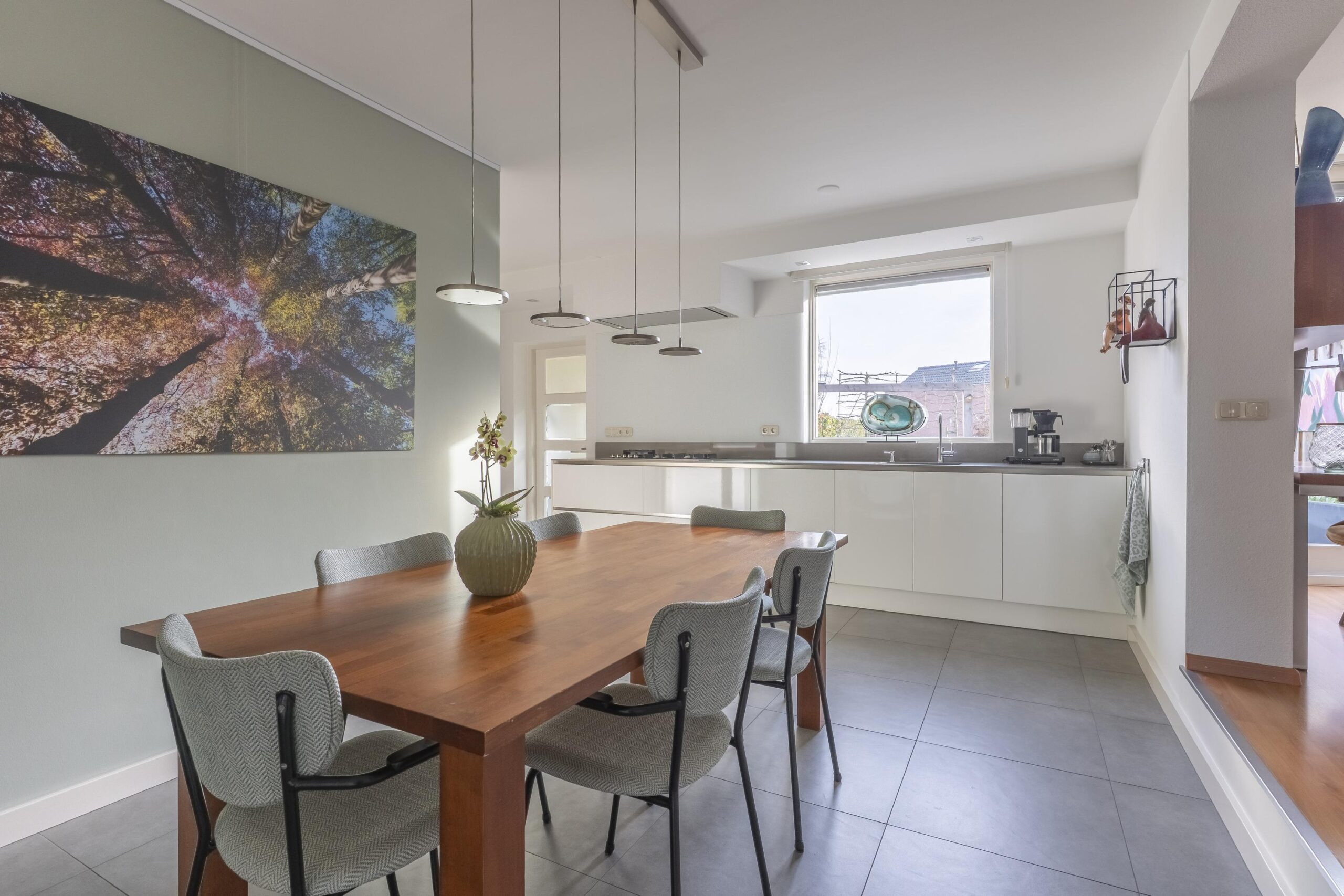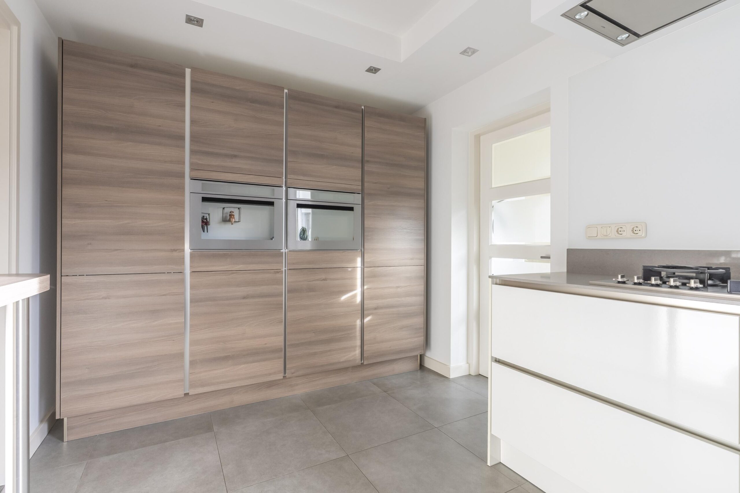 De royale leefkeuken is voorzien van een moderne, luxe greeploze keukeninstallatie met composiet aanrechtblad. De keuken beschikt over diverse hoogwaardige inbouwapparatuur, waaronder een vaatwasser, 5-pits gaskookplaat, RVS plafondafzuigkap, een fraaie apparatenwand met combi-stoomoven en combimagnetron, en een grote koelkast met vershoudlades. Vanuit de keuken heeft u een fraai uitzicht op de tuin.