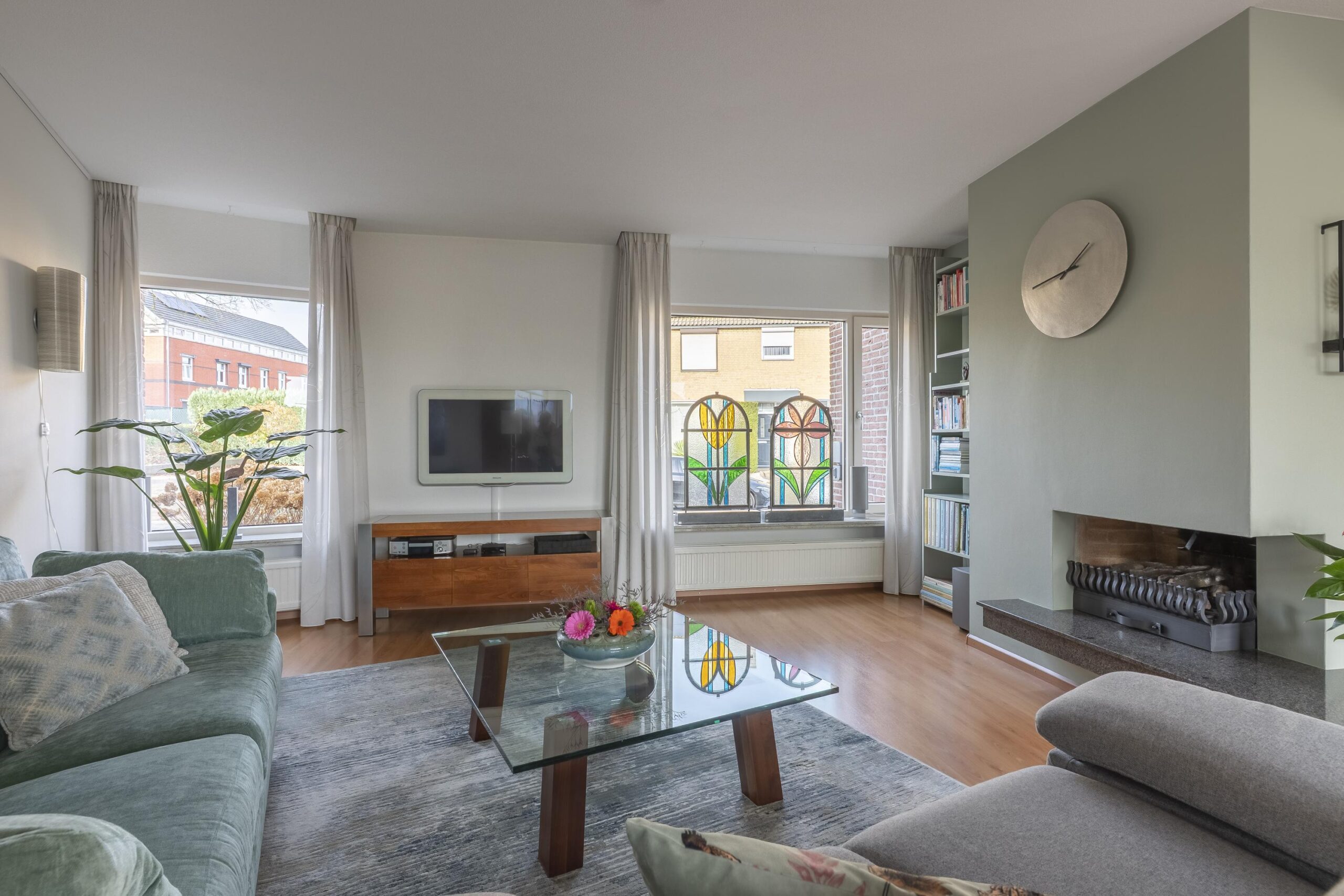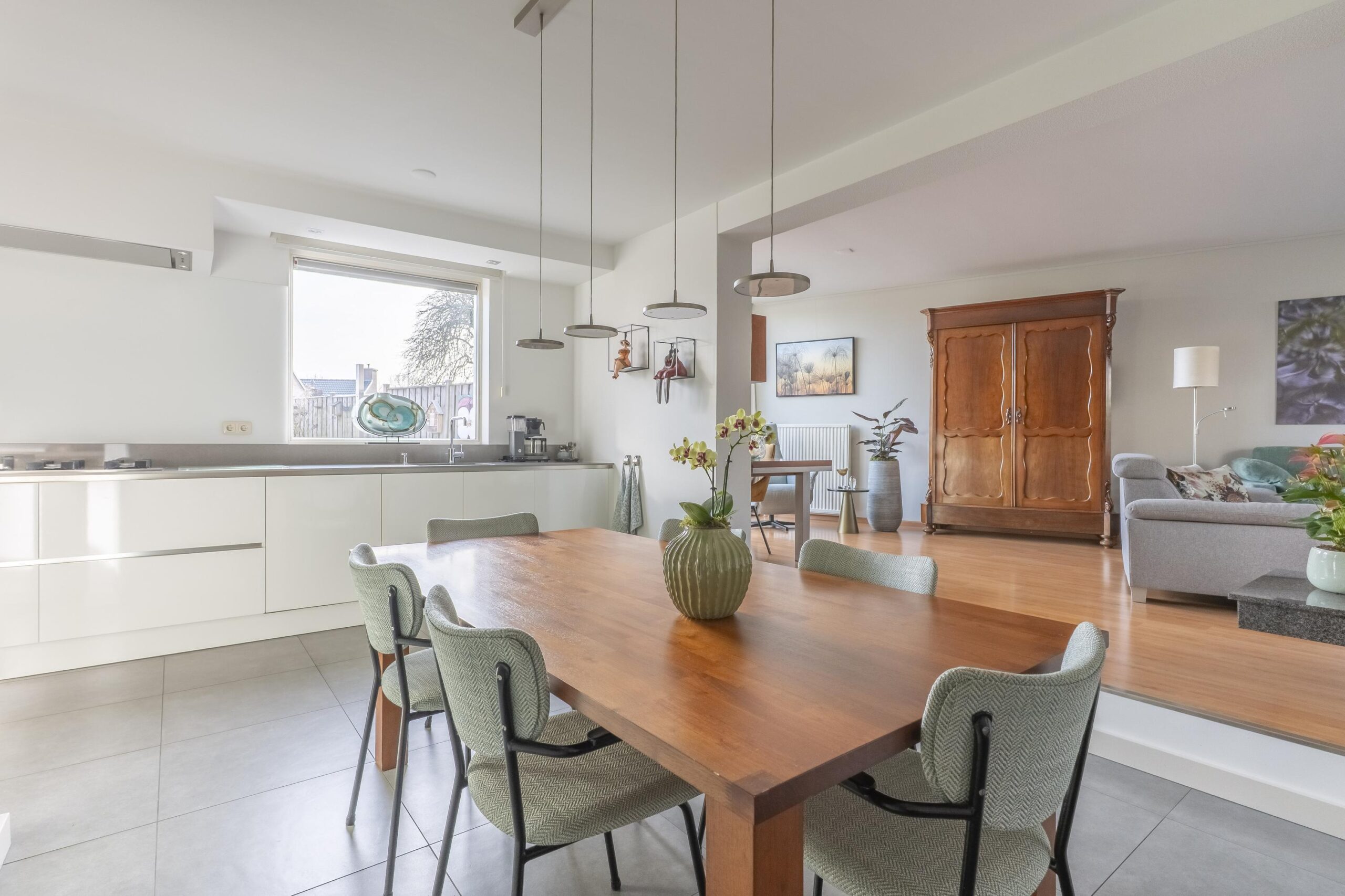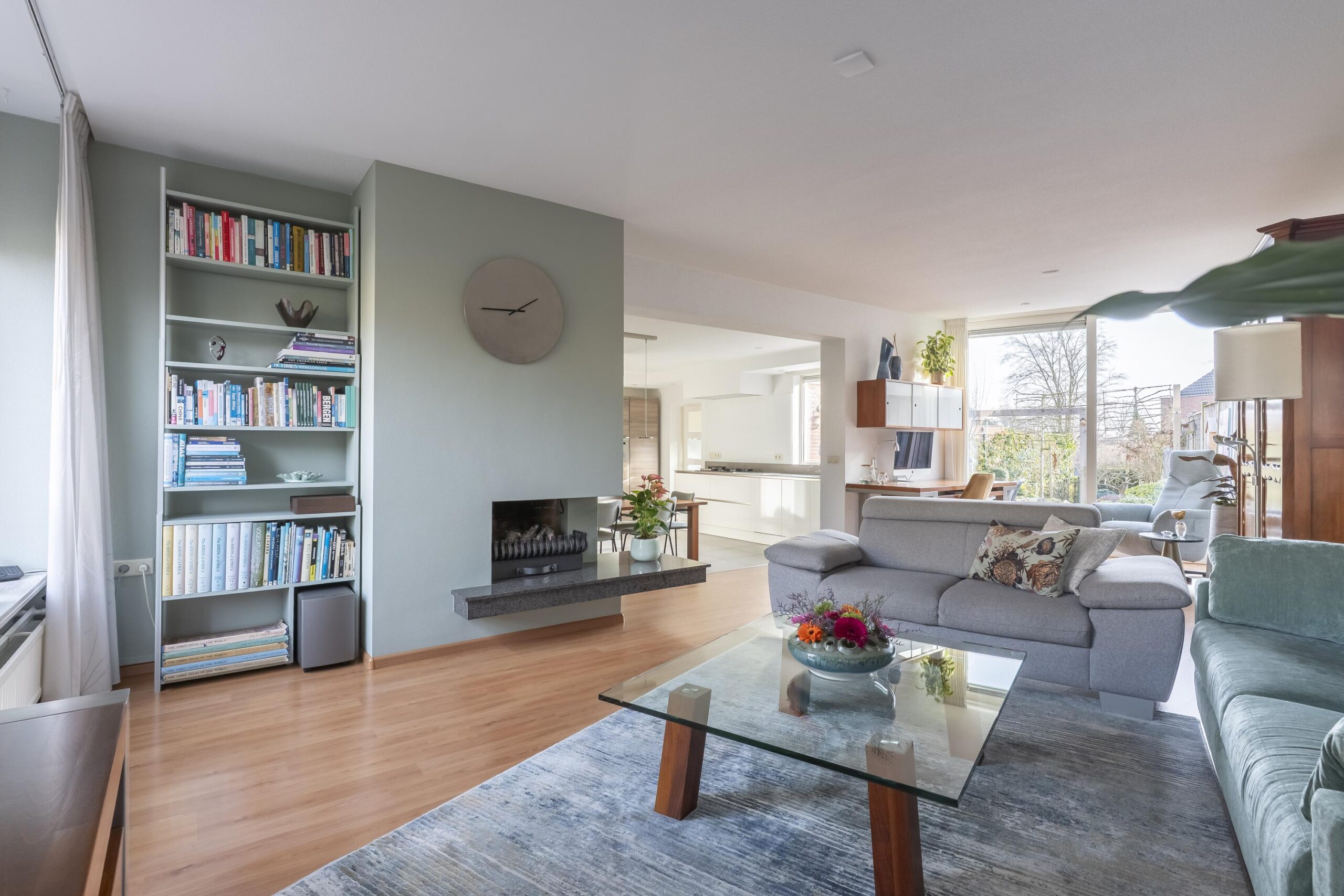 De speelse living is bereikbaar via een niveauverschil en beschikt over een open gashaard, een royale schuifpui en hoge raampartijen die zorgen voor een prachtige lichtinval en directe tuinverbinding.