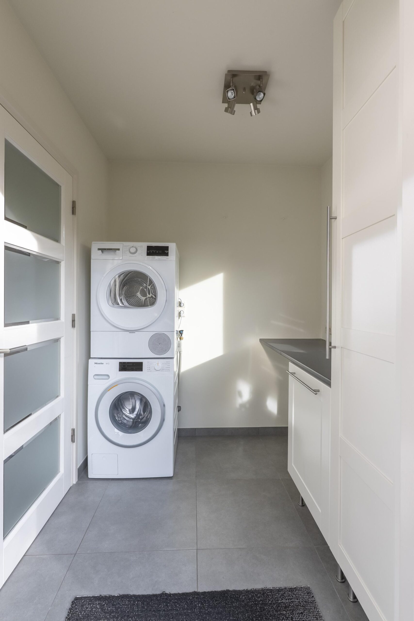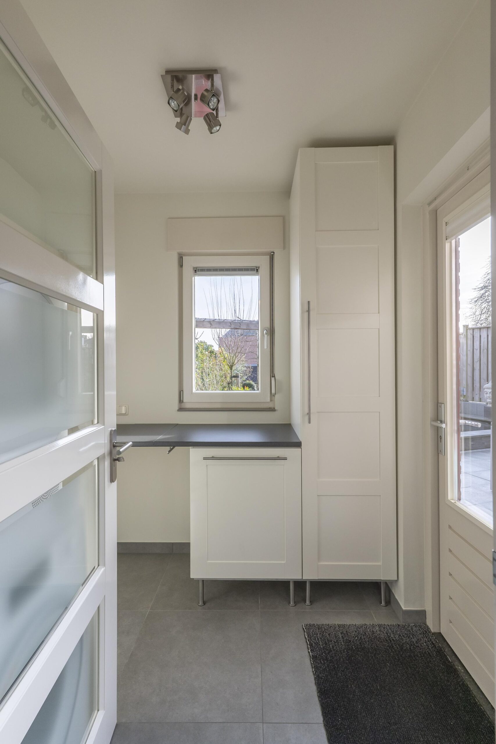 De goed afgewerkte bijkeuken beschikt over aansluitingen voor wasmachine en droger.