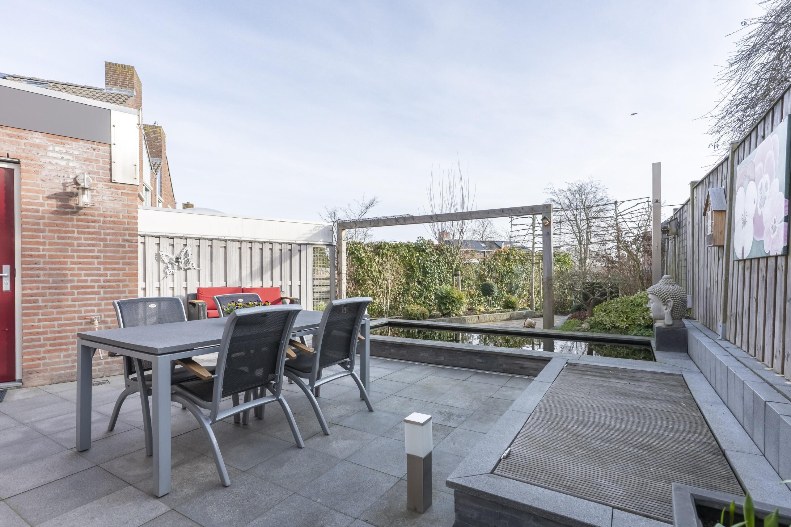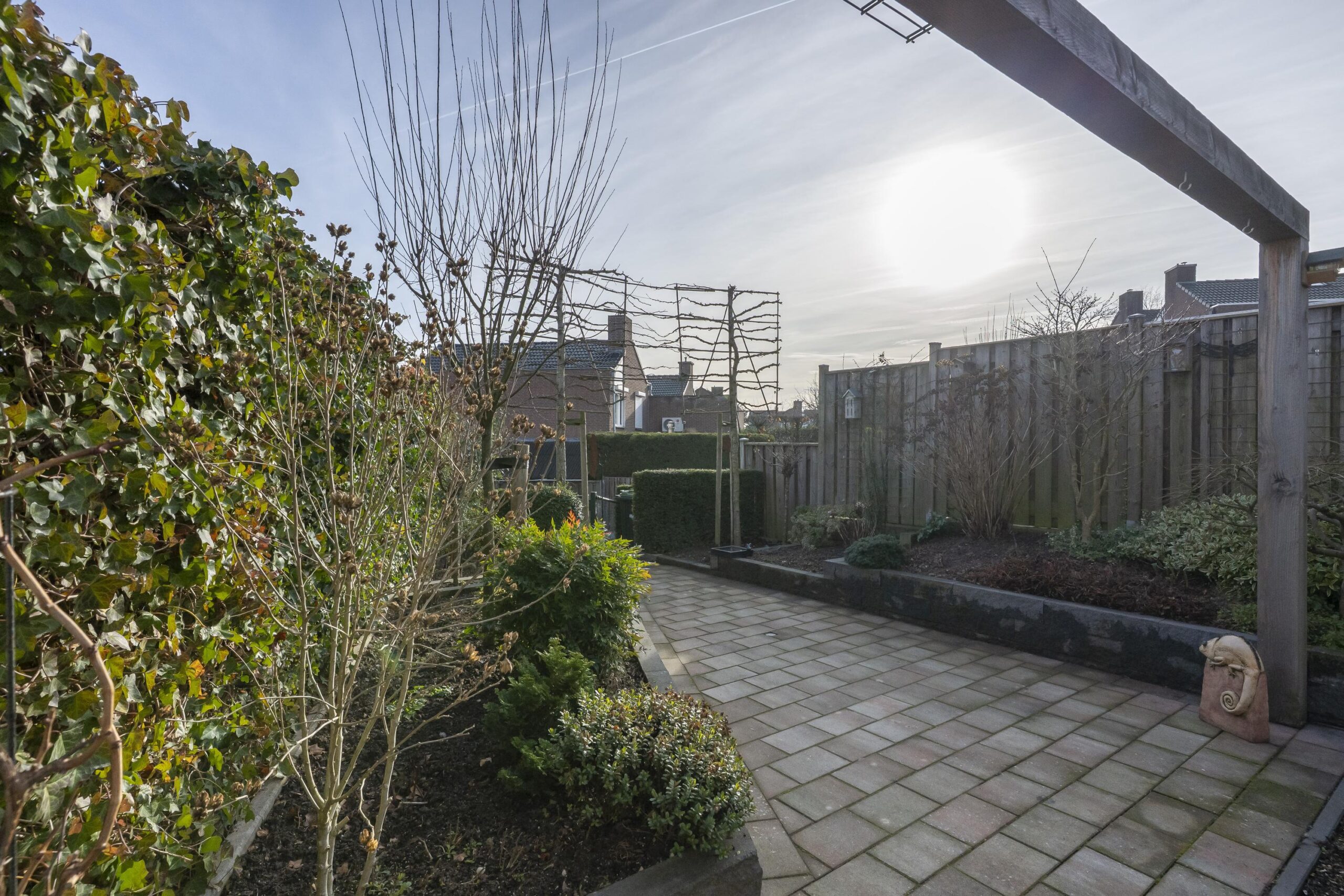 De zonnige, onder architectuur aangelegde tuin is bereikbaar via de bijkeuken, de living en een achterom. De tuin beschikt over diverse borders, een professionele koivijver met uitgebreide filterinstallatie en biedt veel privacy. Tevens is er een fraaie RVS-constructie aanwezig voor het monteren van een schaduwdoek (foto’s in zomer genomen met schaduwdoek).