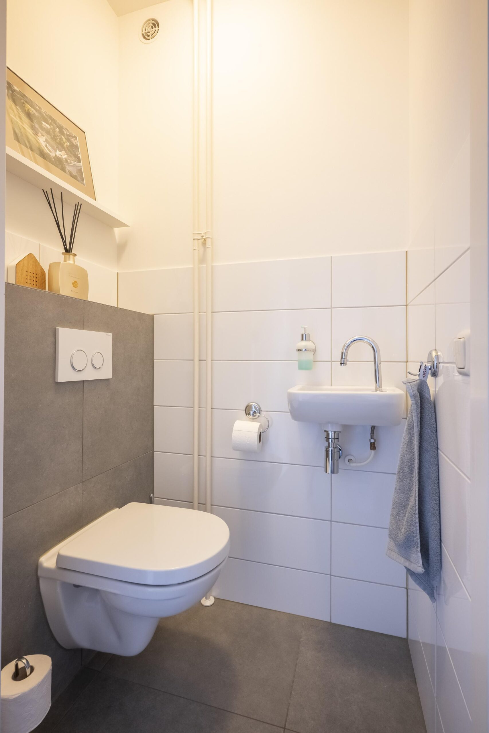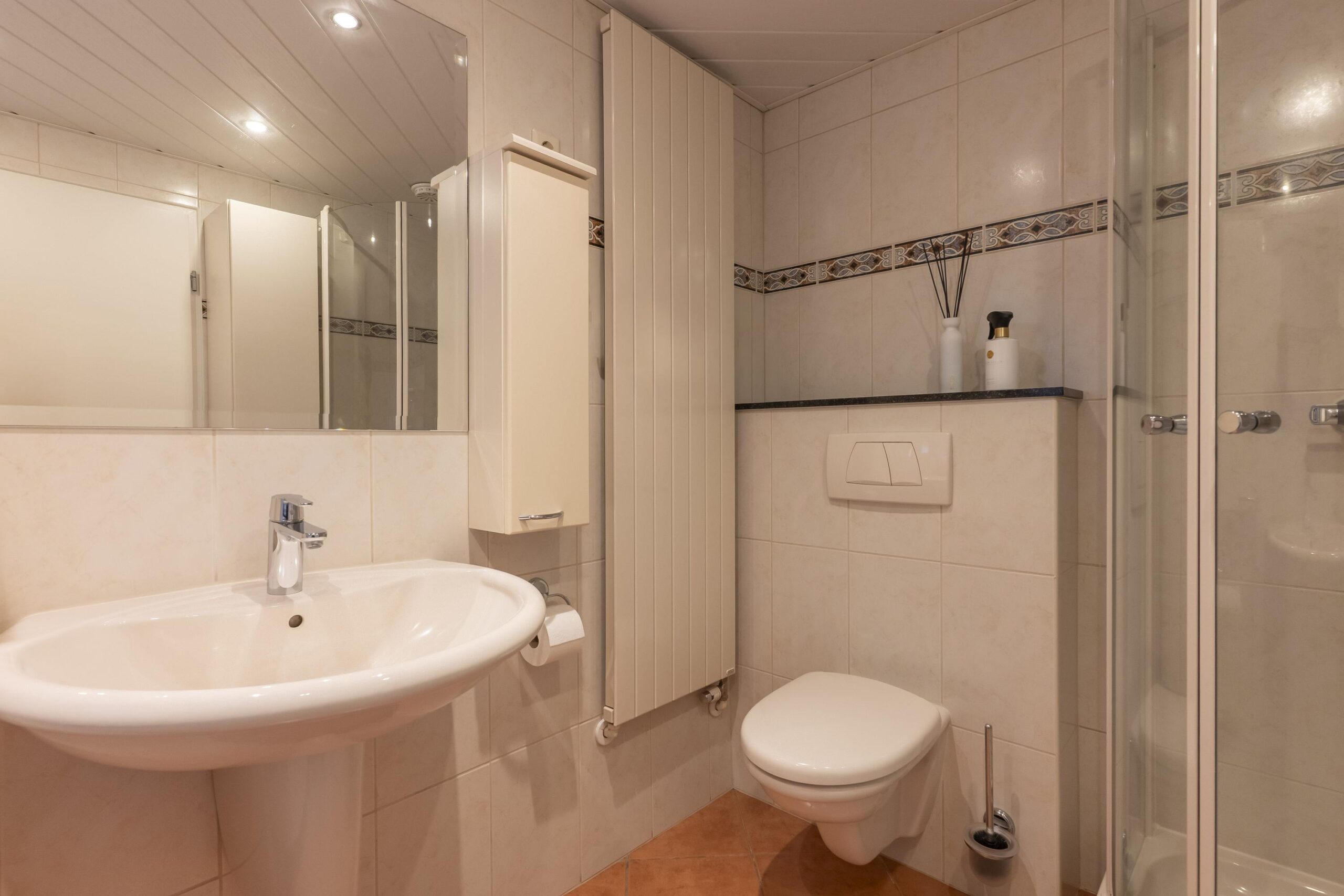 De volledig betegelde badkamer is uitgerust met een tweede vrijhangend toilet, een halfronde douche, wastafel en een duo-ligbad.