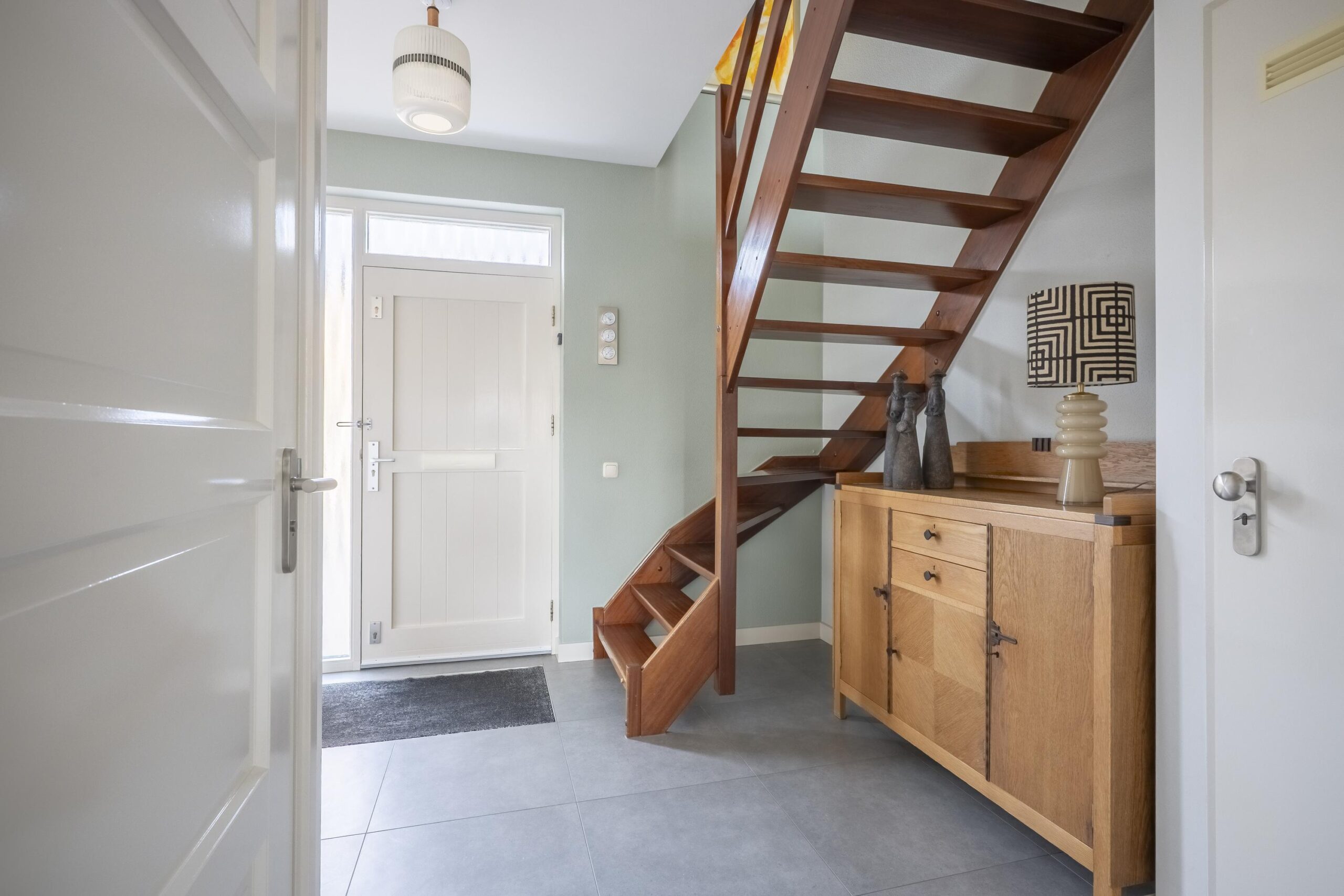 Via de dubbele oprit en fraai aangelegde voortuin bereikt u de ruime entree/hal met open hardhouten trap. In de hal bevinden zich een modern, betegeld vrijhangend toilet met fontein en een vernieuwde meterkast.