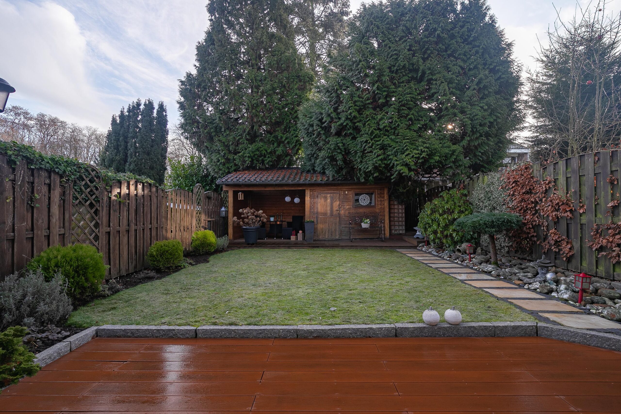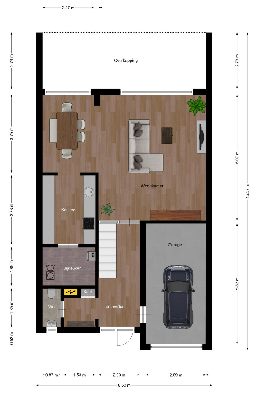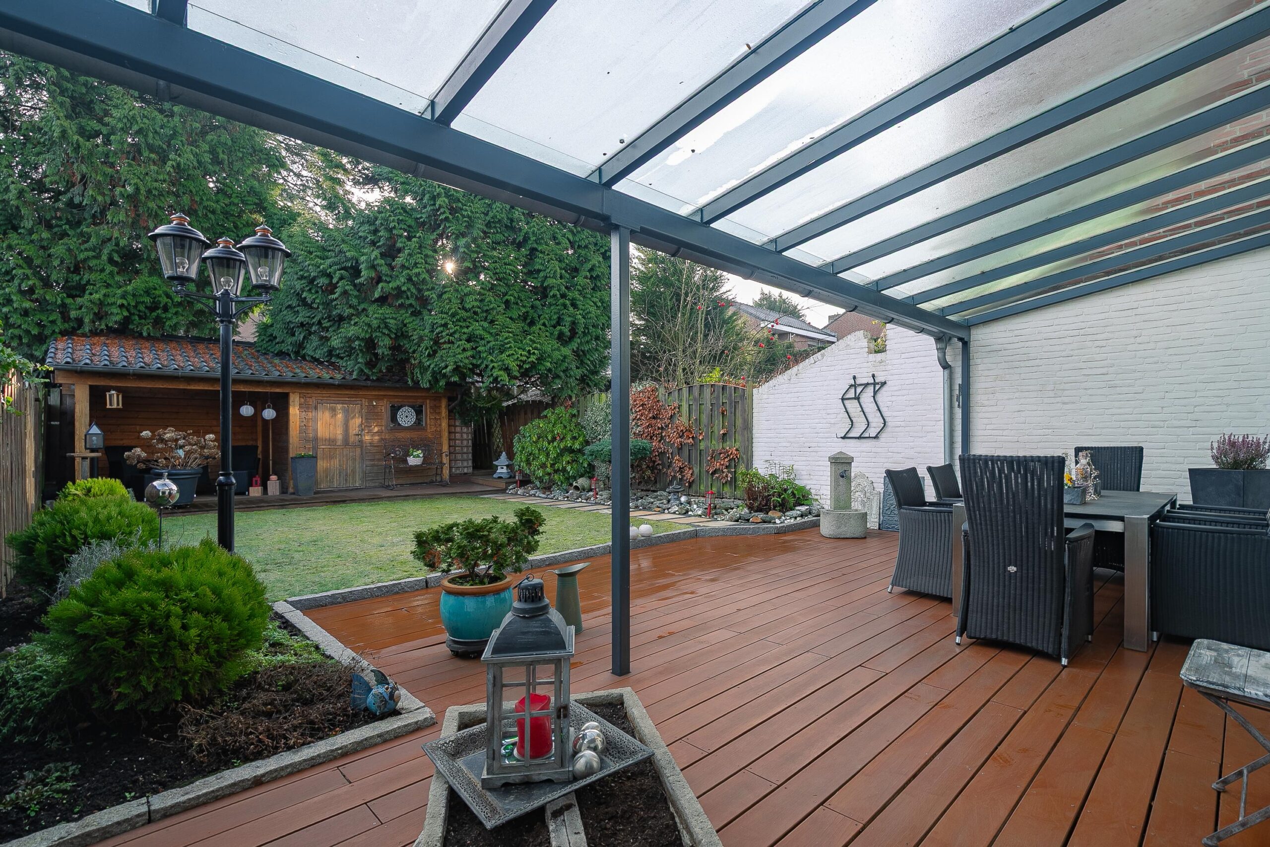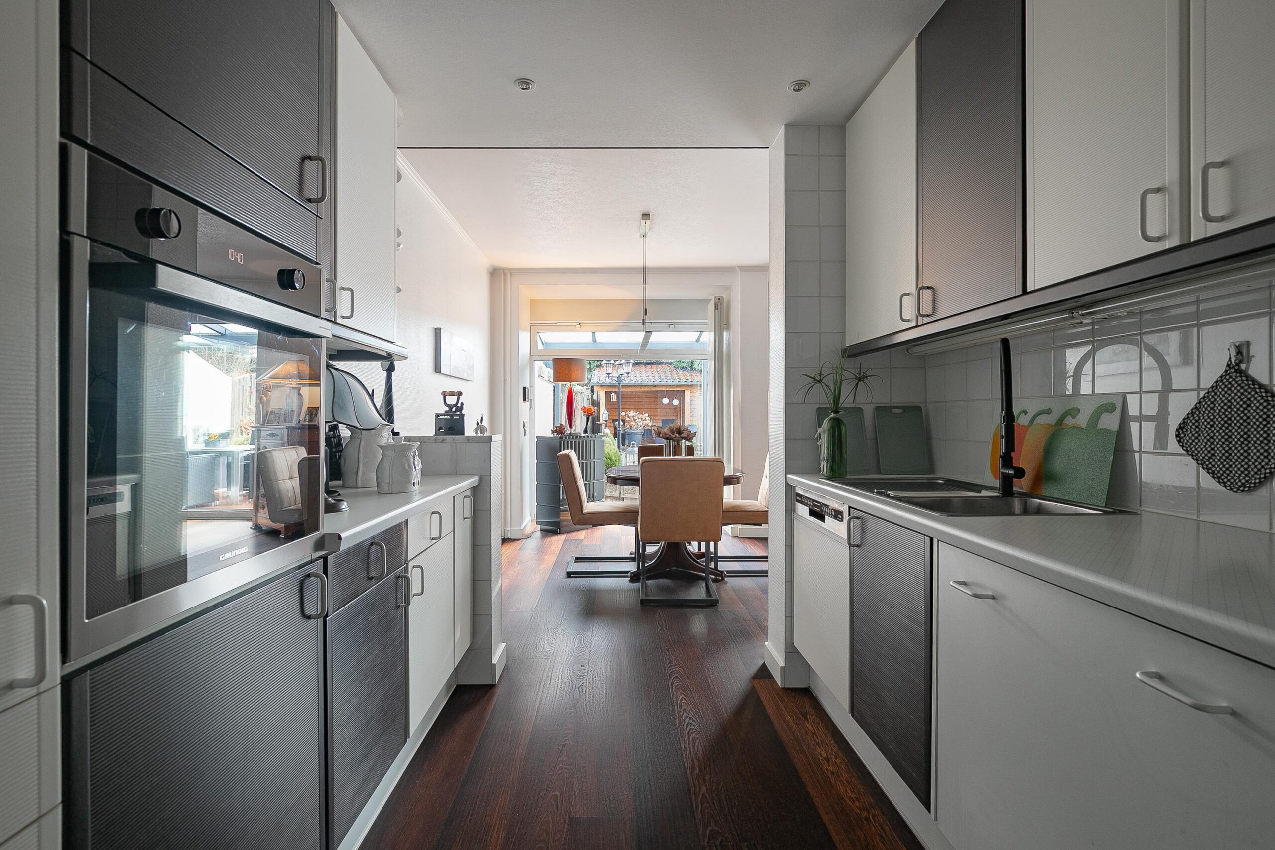 Begane grond: oprit, entree, ruime hal met open trappenhuis. tevens is hier het betegelde en zwevende toilet gelegen met fonteintje, een garderobe- en moderne meterkast en is de garage inpandig toegankelijk. -De woonkamer bestaande uit een zit- en eetgedeelte heeft veel lichtinval en een open keuken met apparatuur waaronder een keramische kookplaat, vaatwasser, oven, koel-, vriescombinatie en afzuigkap. Sommige apparaten zijn pas vernieuwd. De bijkeuken is aansluitend gelegen en biedt plaats voor voorraad en heeft een wasmachine- en drogeraansluiting en C.V.-opstelling. Middels schuifpui is de op het zonnige Zuiden gelegen tuin bereikbaar met overkapping, terras, gazon en een houten tuinhuis met loungehoek. Tevens is de tuin via een achterom gelegen pad bereikbaar.