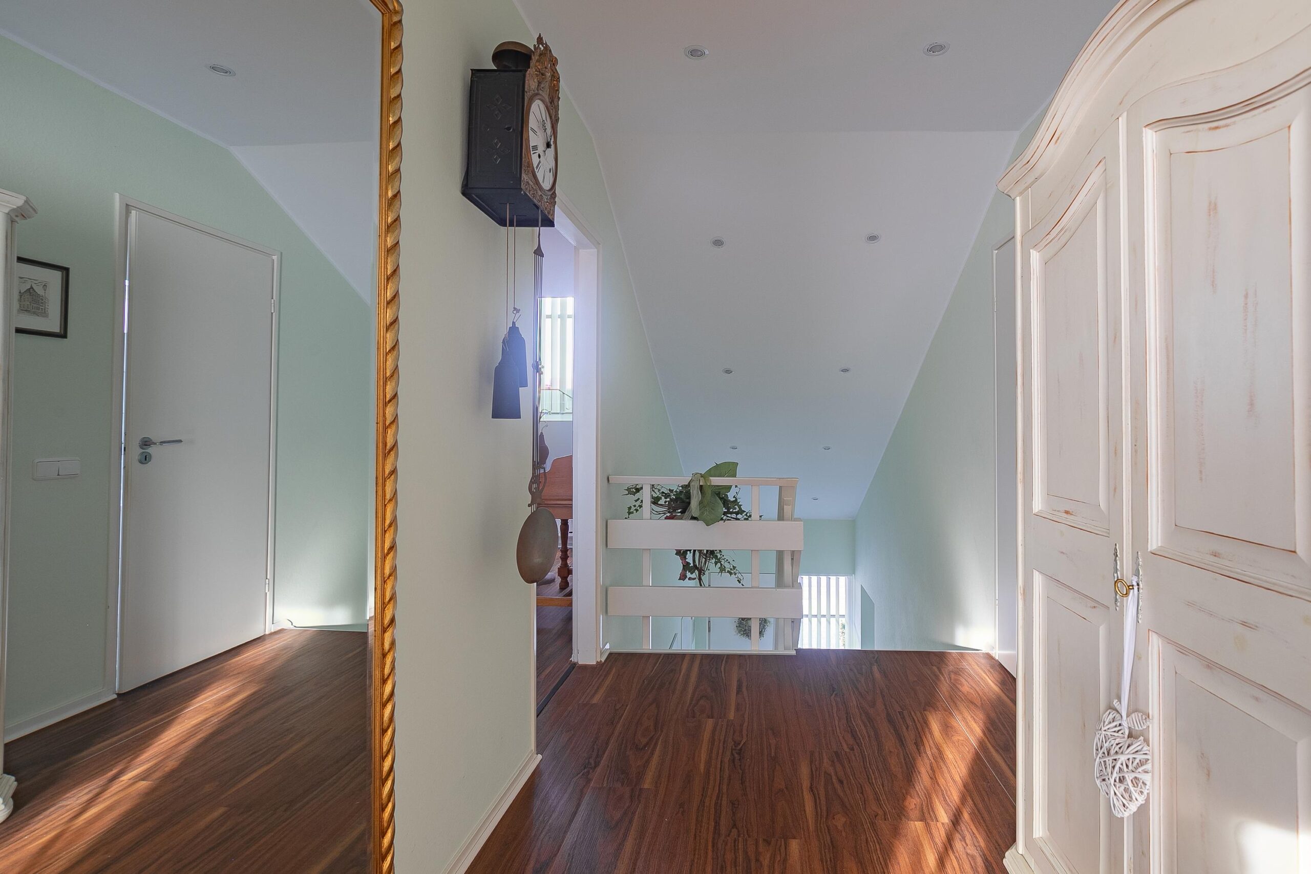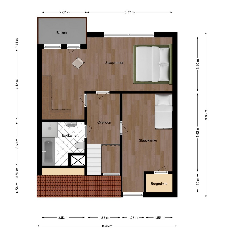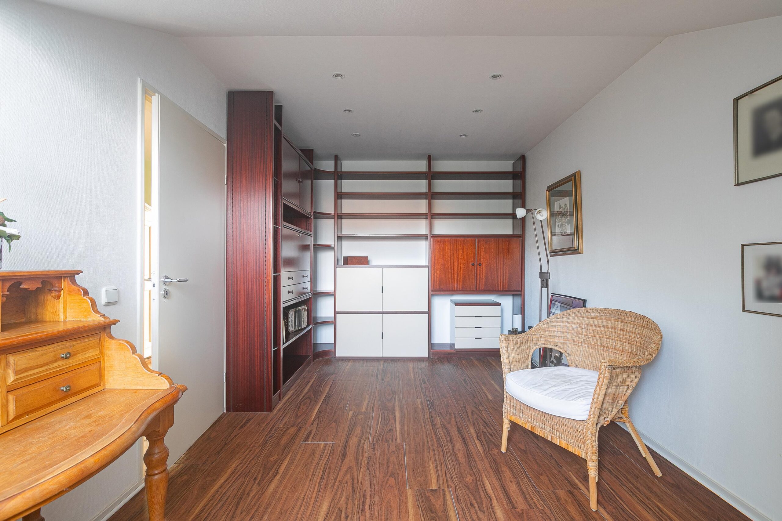 Verdieping: middels overloop zijn de (nu) twee ruime slaapkamers te bereiken waarvan één over een balkon beschikt en een kasten gedeelte. De andere slaapkamer is uitgebouwd met een dakkapel. De ruime badkamer is geheel betegeld en ingericht met ligbad, douche, 2e toilet en een badmeubel. Tevens is er elektrische vloerverwarming aanwezig. Een Velux-raam biedt voldoende daglicht.