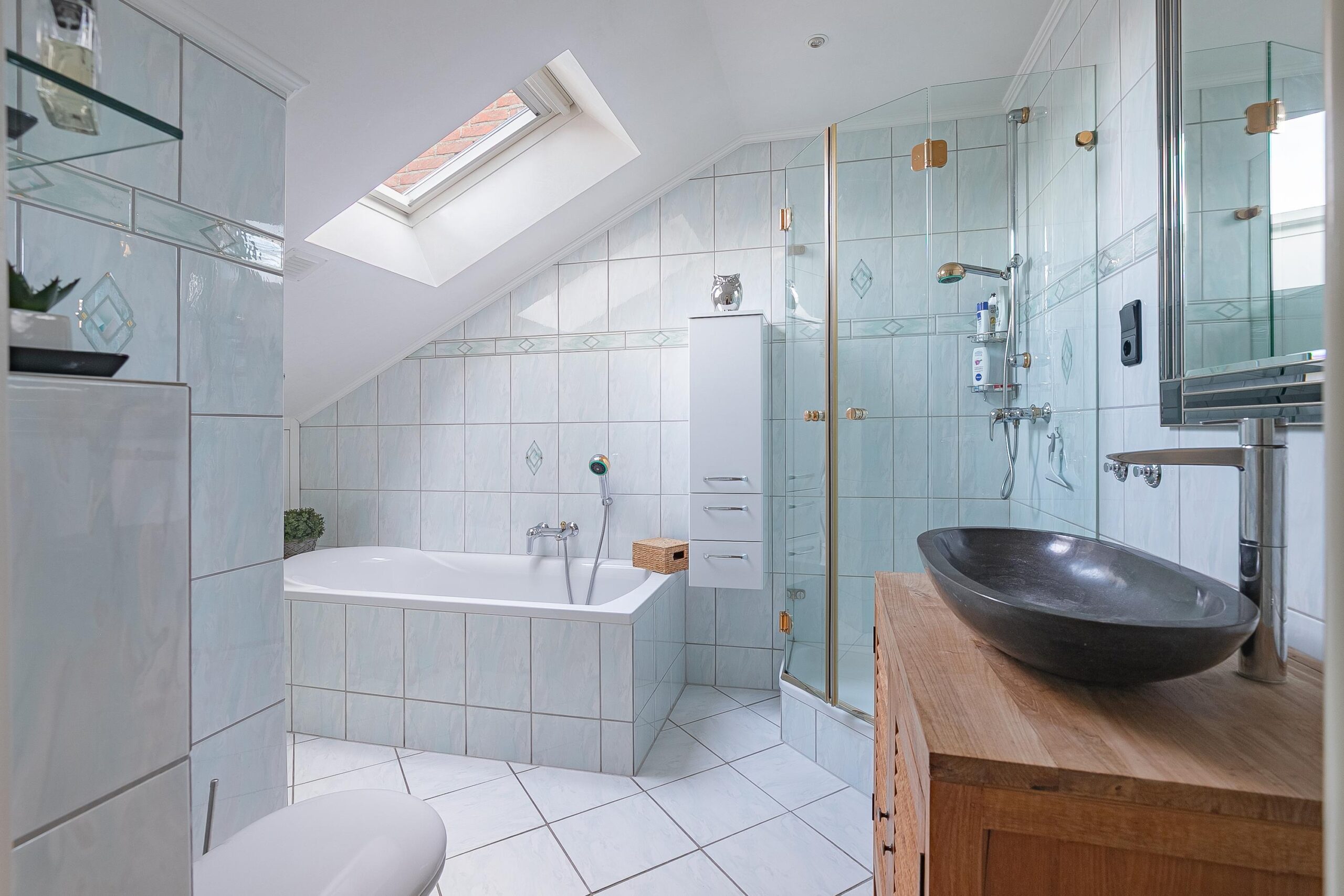 - Badkamervoorzieningen Ligbad, toilet, douche, wastafelmeubel, vloerverwarming