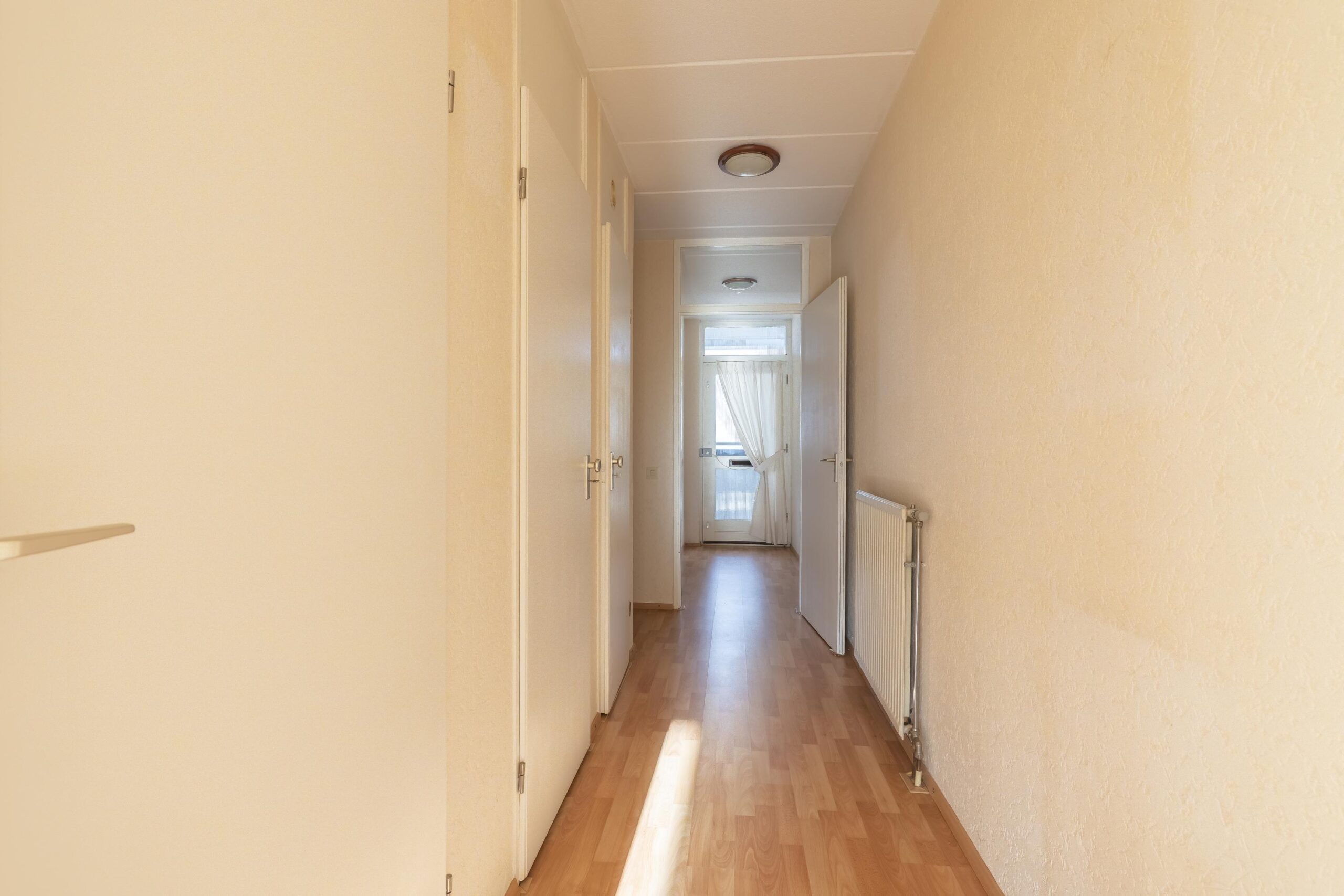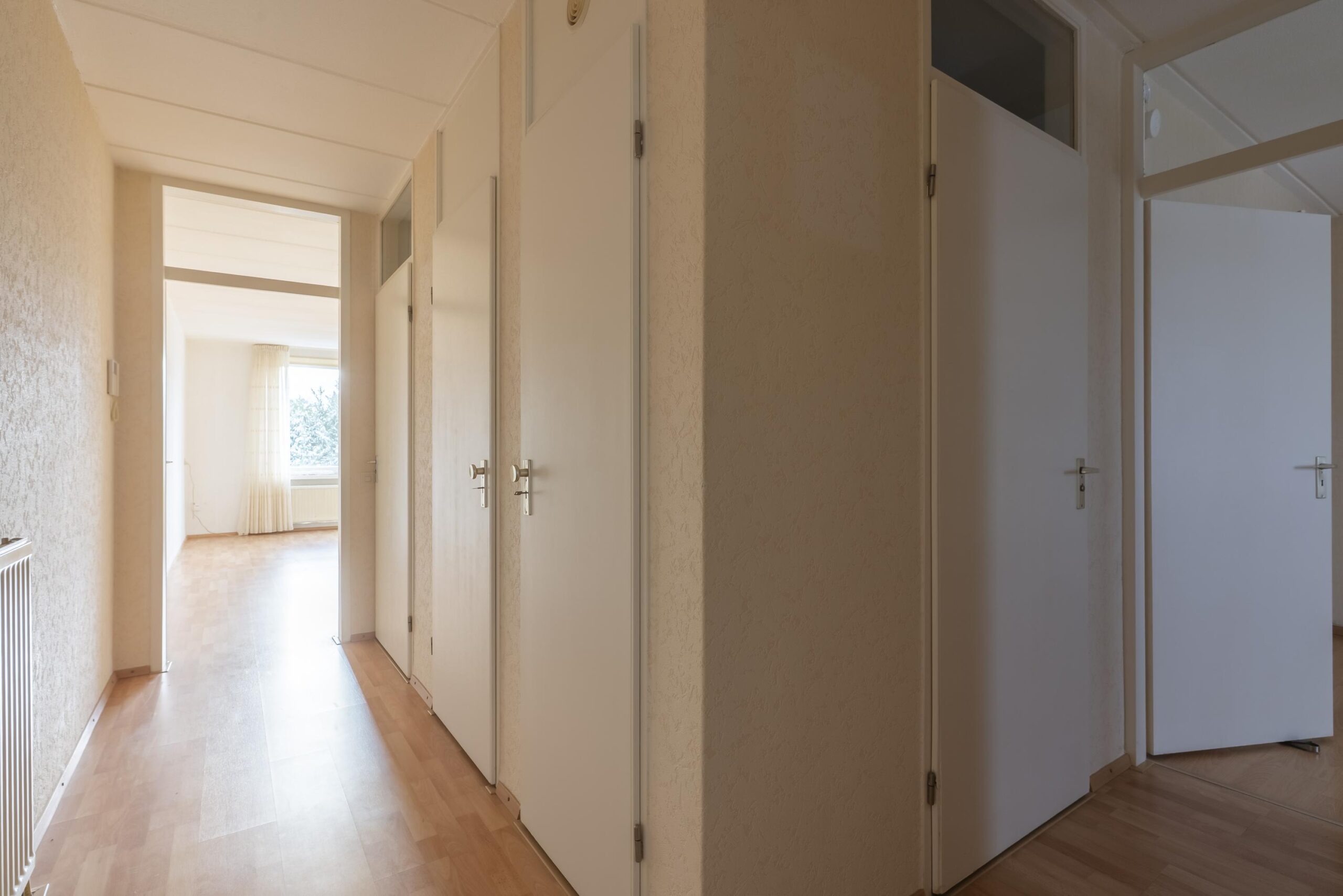 Entree, toegang naar hal. Vanuit de hal zijn de slaapkamers, badkamer, toilet, meterkast en woonkamer te bereiken. De woonkamer (30 m2) is voorzien van een hoogwaardige laminaatvloer. Een semi open keuken met rechte keukenopstelling voorzien van de navolgende apparatuur: koelkast, 4 pits fornuis, afzuigkap en vaatwasser. De slaapkamers liggen aan de voorzijde van het appartement. Slaapkamer I: 3.40 x 1.85 groot en slaapkamer II 4.50 x 2.75.