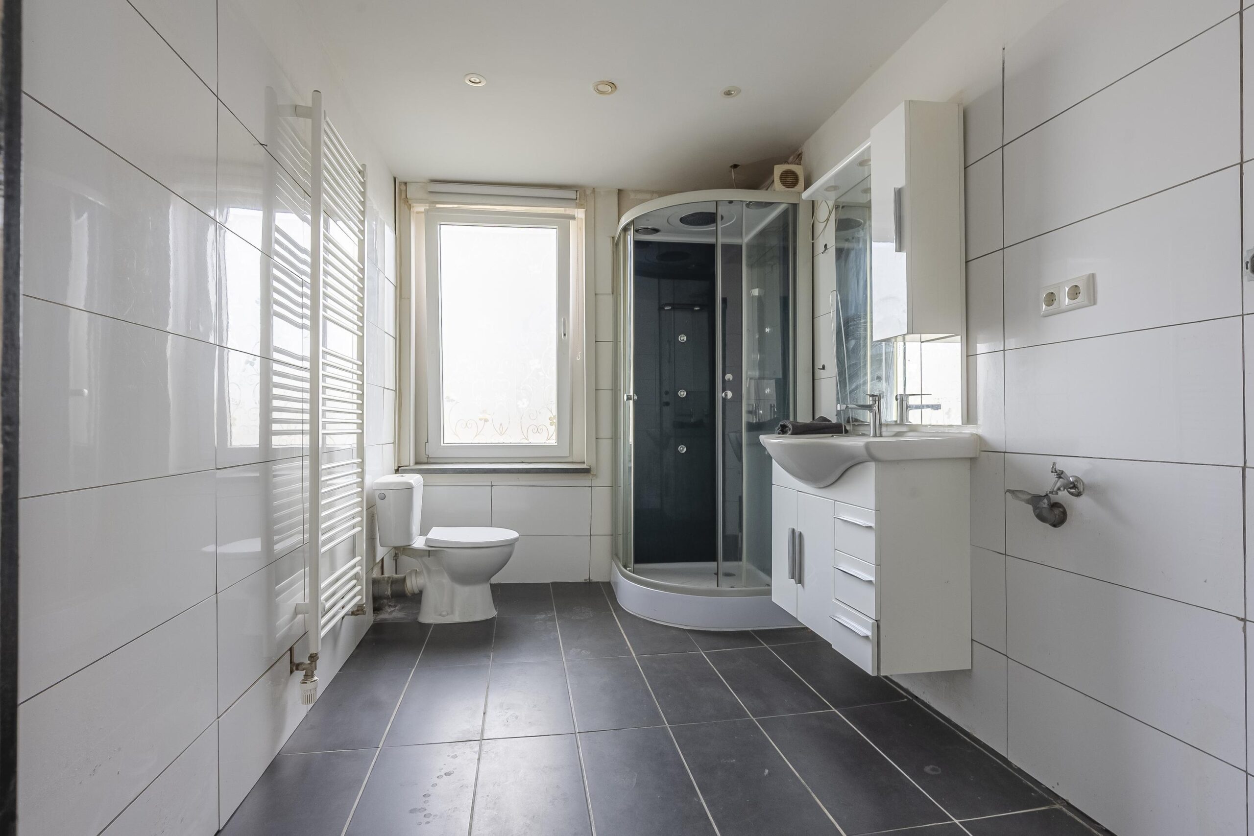 De badkamer groot ca. 7 m² is voorzien van een douche, staand toilet en wastafel met meubel.