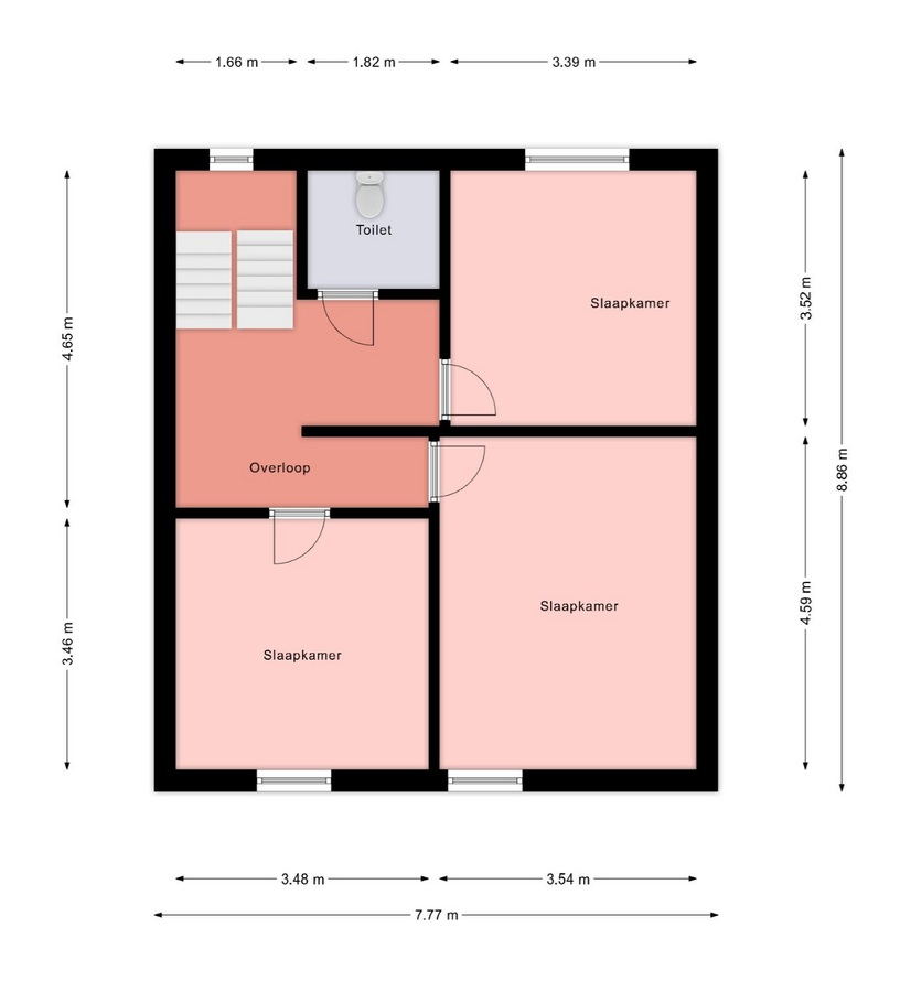 Middels vaste trap te bereiken tweede verdieping alwaar 3 slaapkamers en de royale toiletruimte/CV-ruimte zijn gesitueerd.