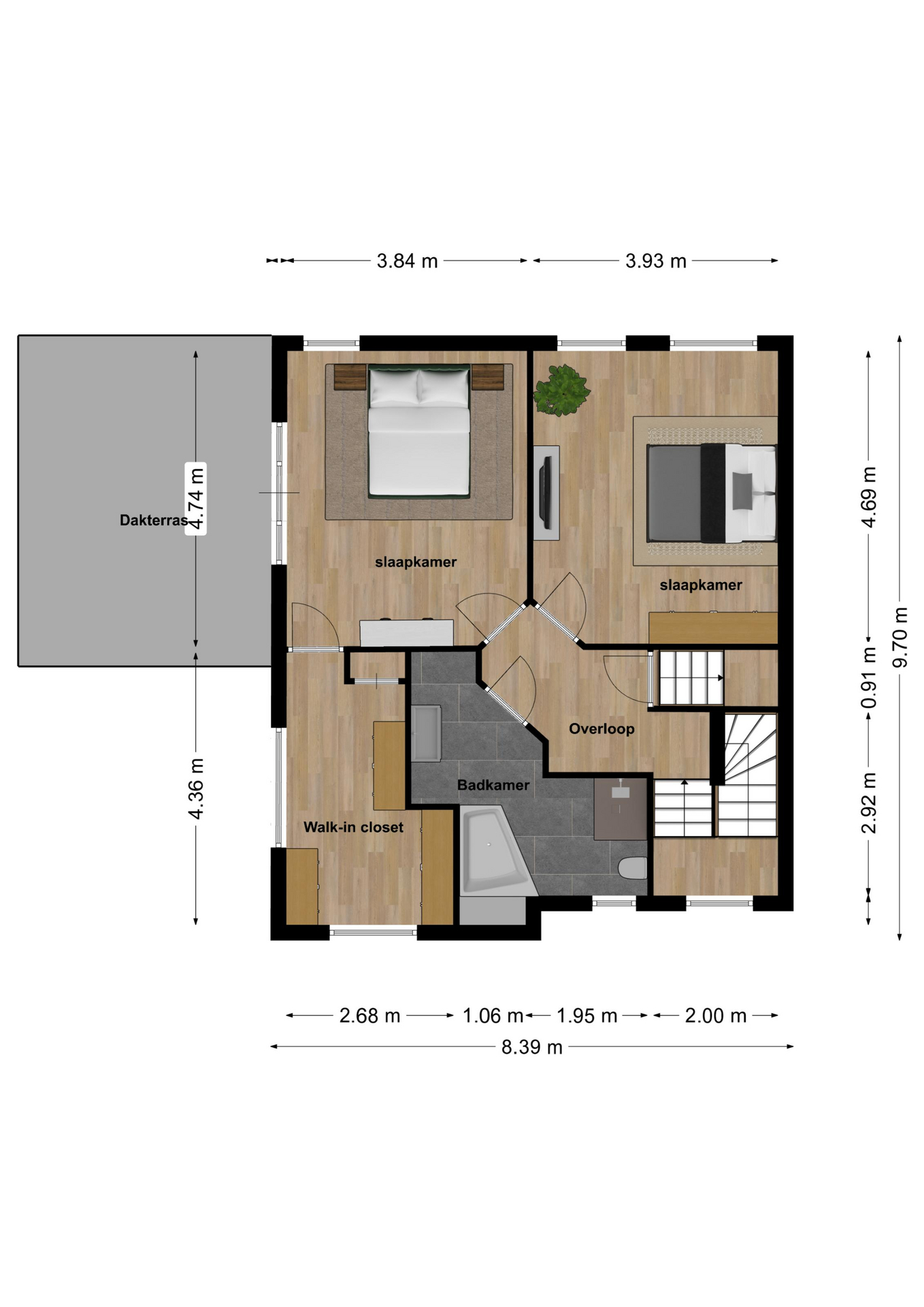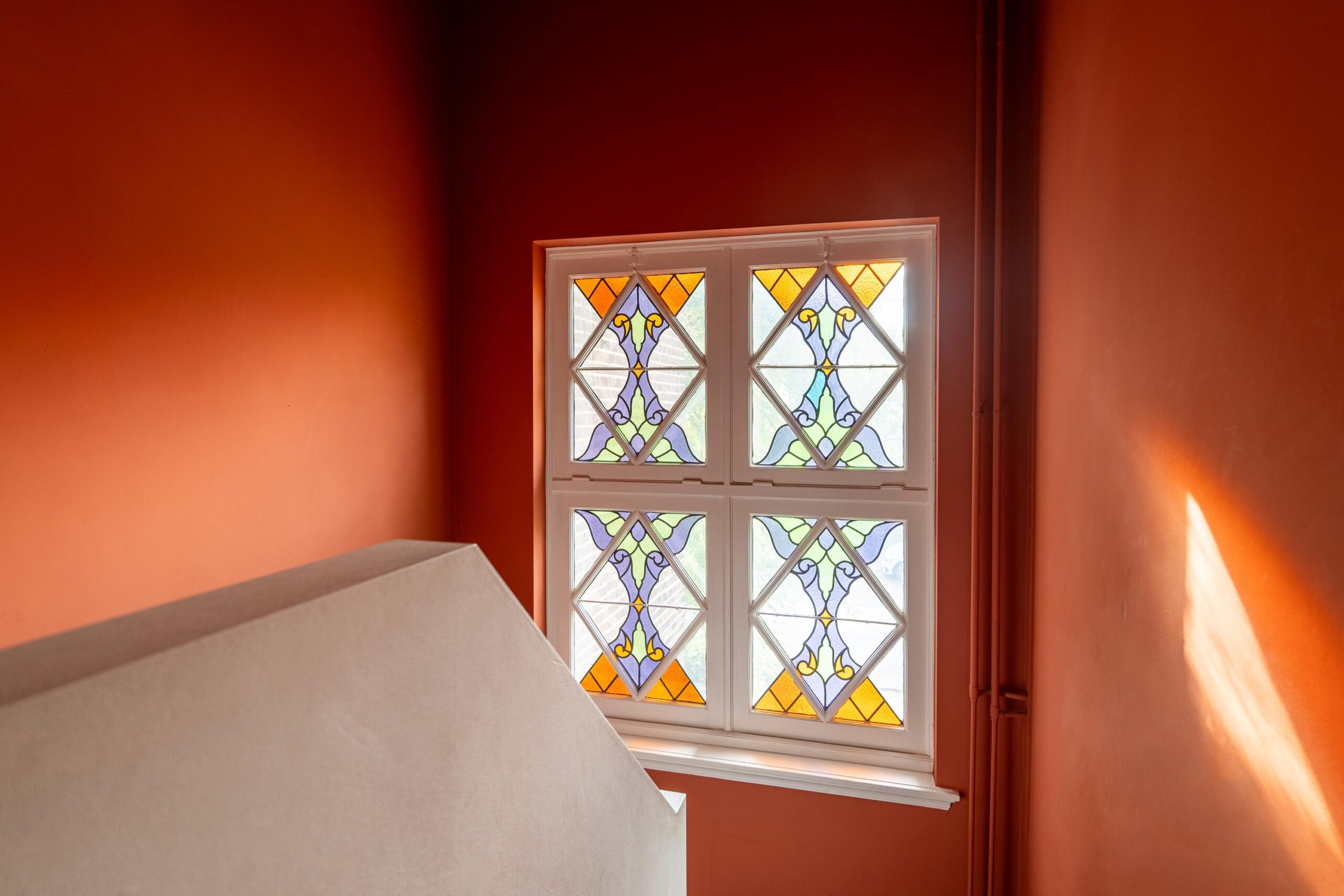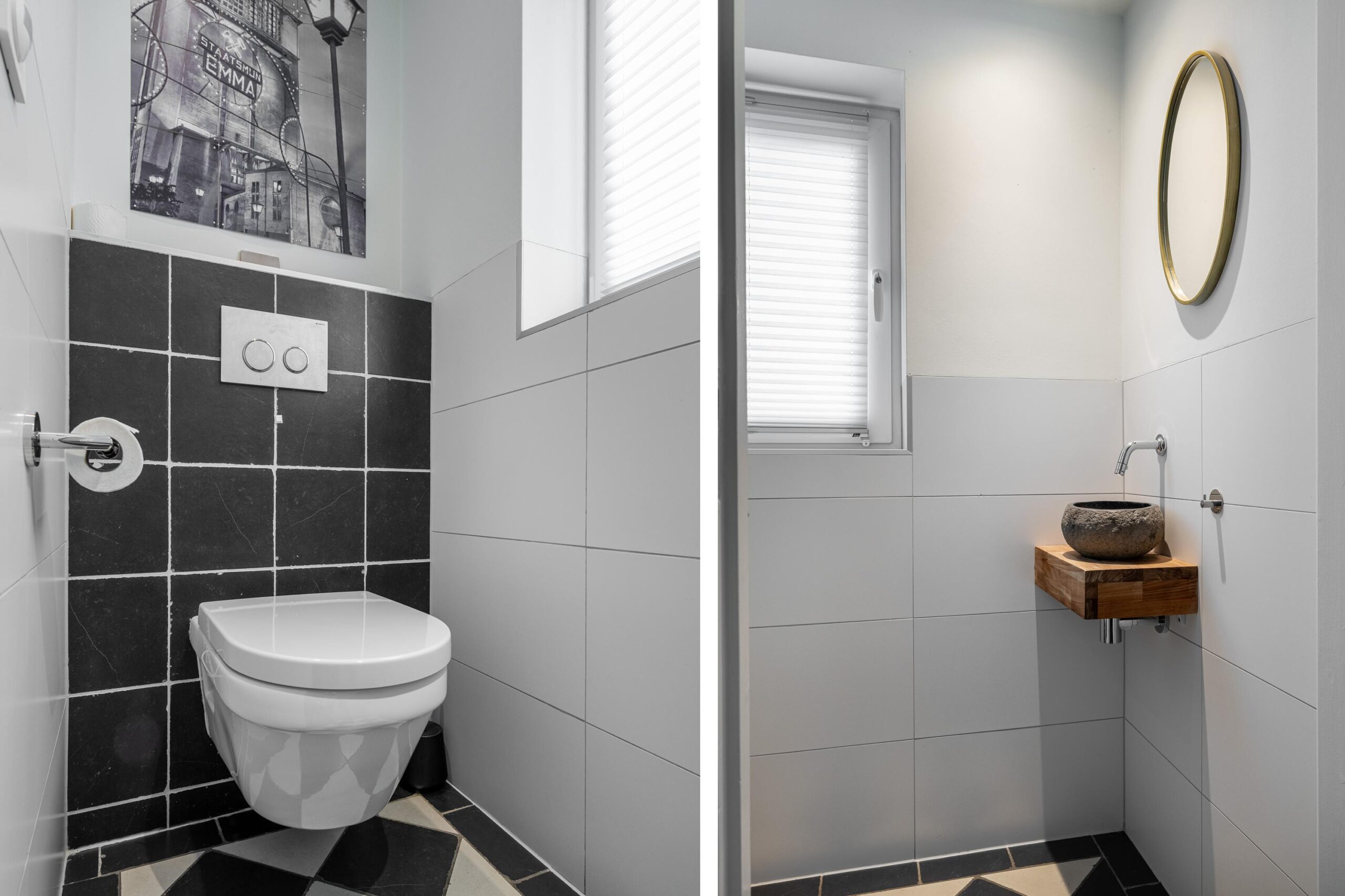Via de fraaie bordestrap bereikt u de overloop, waar het glas-in-loodraam een prachtig kleurenspel in het trappenhuis creëert. Overloop met toegang tot twee ruime slaapkamers en een badkamer. De badkamer is uitgerust met een houtlook keramische vloer, een royaal hoekligbad, douchecabine, zwevend toilet en een stijlvol badkamermeubel. De hoofdslaapkamer heeft directe toegang tot een derde kamer, die momenteel als praktische walk-in closet is ingericht. Alle kamers zijn afgewerkt met een nette laminaatvloer.