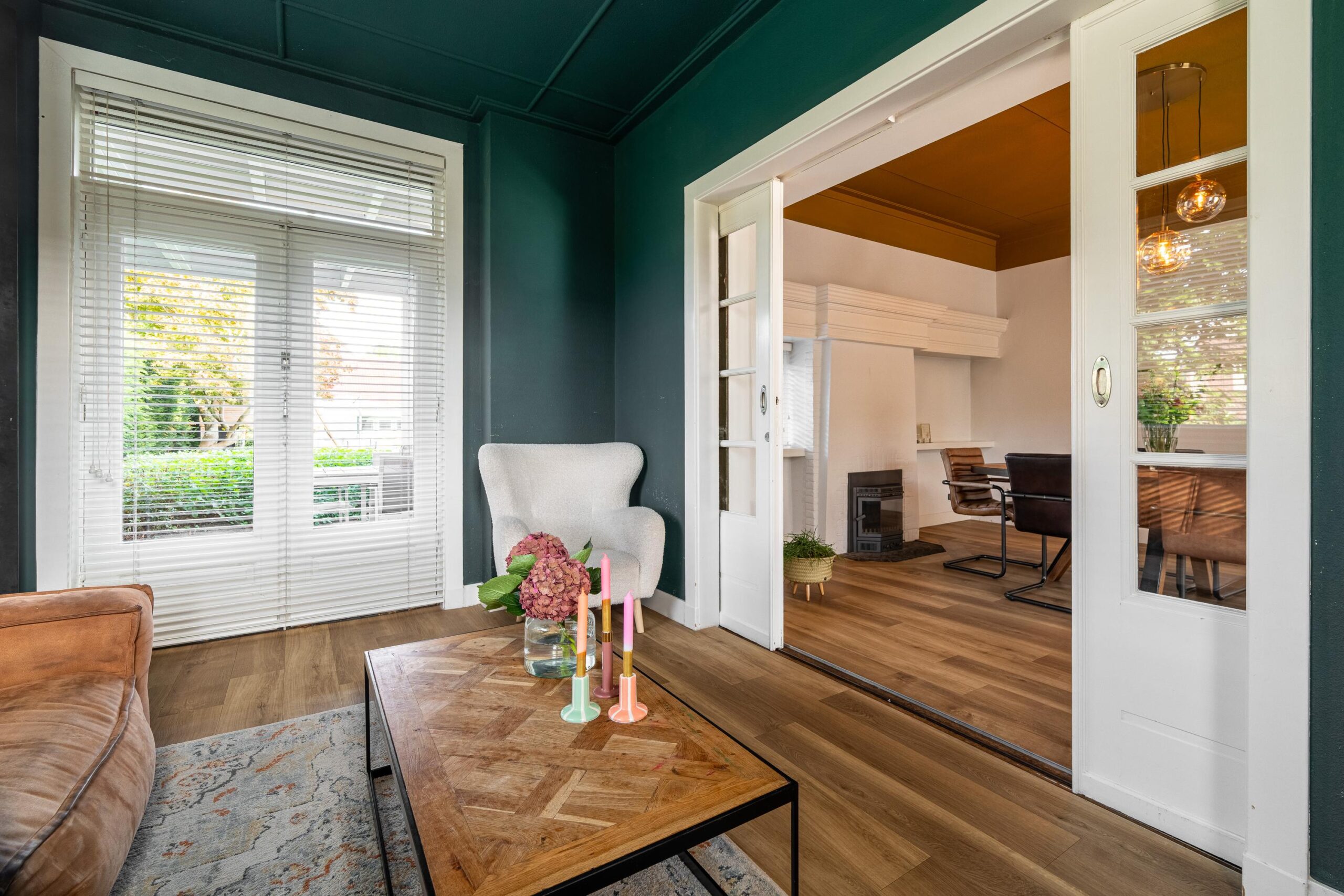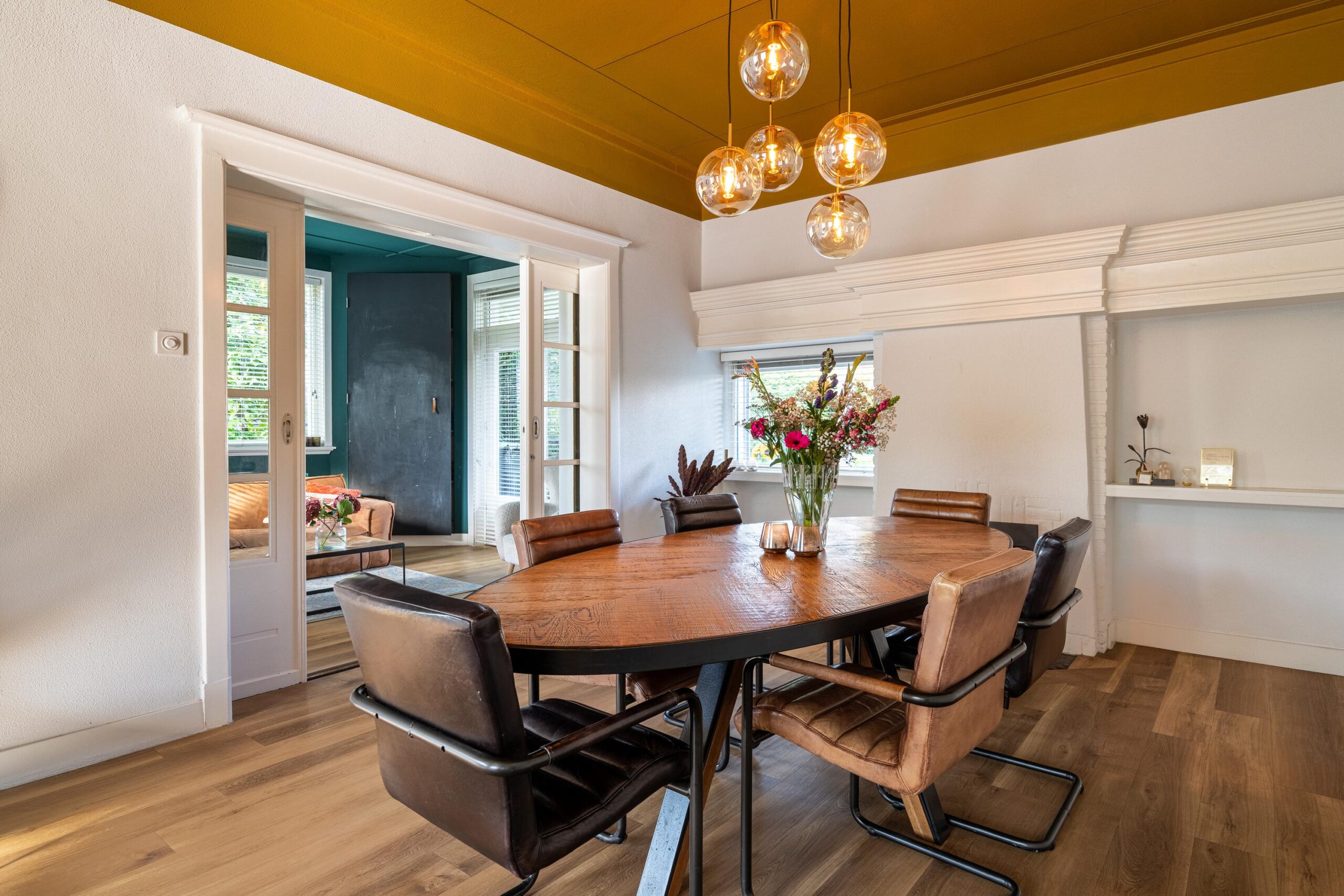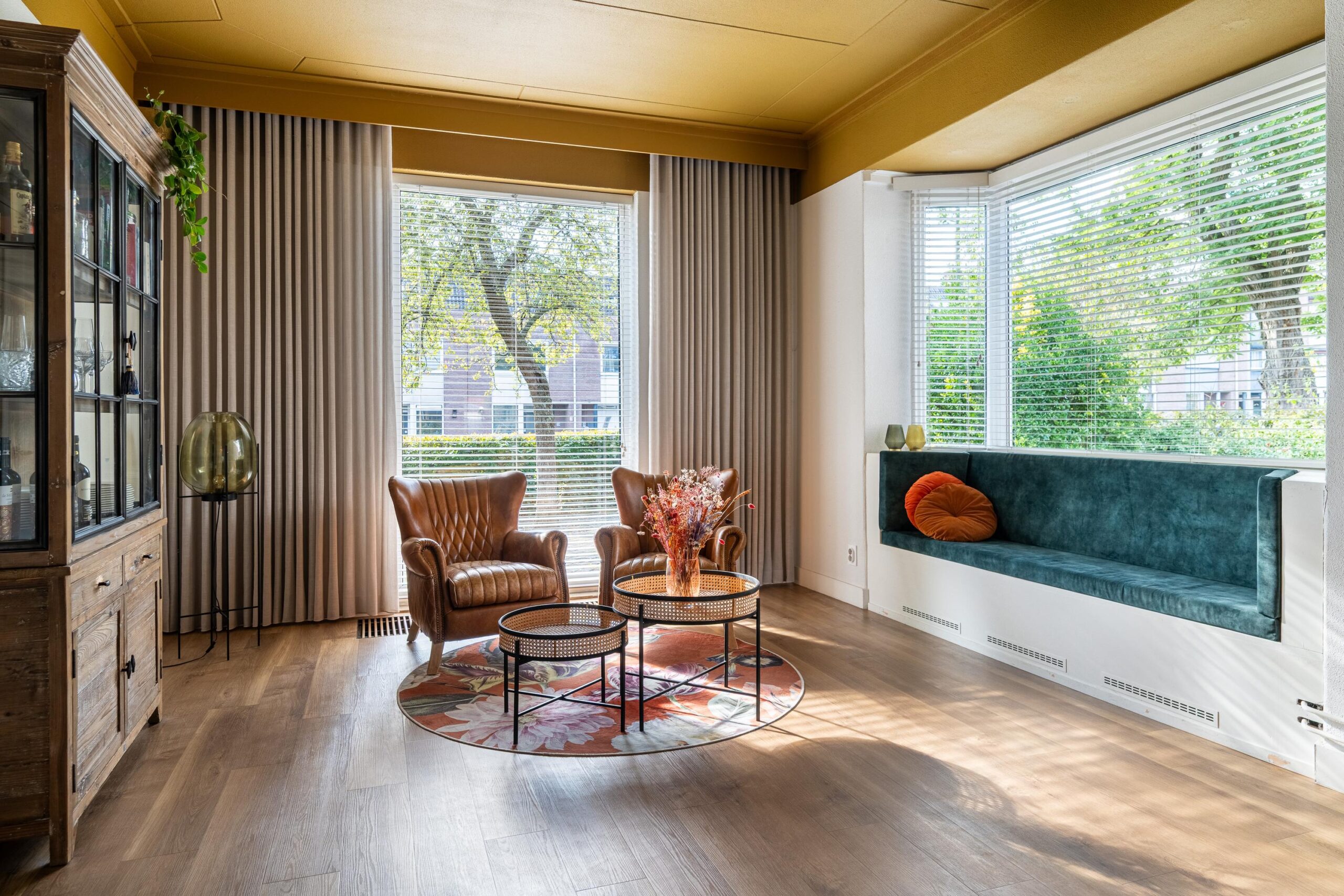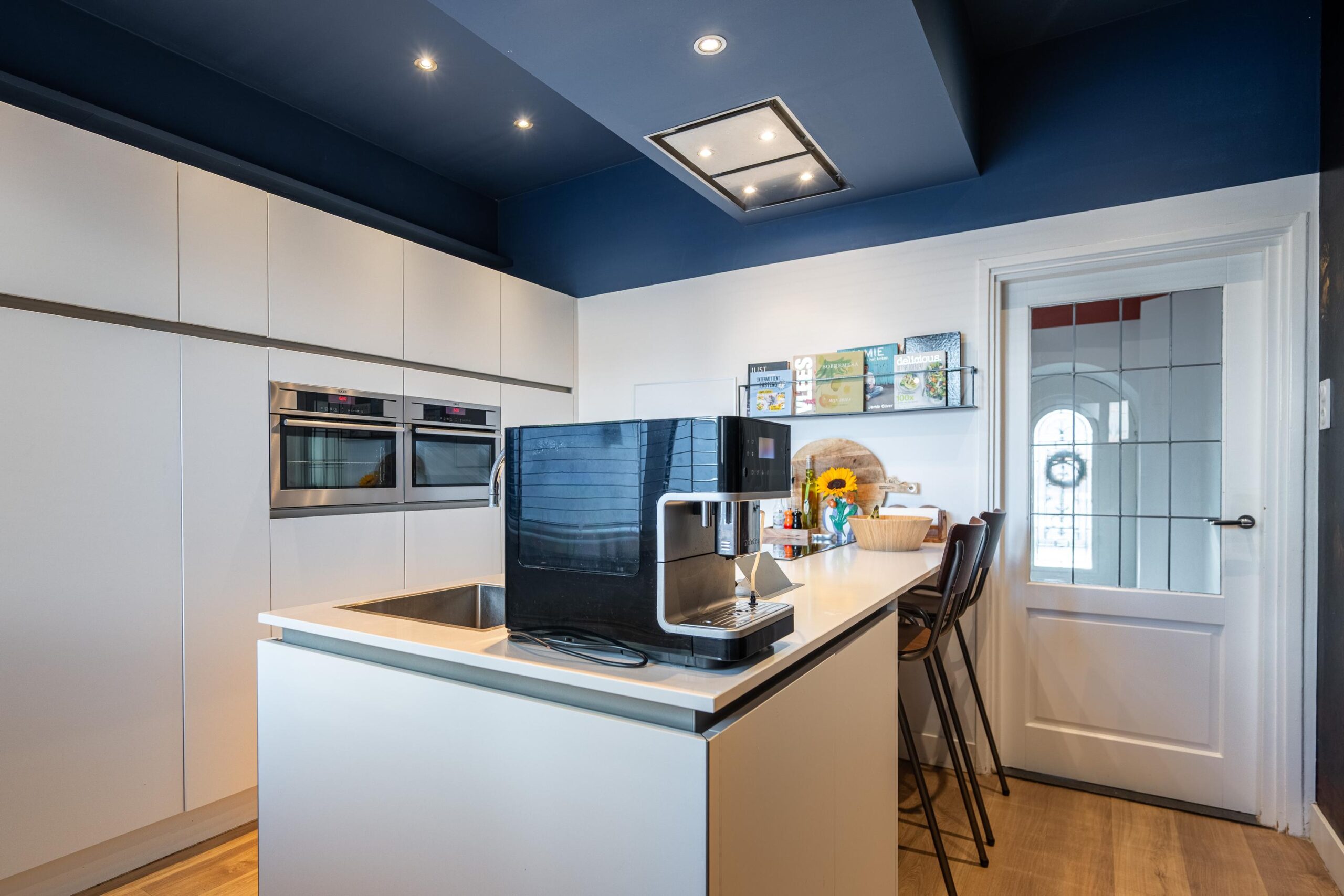 Beklinkerde voortuin met toegang tot de overdekte entree. Binnenkomst in de royale ontvangsthal met plavuizen vloer, meterkast en trapopgang naar de verdieping. De moderne toiletruimte is uitgerust met een zwevend toilet en fontein. De sfeervolle woonkamer beschikt over karakteristieke ensuite-deuren en een pvc-plankenvloer. Aansluitend bevindt zich de lichte tuinkamer met openslaande deuren naar het terras en de tuin. De gesloten keuken is modern ingericht in een wand- en eilandopstelling met composieten werkblad en voorzien van de navolgende inbouwapparatuur: Quooker, inductiekookplaat, heteluchtoven, combimagnetron, afzuigkap, koelkast en vaatwasser. Daarnaast is er een praktische bijkeuken met aansluitingen voor witgoed en een deur naar de tuin.
