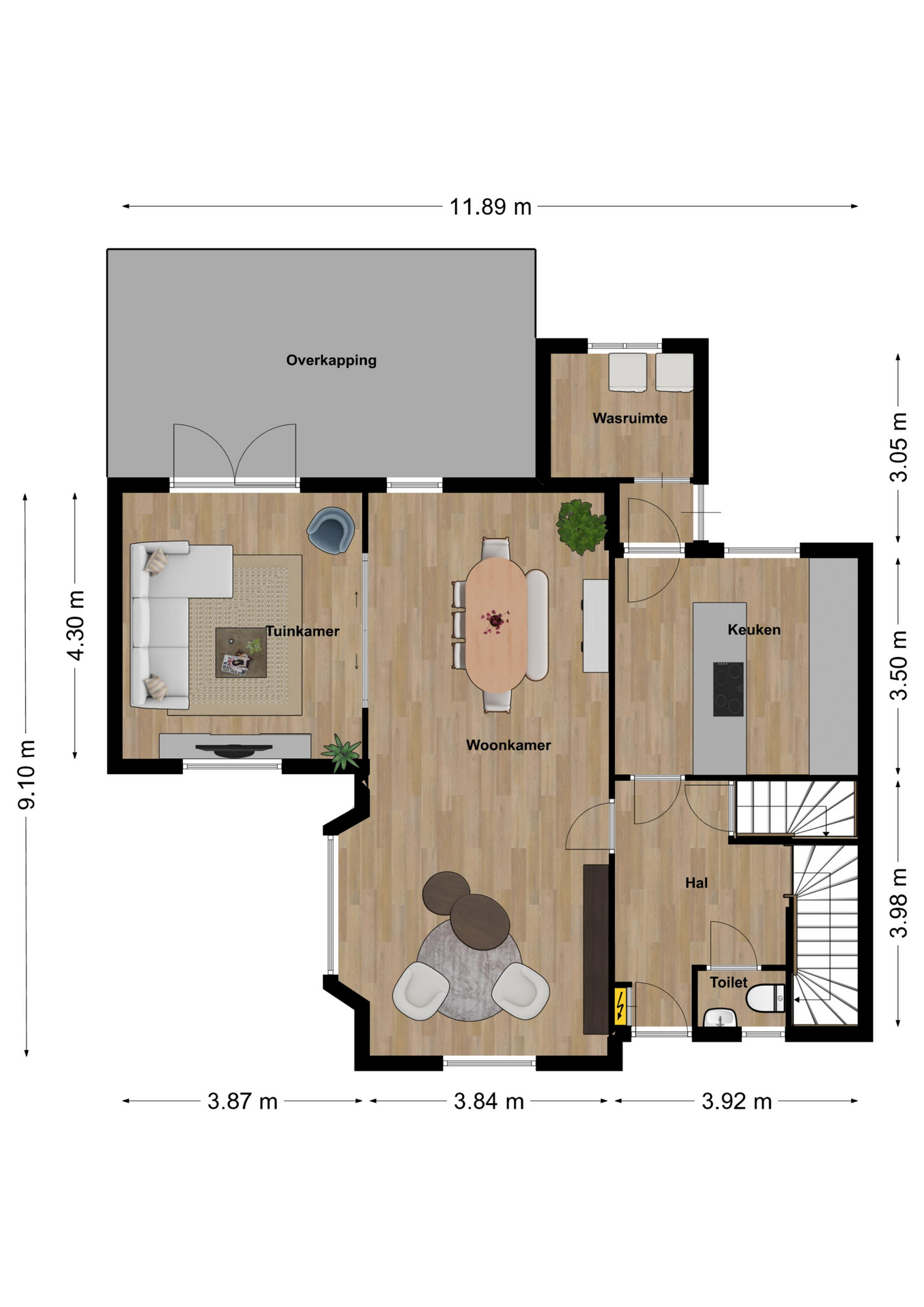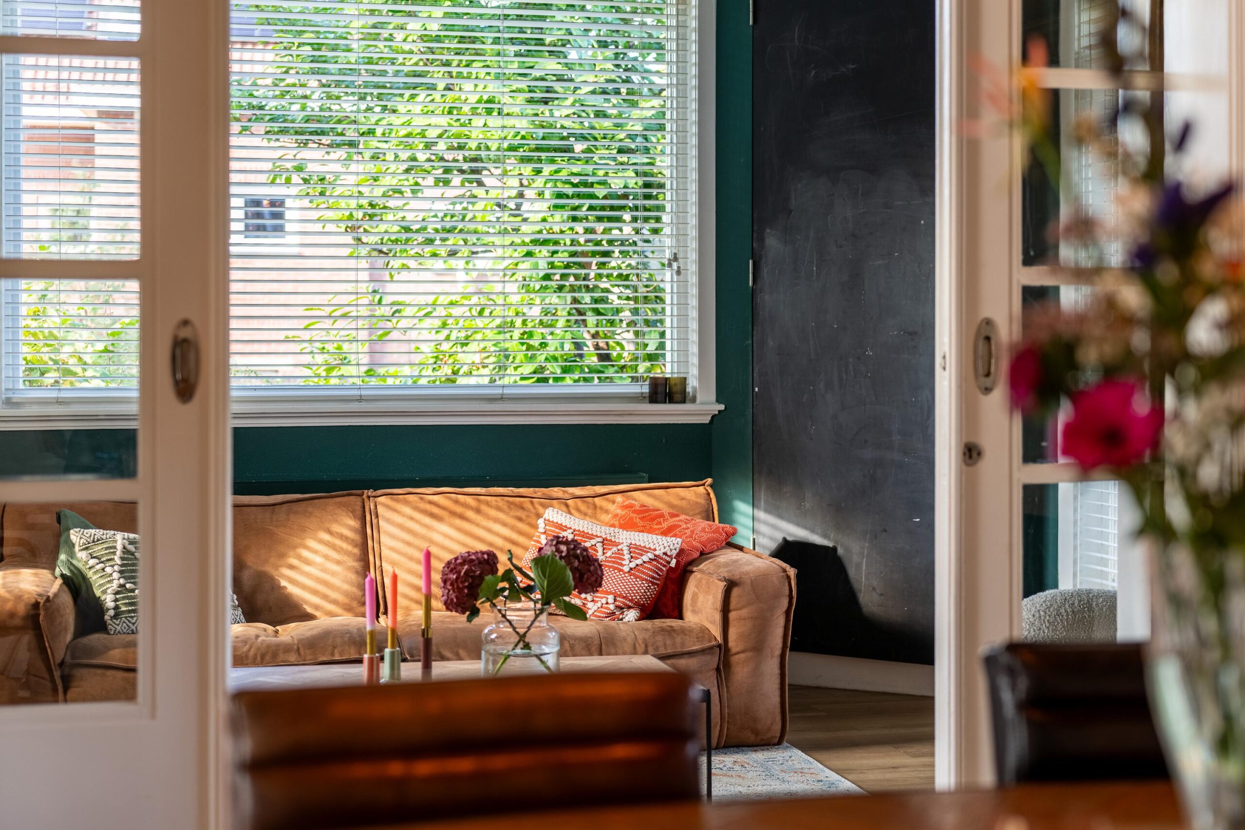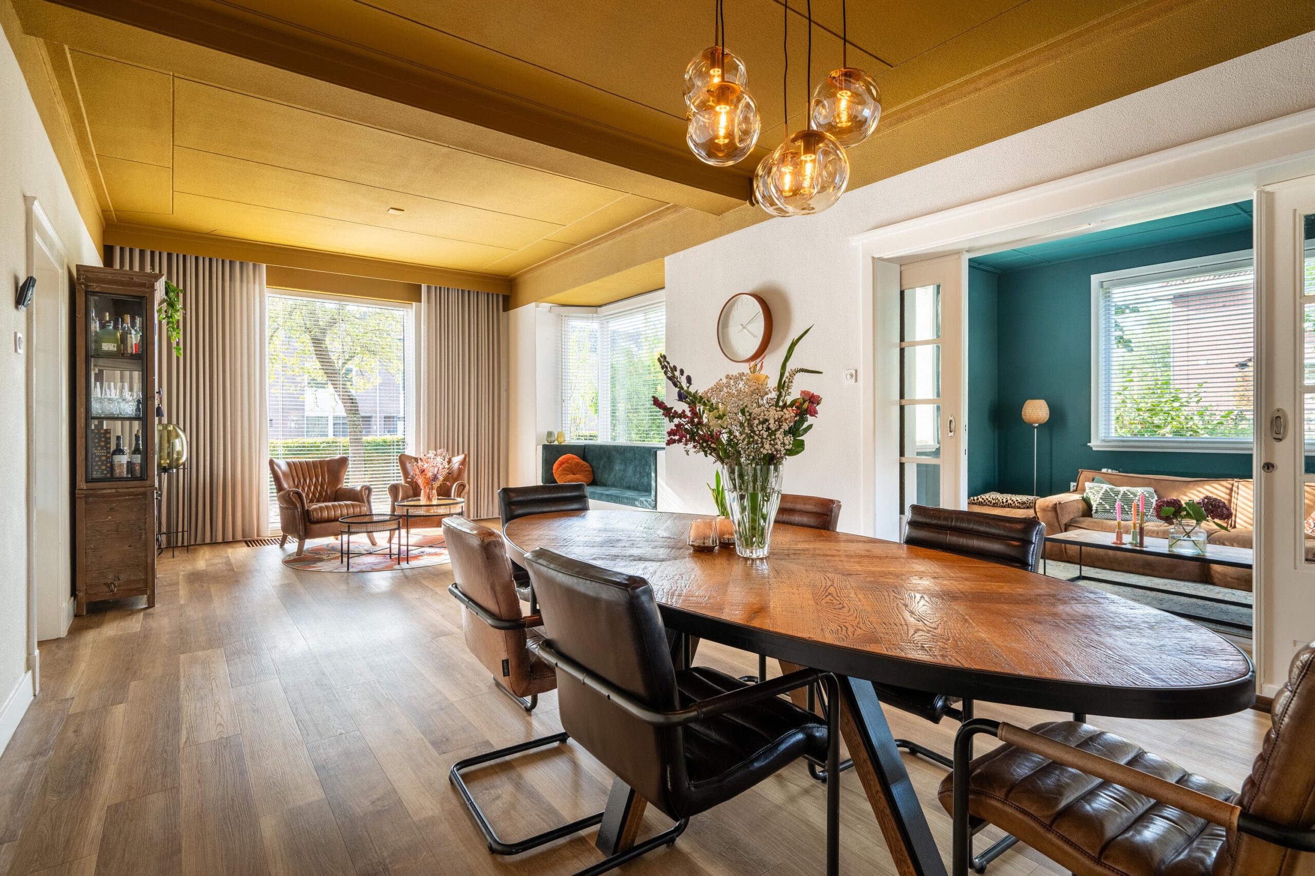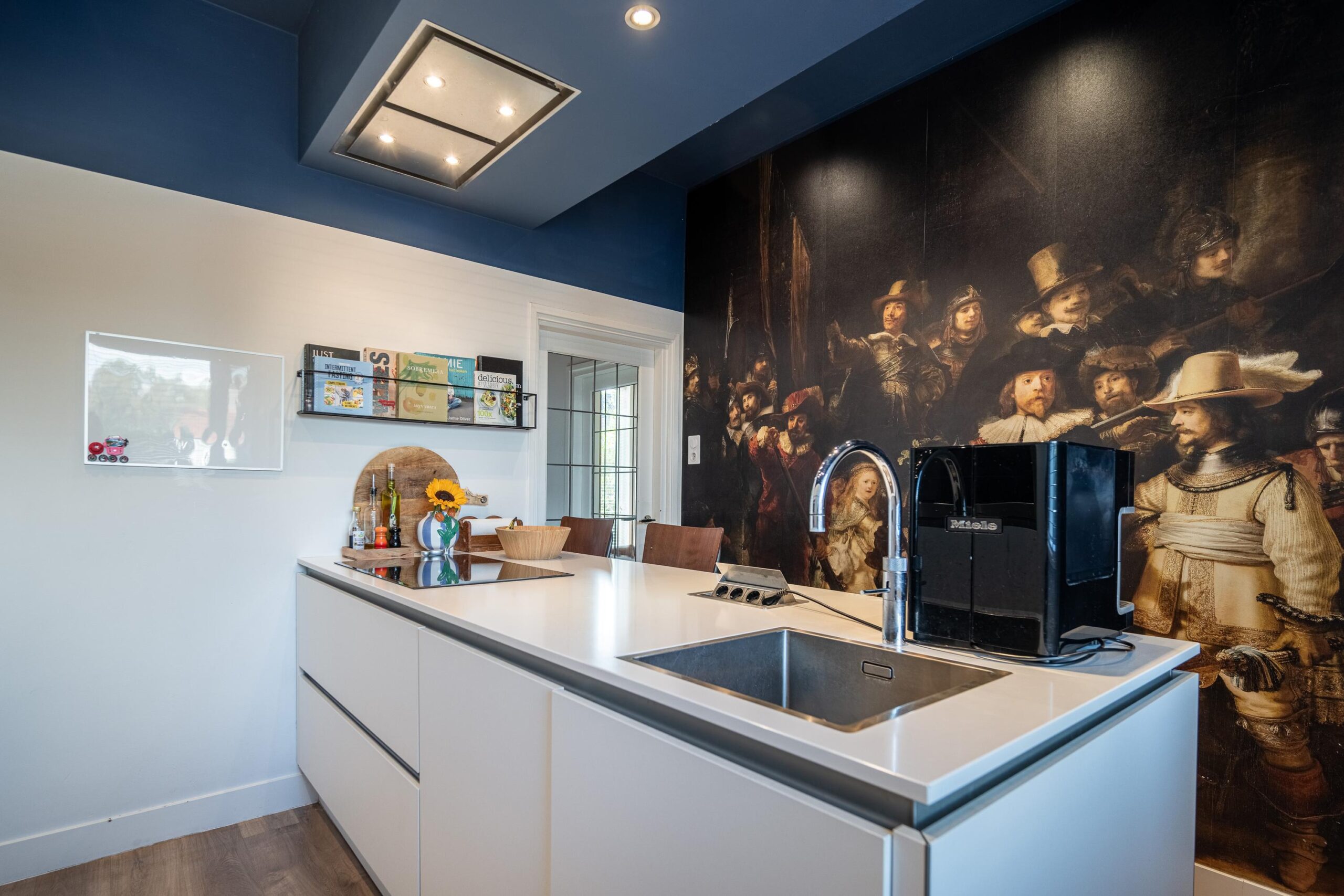 Beklinkerde voortuin met toegang tot de overdekte entree. Binnenkomst in de royale ontvangsthal met plavuizen vloer, meterkast en trapopgang naar de verdieping. De moderne toiletruimte is uitgerust met een zwevend toilet en fontein. De sfeervolle woonkamer beschikt over karakteristieke ensuite-deuren en een pvc-plankenvloer. Aansluitend bevindt zich de lichte tuinkamer met openslaande deuren naar het terras en de tuin. De gesloten keuken is modern ingericht in een wand- en eilandopstelling met composieten werkblad en voorzien van de navolgende inbouwapparatuur: Quooker, inductiekookplaat, heteluchtoven, combimagnetron, afzuigkap, koelkast en vaatwasser. Daarnaast is er een praktische bijkeuken met aansluitingen voor witgoed en een deur naar de tuin.