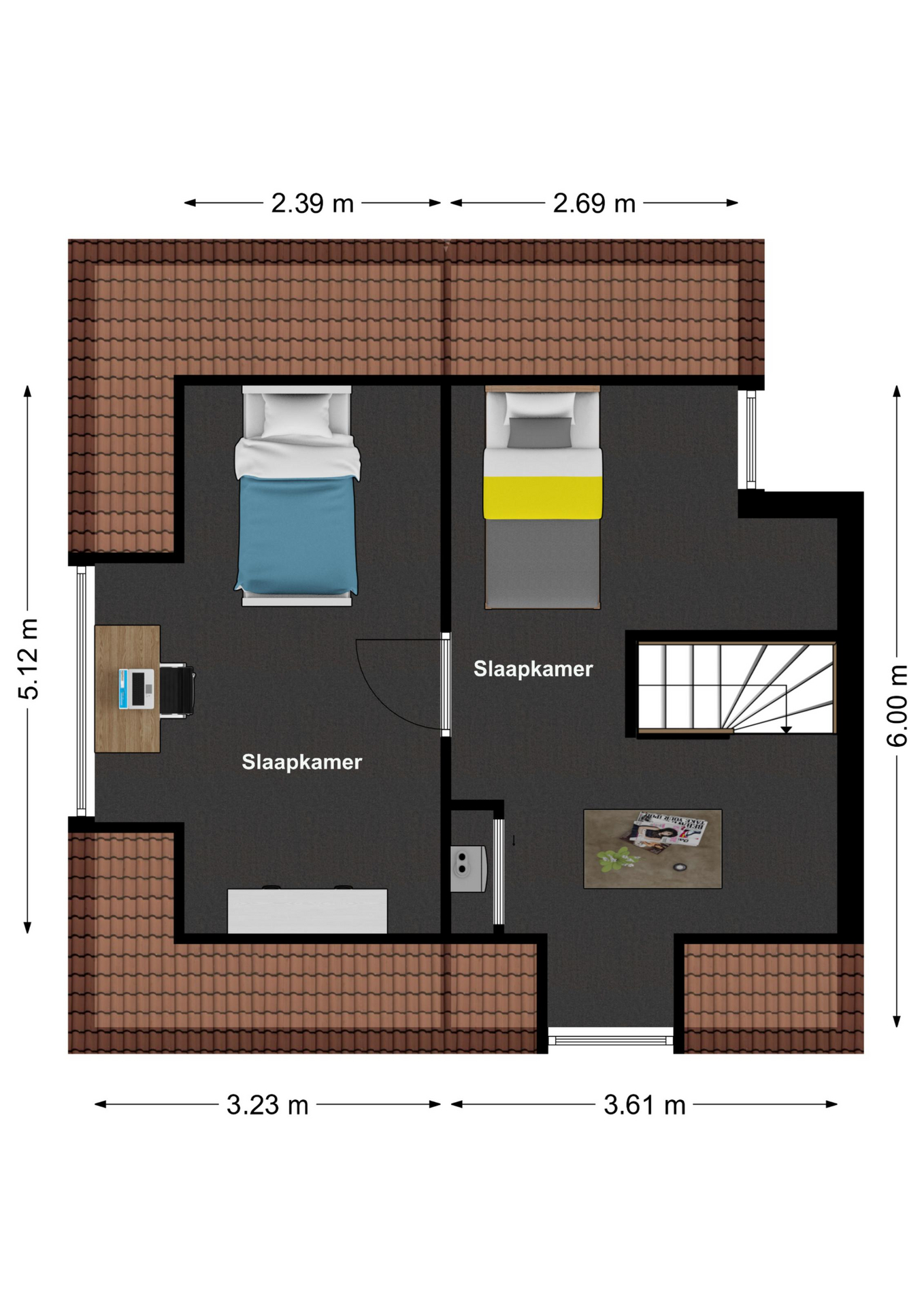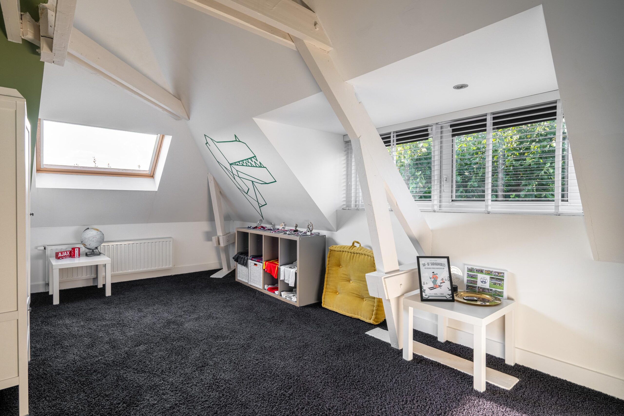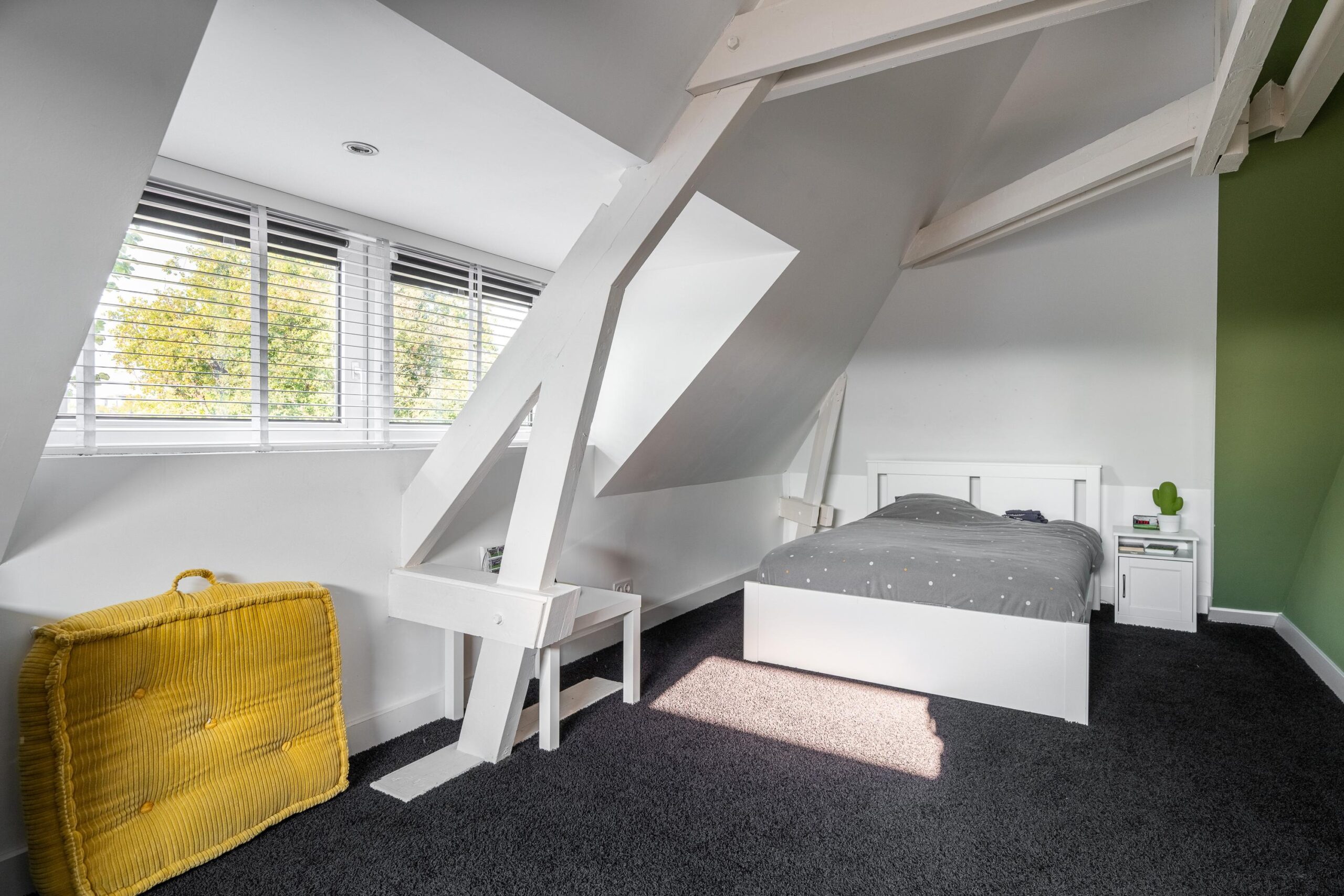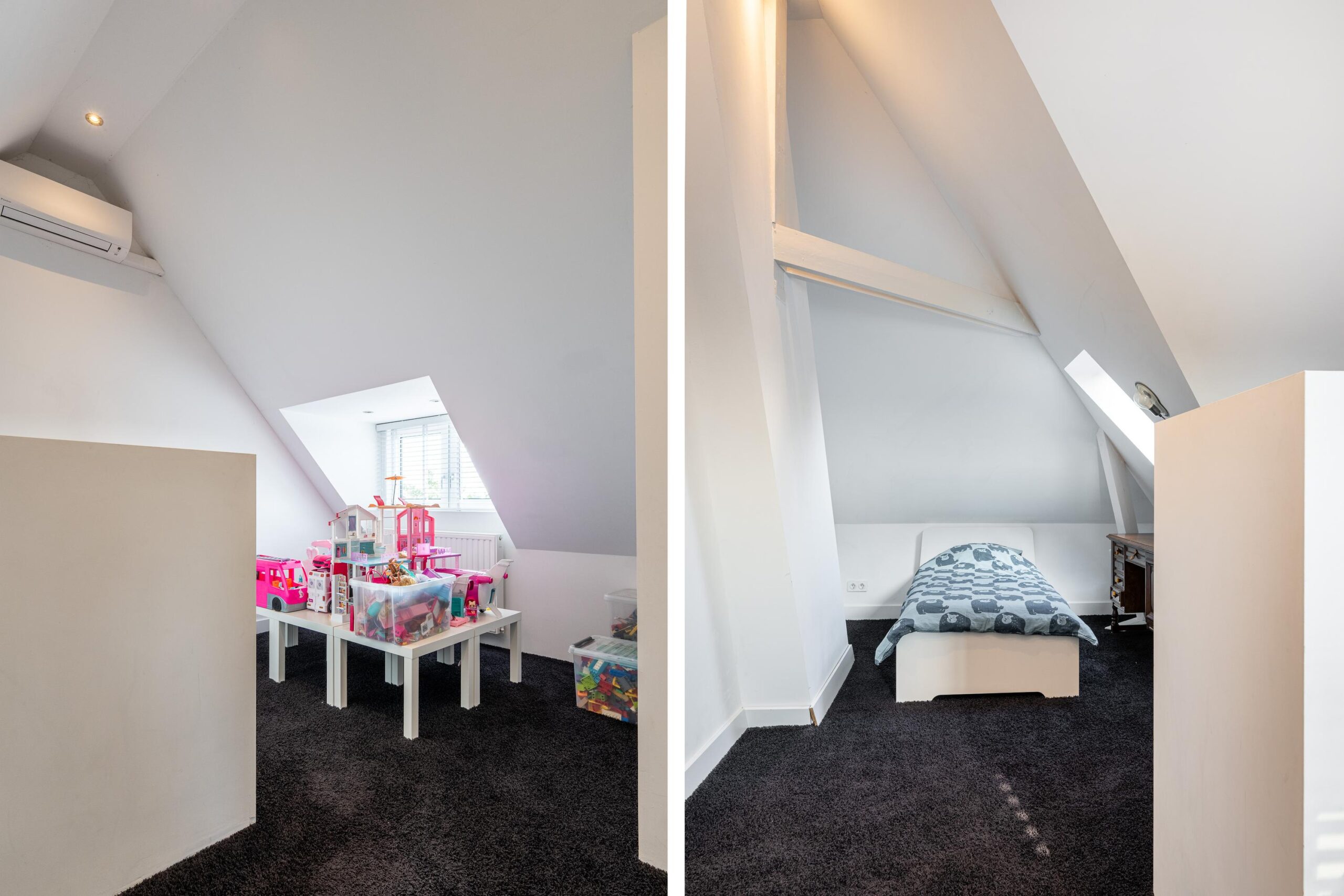 Via een vaste trap is de volledig afgewerkte tweede verdieping bereikbaar. Het zichtbare dakspant en de met gips en isolatie afgewerkte schuine dakvlakken geven deze verdieping een karakteristieke en sfeervolle uitstraling. Het is een bijzondere plek die zich uitstekend leent om te ontspannen en te slapen. De verdieping is ingedeeld in twee separate kamers, beide voorzien van dakkapellen die zorgen voor extra licht en ruimte. In de eerste kamer bevindt zich een praktische kastruimte met de opstelplaats van de Nefit cv-installatie (2020, huur).