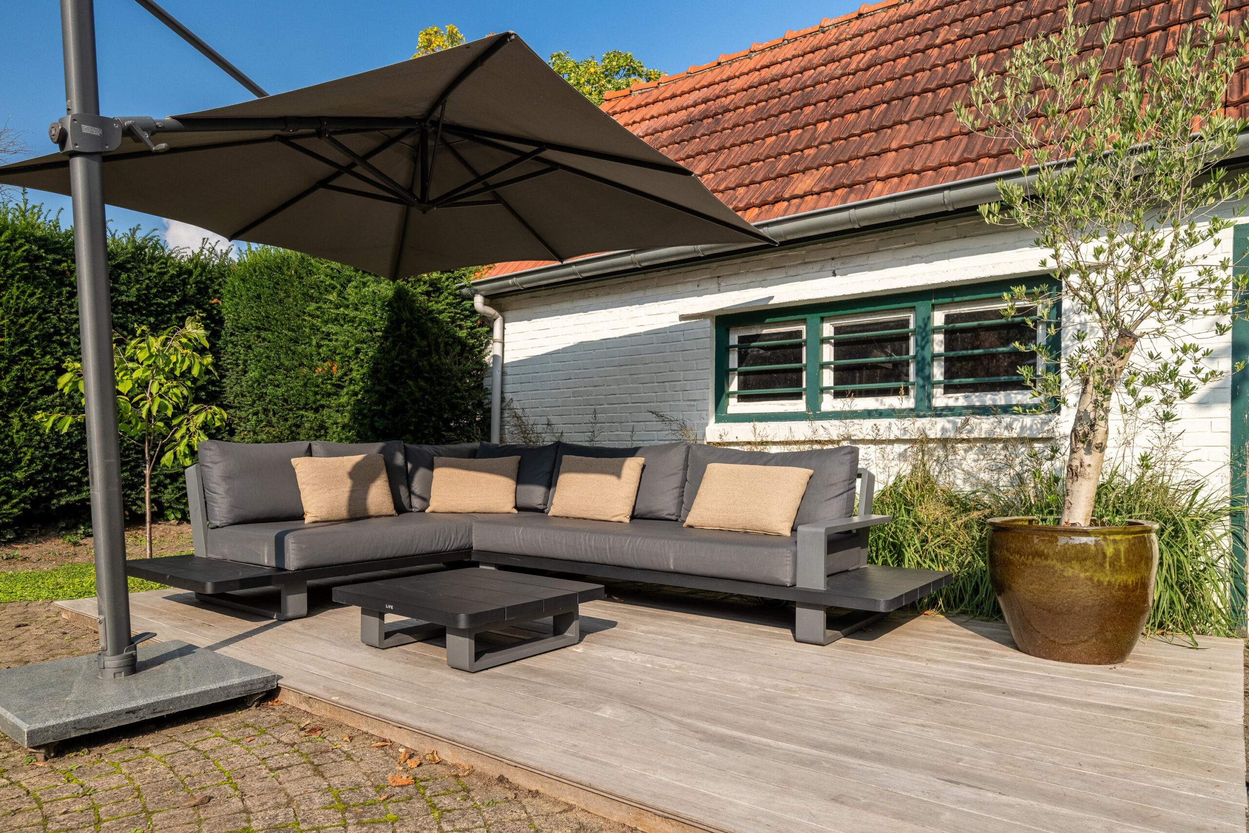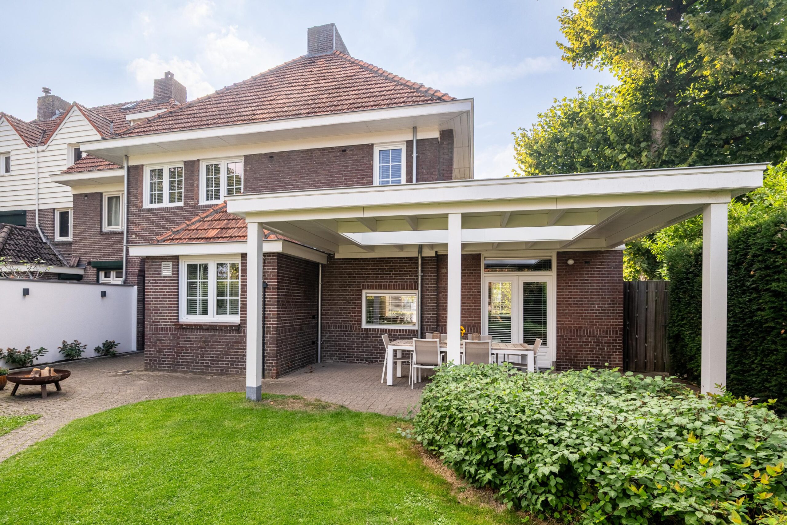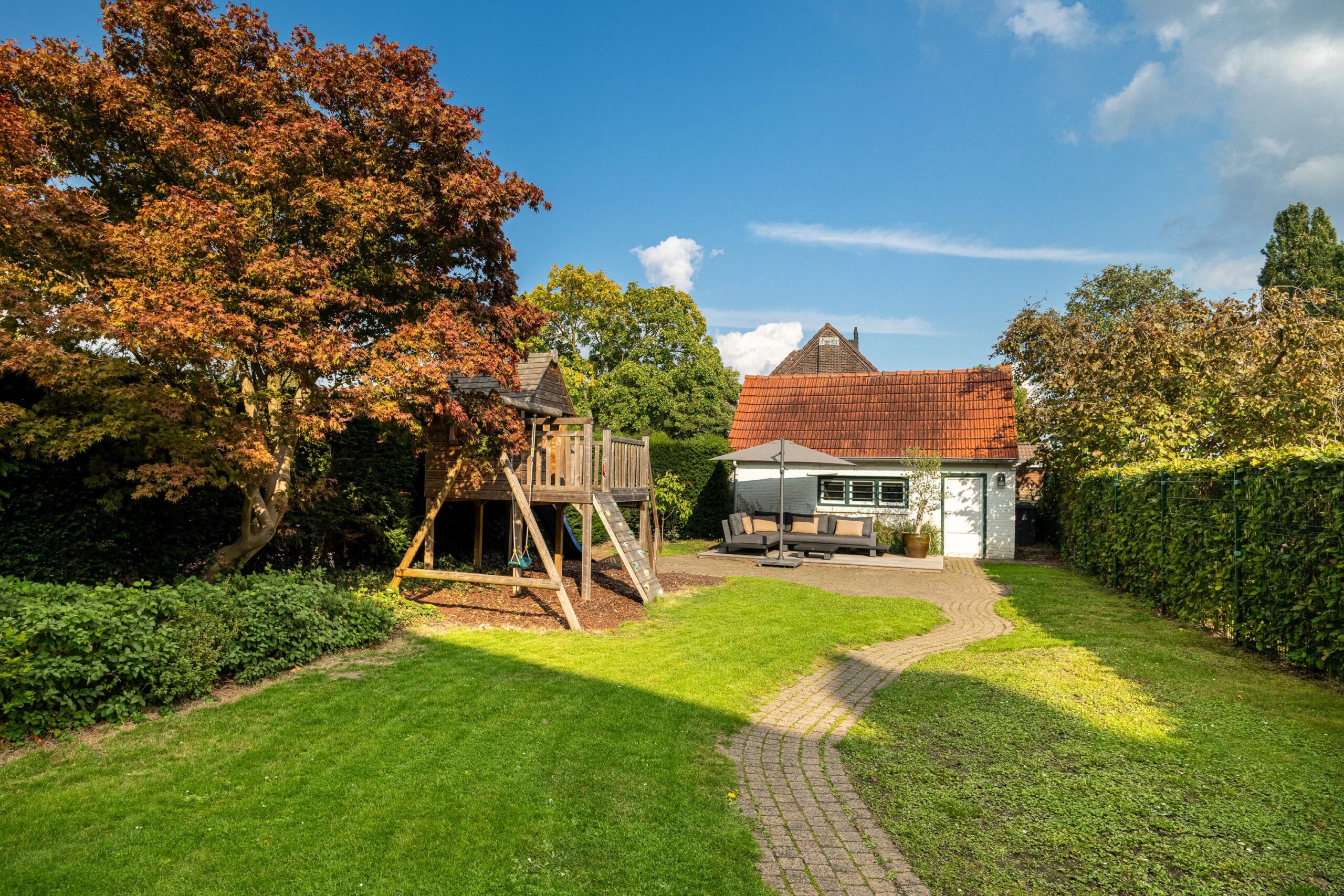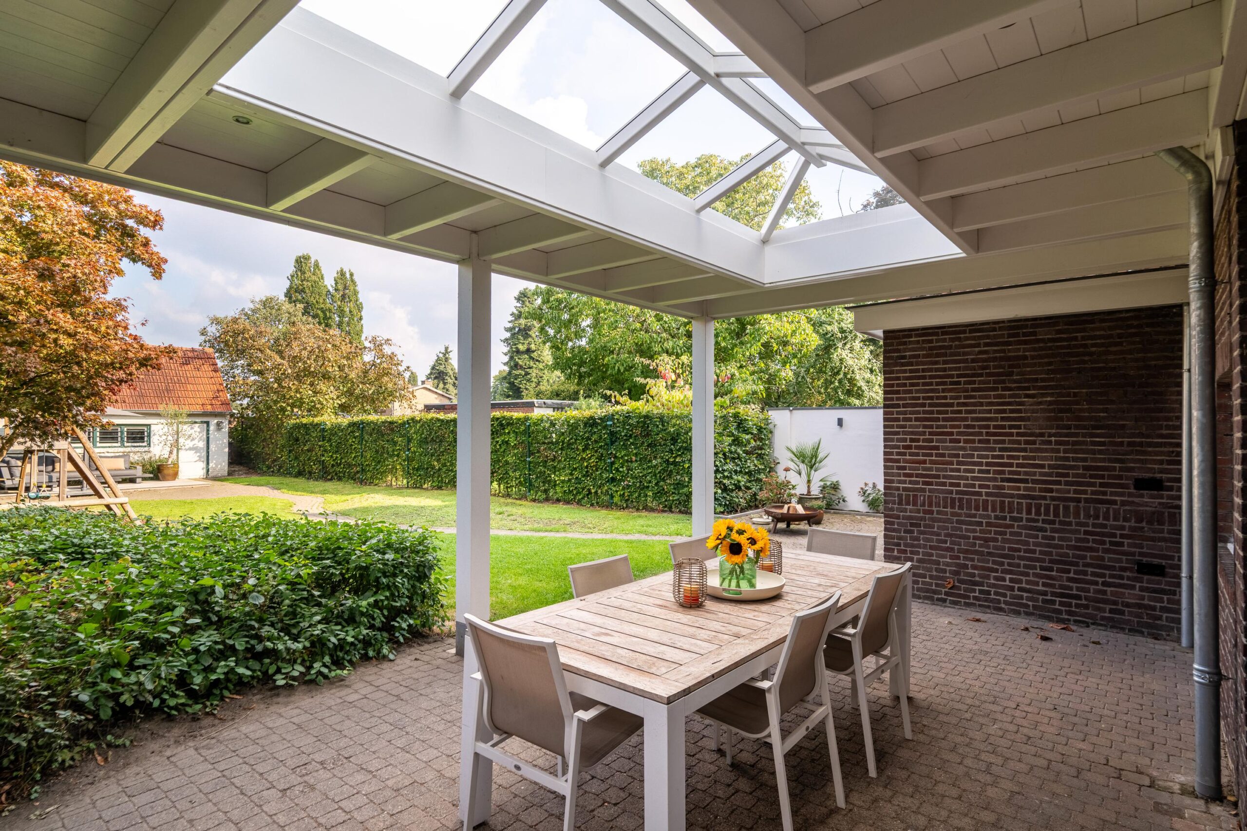 De zonnige, ruime achtertuin met zij-ingang beschikt over een prachtige houten terrasoverkapping met glazen schilddak, ideaal voor optimaal buitengenot. Achterin de tuin staat een vrijstaande garage met elektrisch bedienbare sectionaalpoort, zadeldak met bergvliering en een eigen oprit met parkeerplaats aan de voorzijde.