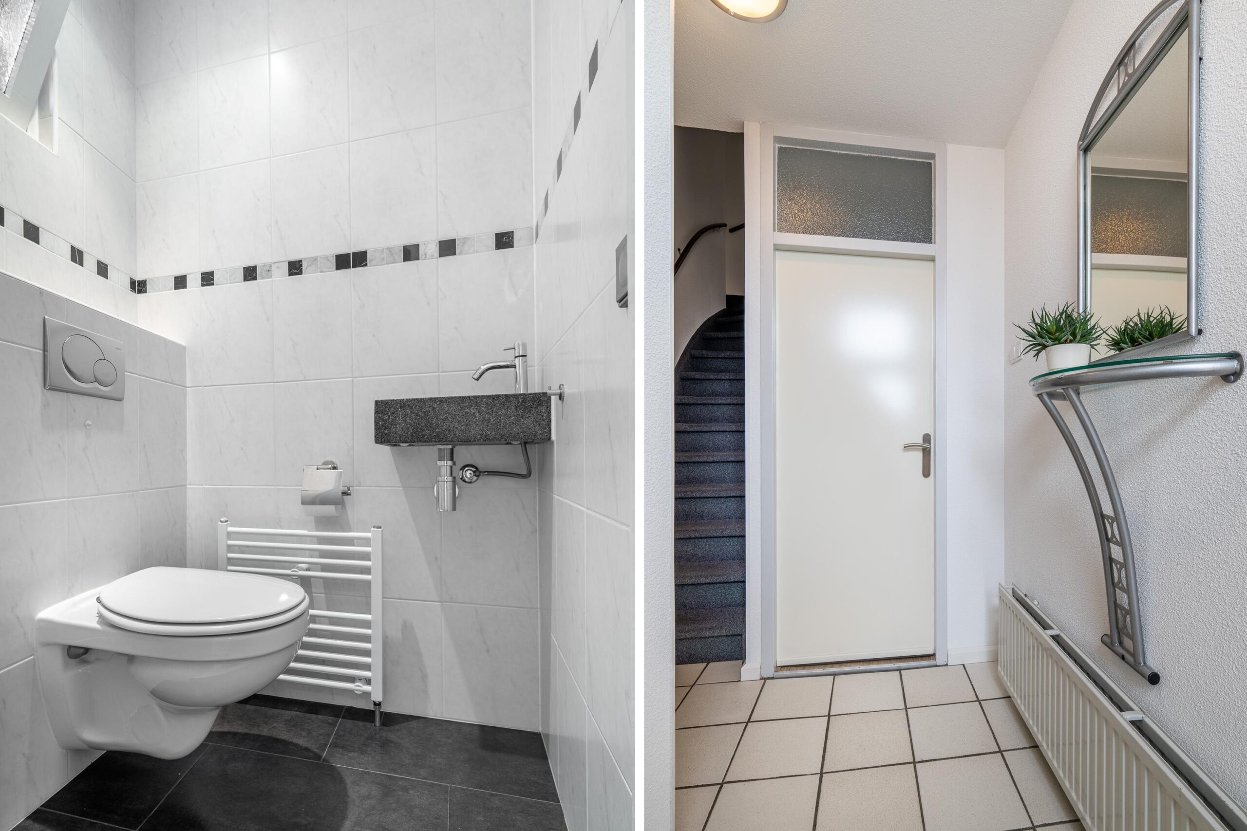 Entree/hal met trapopgang naar de verdieping en toegang tot het geheel betegelde toilet met vrijhangend closet en granieten fonteintje.