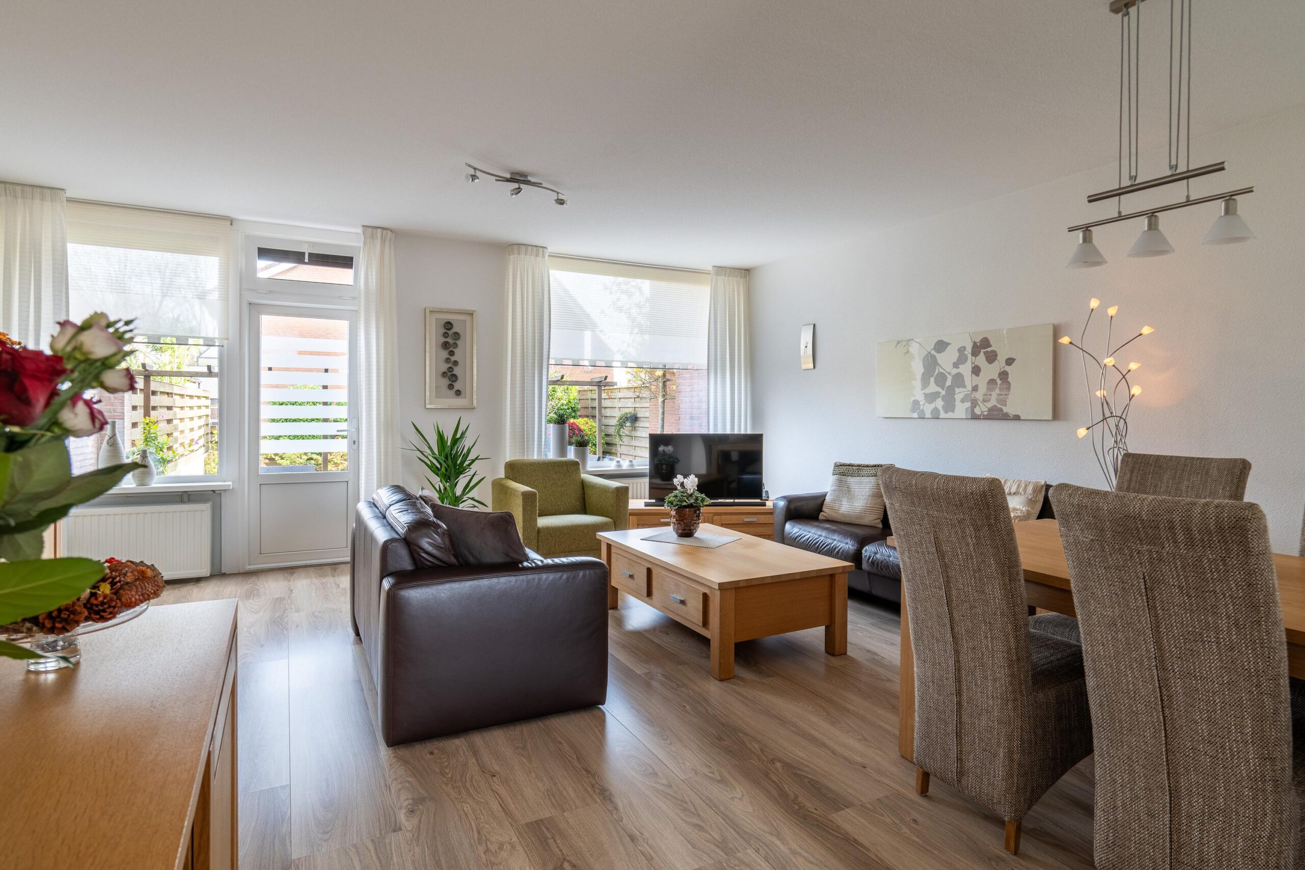 Sfeervolle, speels ingedeelde woonkamer met veel lichtinval en uitzicht op de tuin. Praktische trapkast aanwezig.