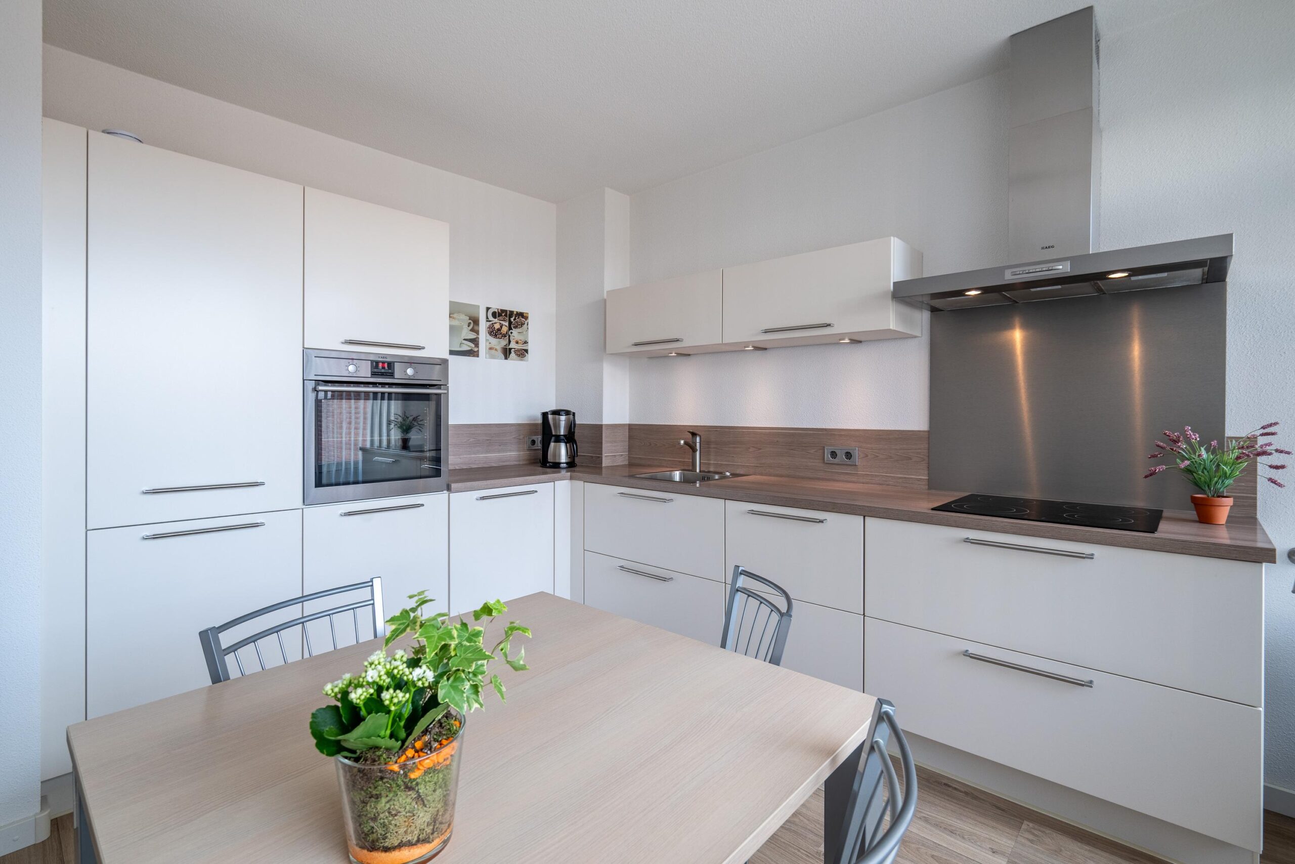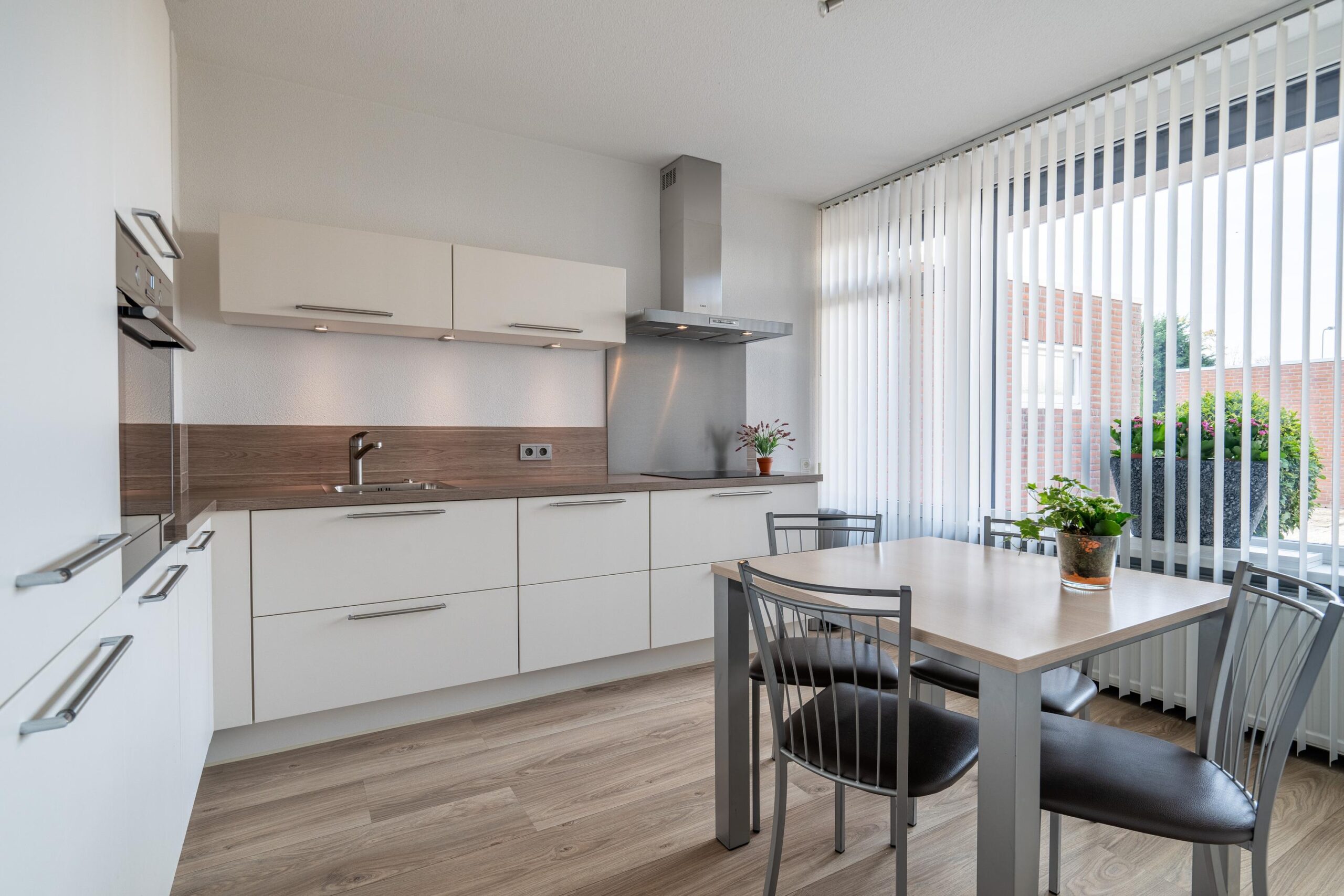 Aan de voorzijde bevindt zich de gezellige leefkeuken met moderne, lichte hoekopstelling, voorzien van de volgende apparatuur: RVS schouwafzuigkap, heteluchtoven, koel-vriescombinatie en inductiekookplaat.