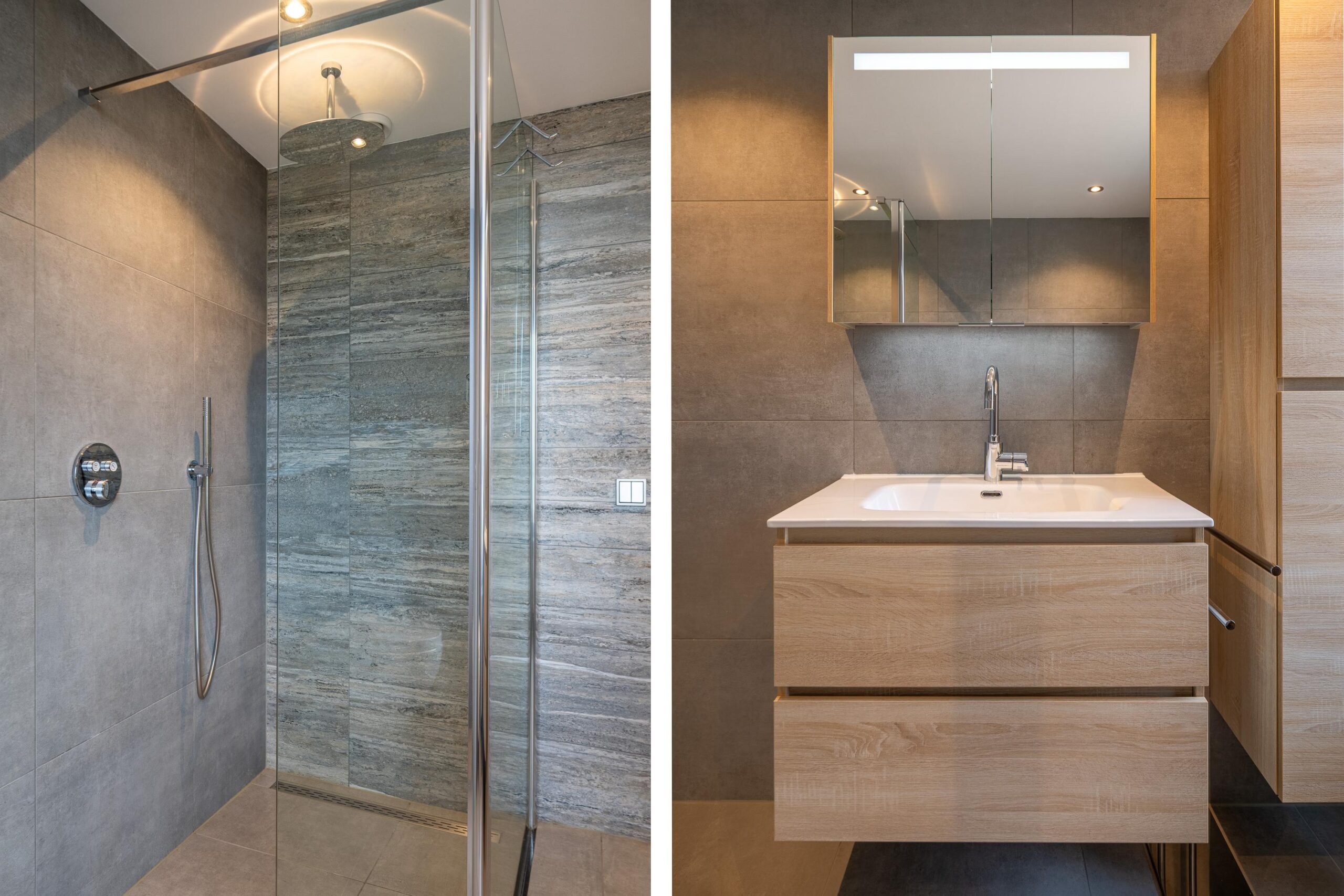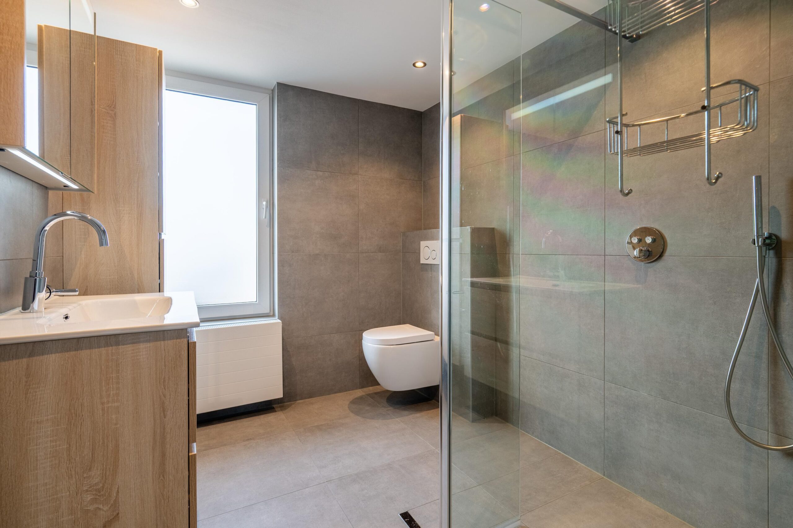 Recent vernieuwde badkamer, uitgerust met een wastafel met ombouw, vrijhangend toilet en een inloop-regendouche met ingebouwde mengkraan en hardglazen wand (deels beweegbaar).
