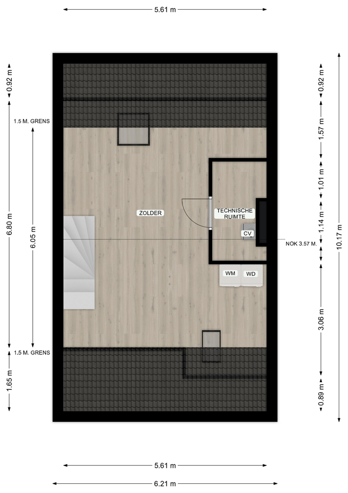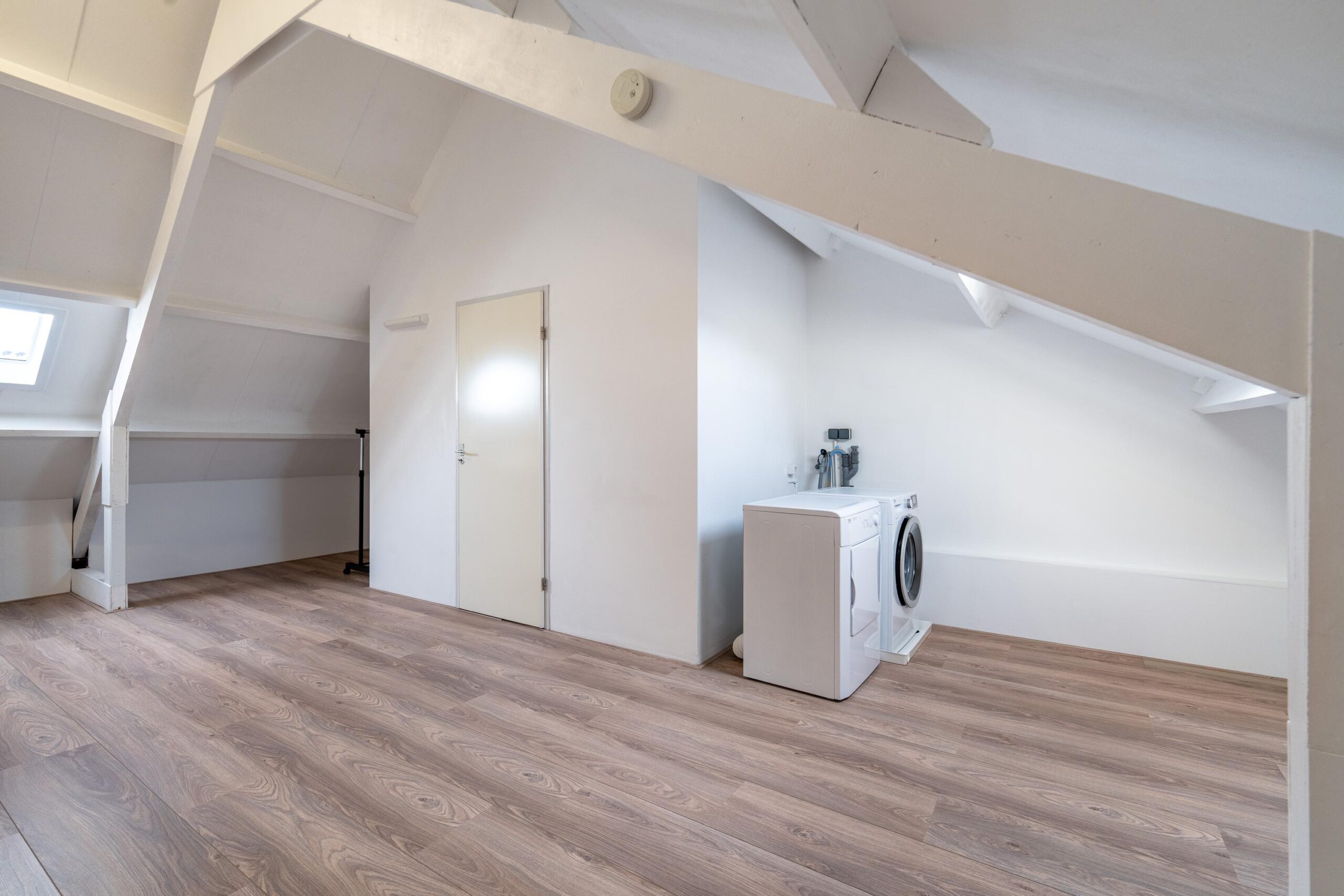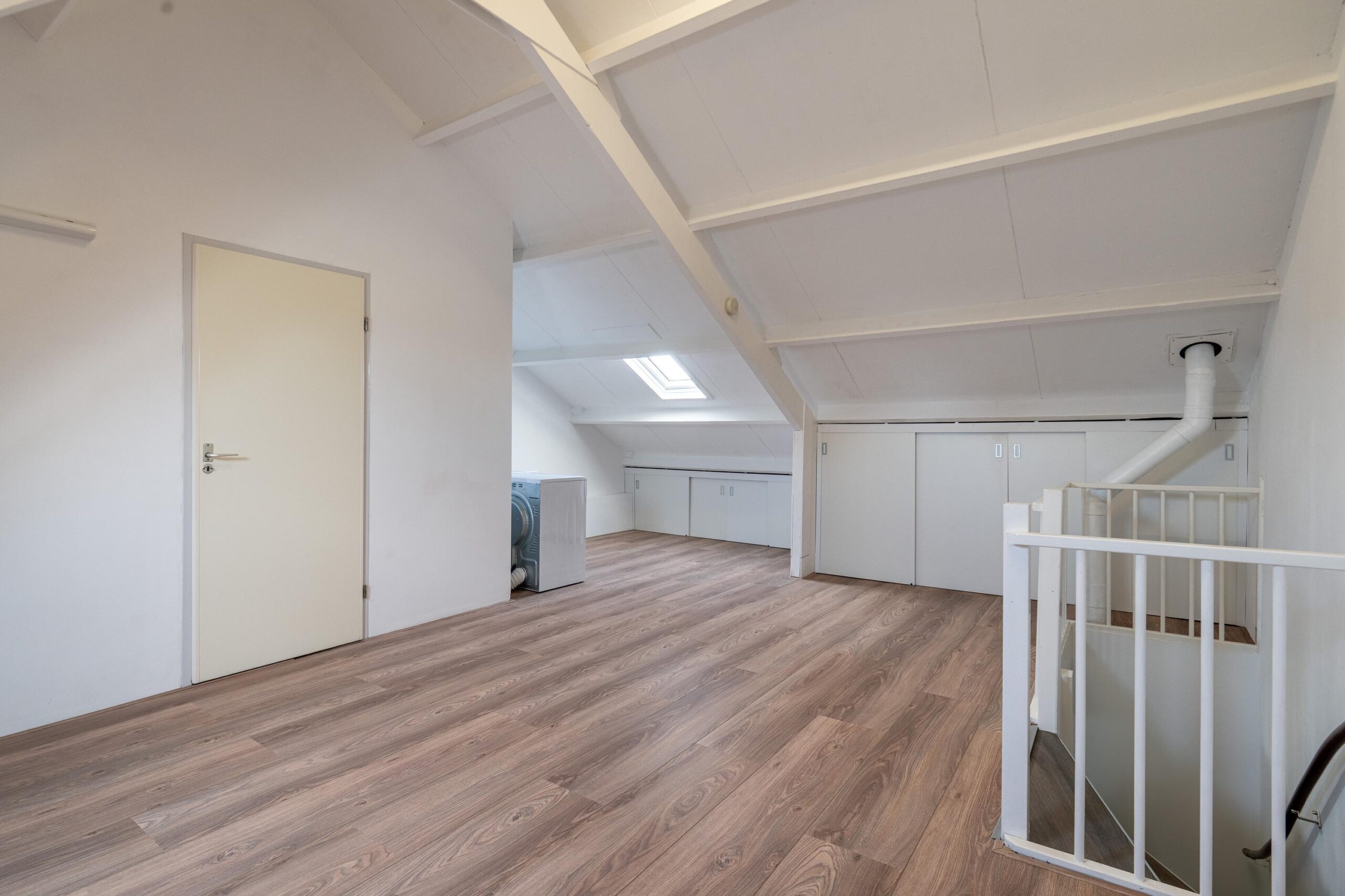Middels vaste trap toegang tot de zeer royale zolderverdieping. Deze verdieping is keurig afgewerkt en beschikt over een laminaatvloer, schuifkasten, wasmachineaansluiting en een aparte technische ruimte met de Nefit Combi HR Excellent CV-installatie.