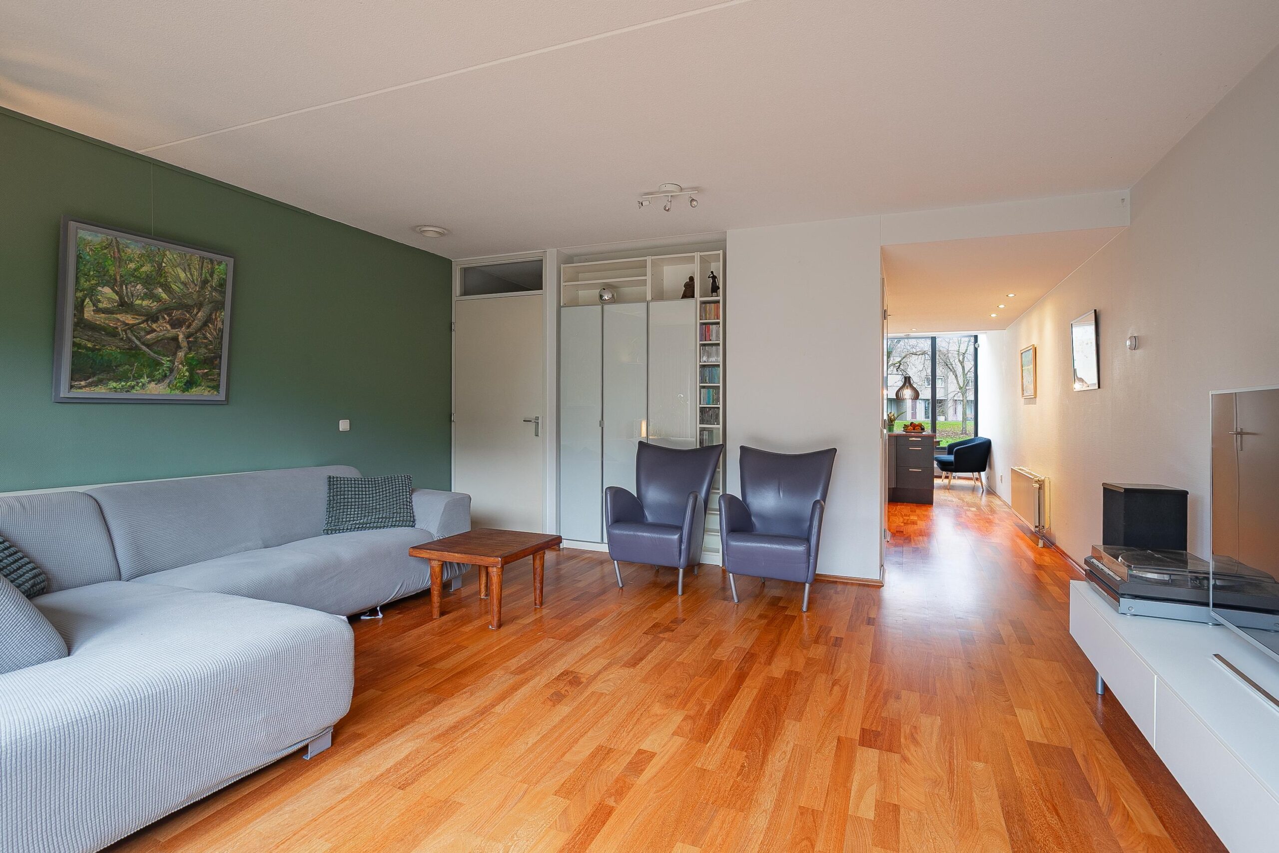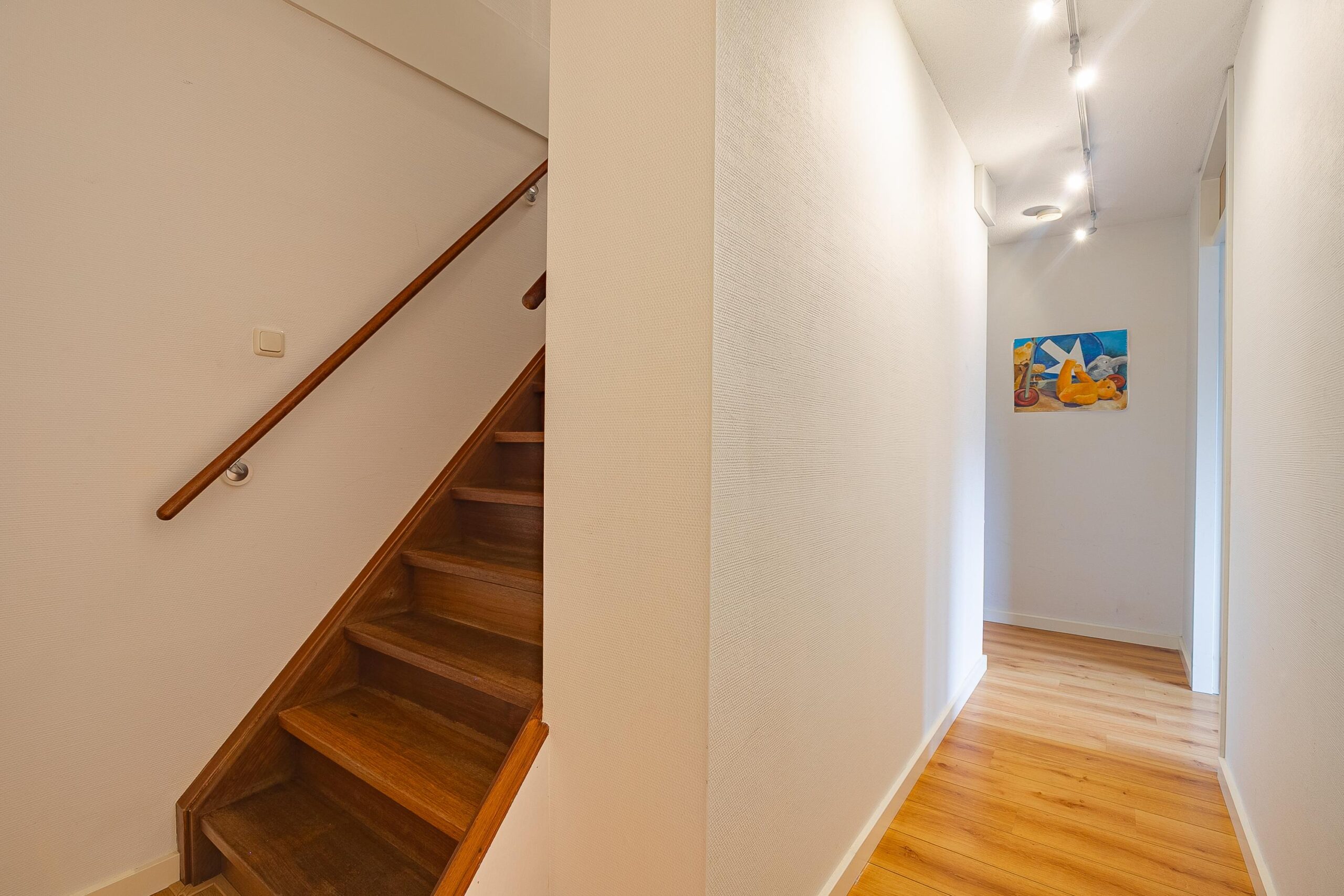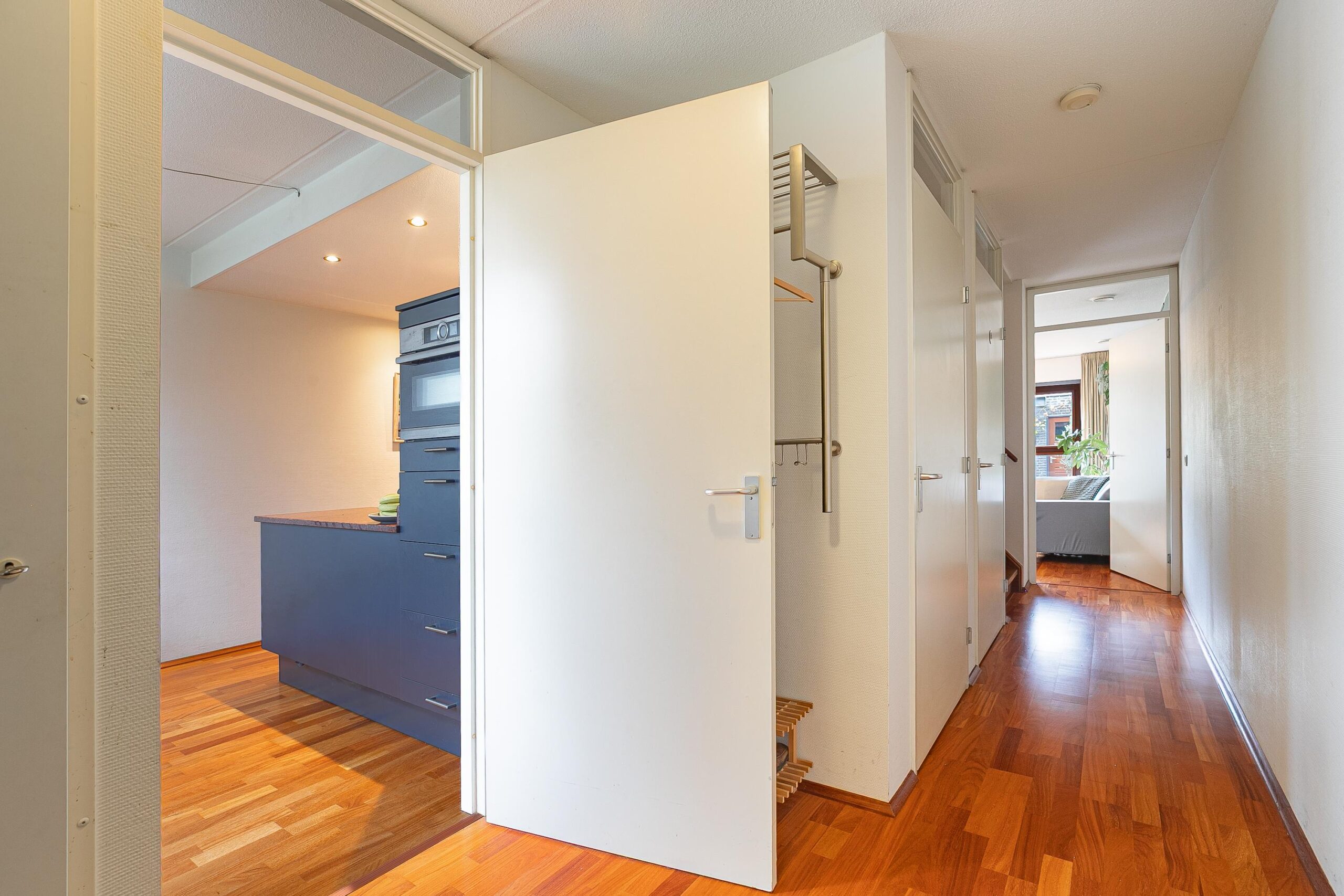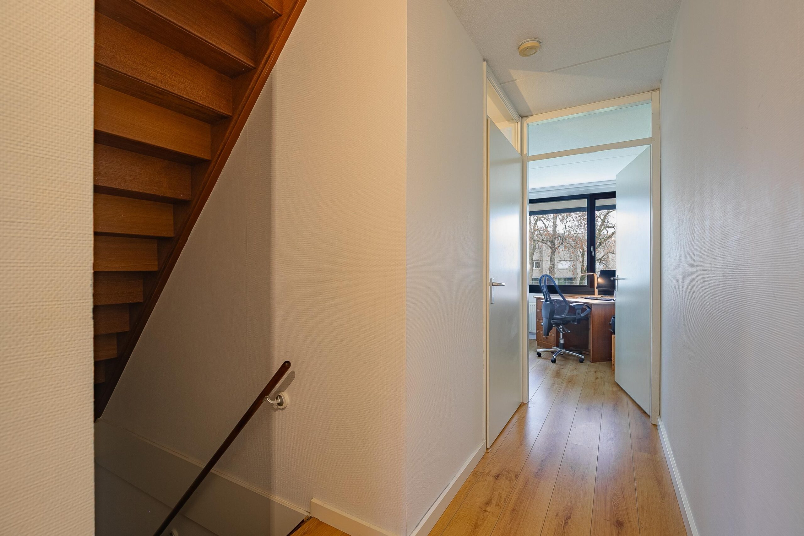 Onder de trap bevindt zich een ruime trapkast. De zitkamer sluit halfopen aan op de keuken en heeft openslaande deuren naar de tuin. Vanuit de woonkamer is een tussenportaal bereikbaar met toegang tot het toilet en de trap naar de eerste verdieping.