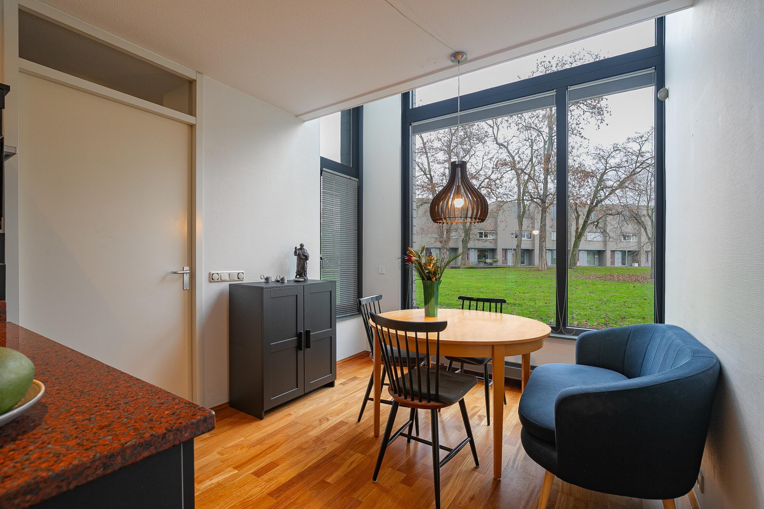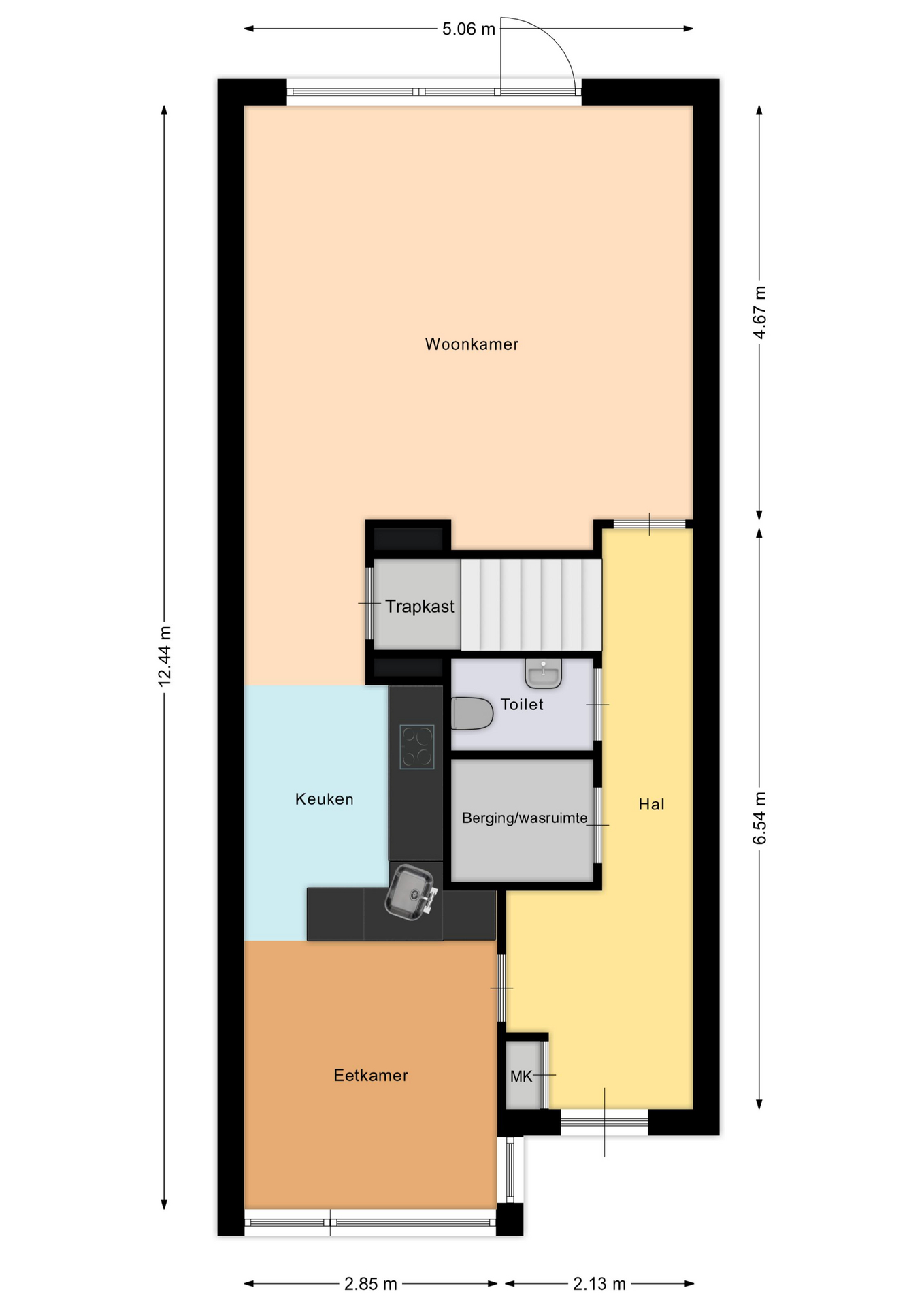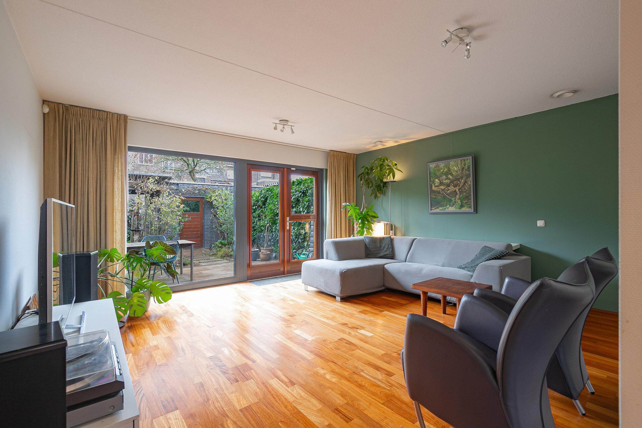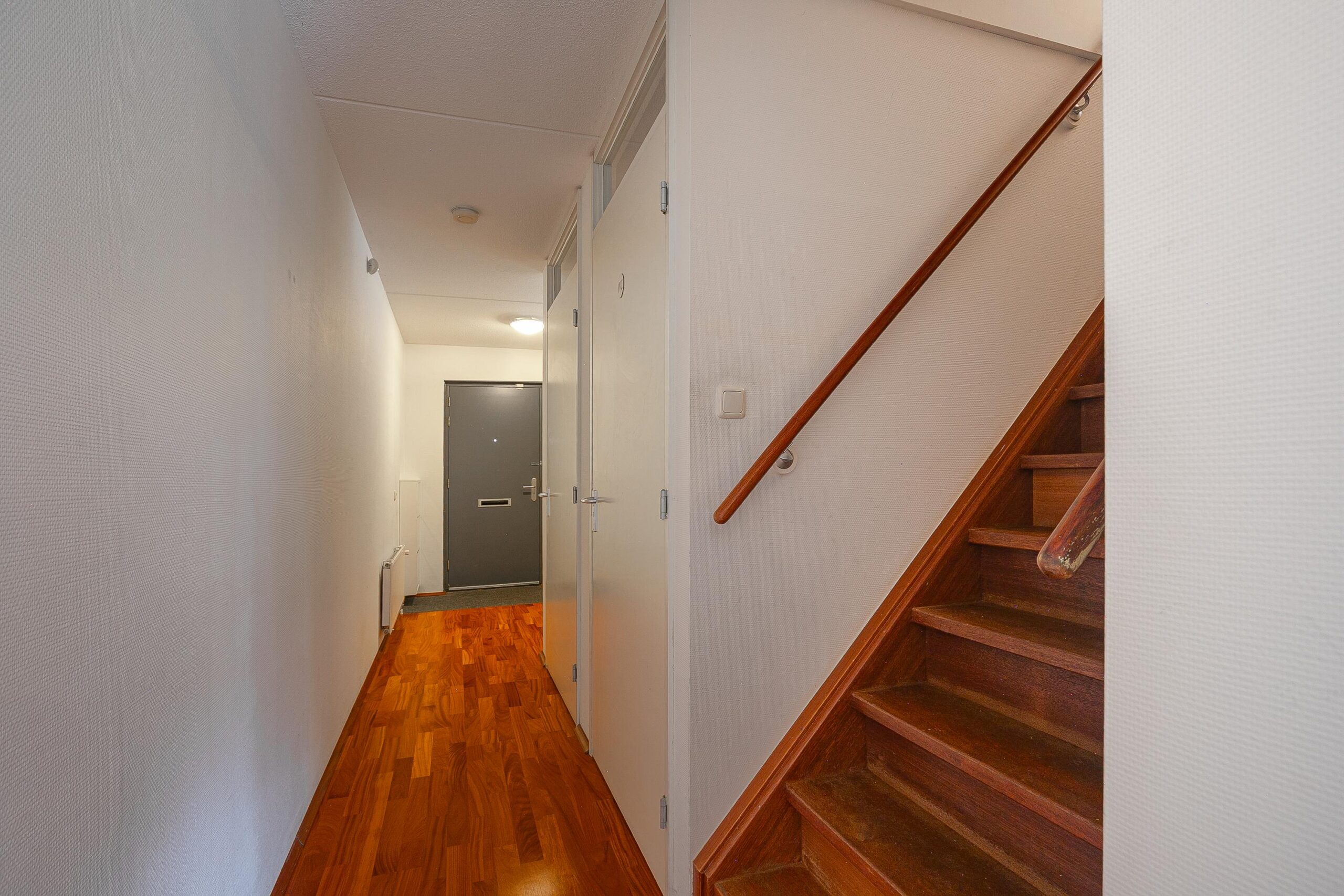 Onder de trap bevindt zich een ruime trapkast. De zitkamer sluit halfopen aan op de keuken en heeft openslaande deuren naar de tuin. Vanuit de woonkamer is een tussenportaal bereikbaar met toegang tot het toilet en de trap naar de eerste verdieping.