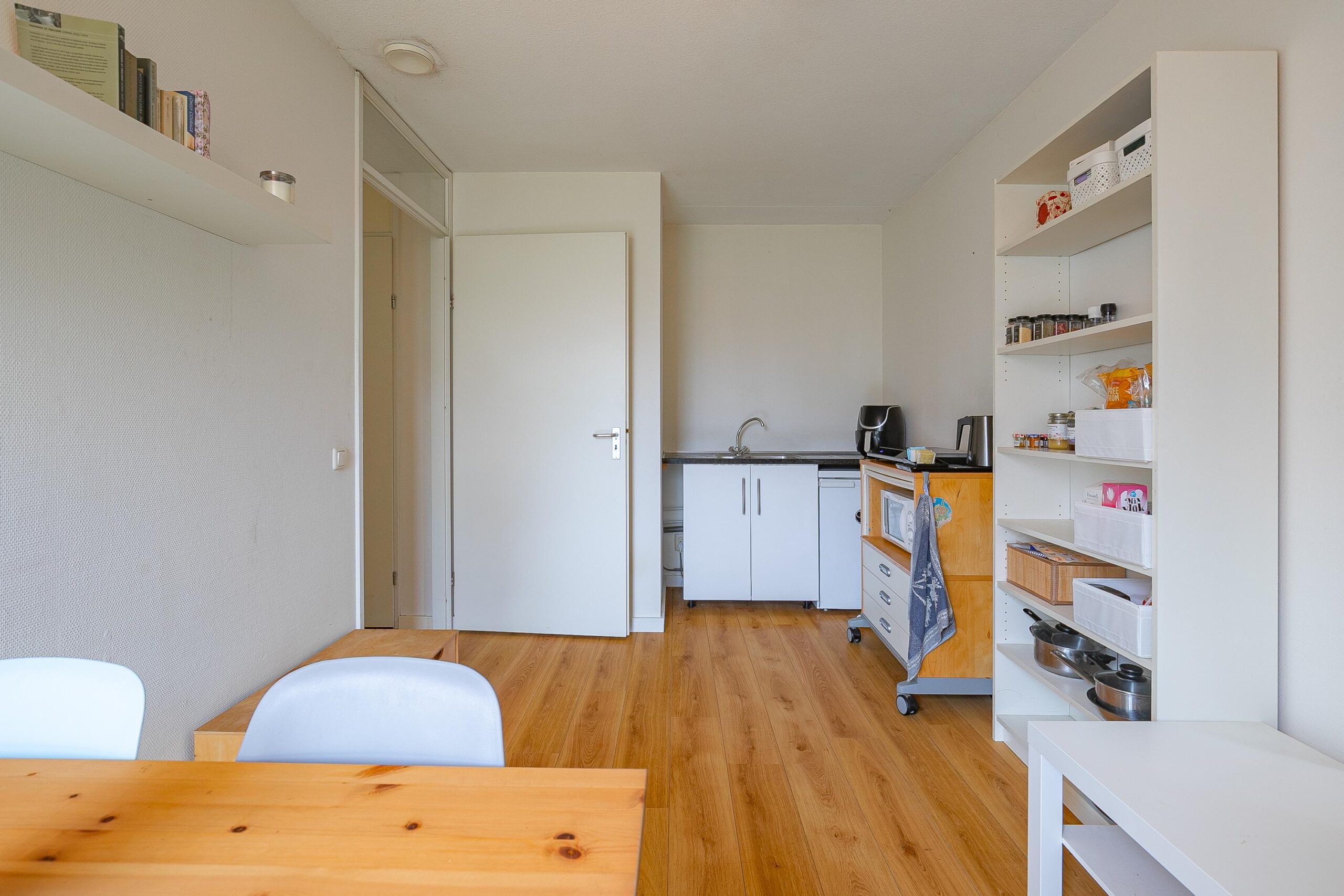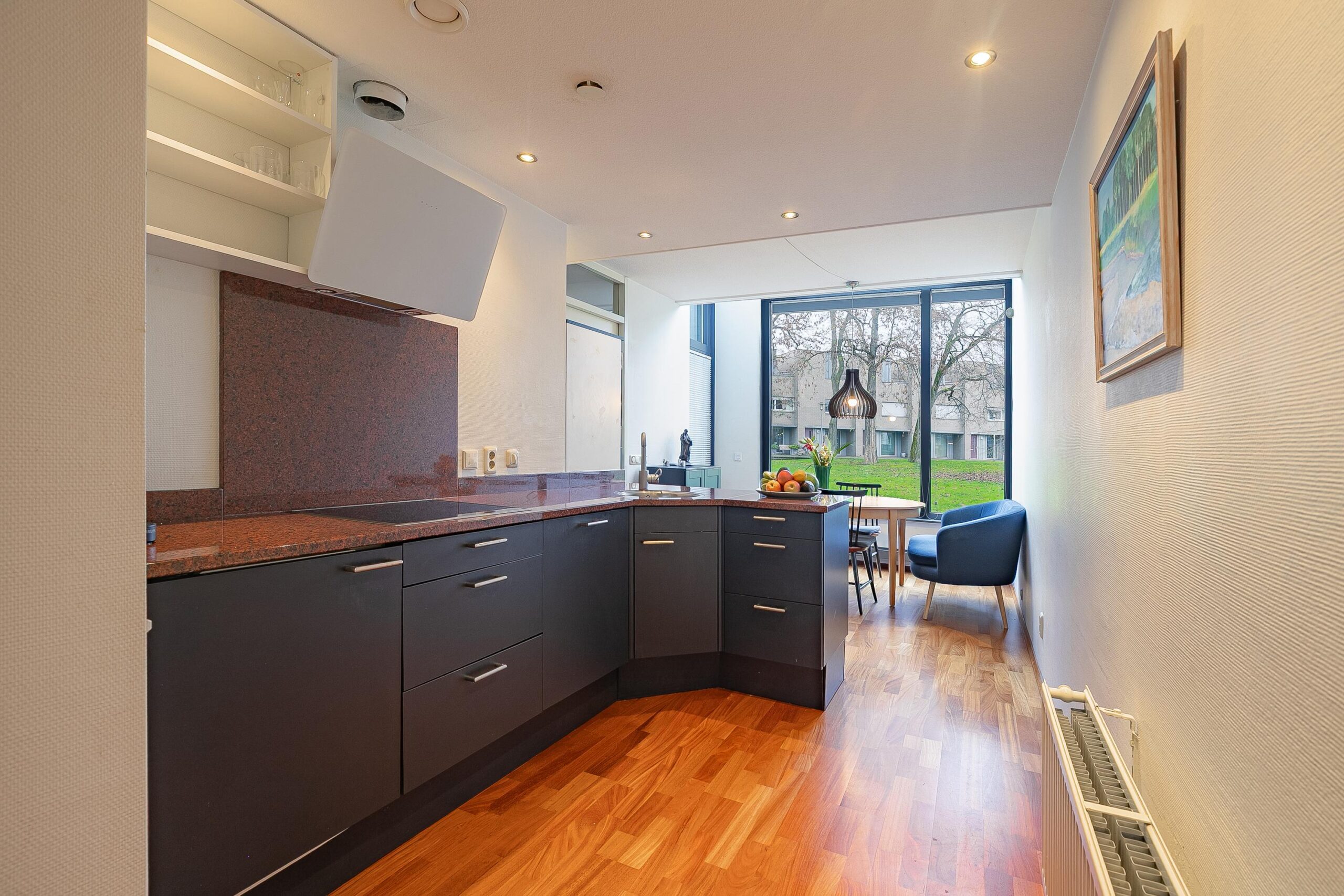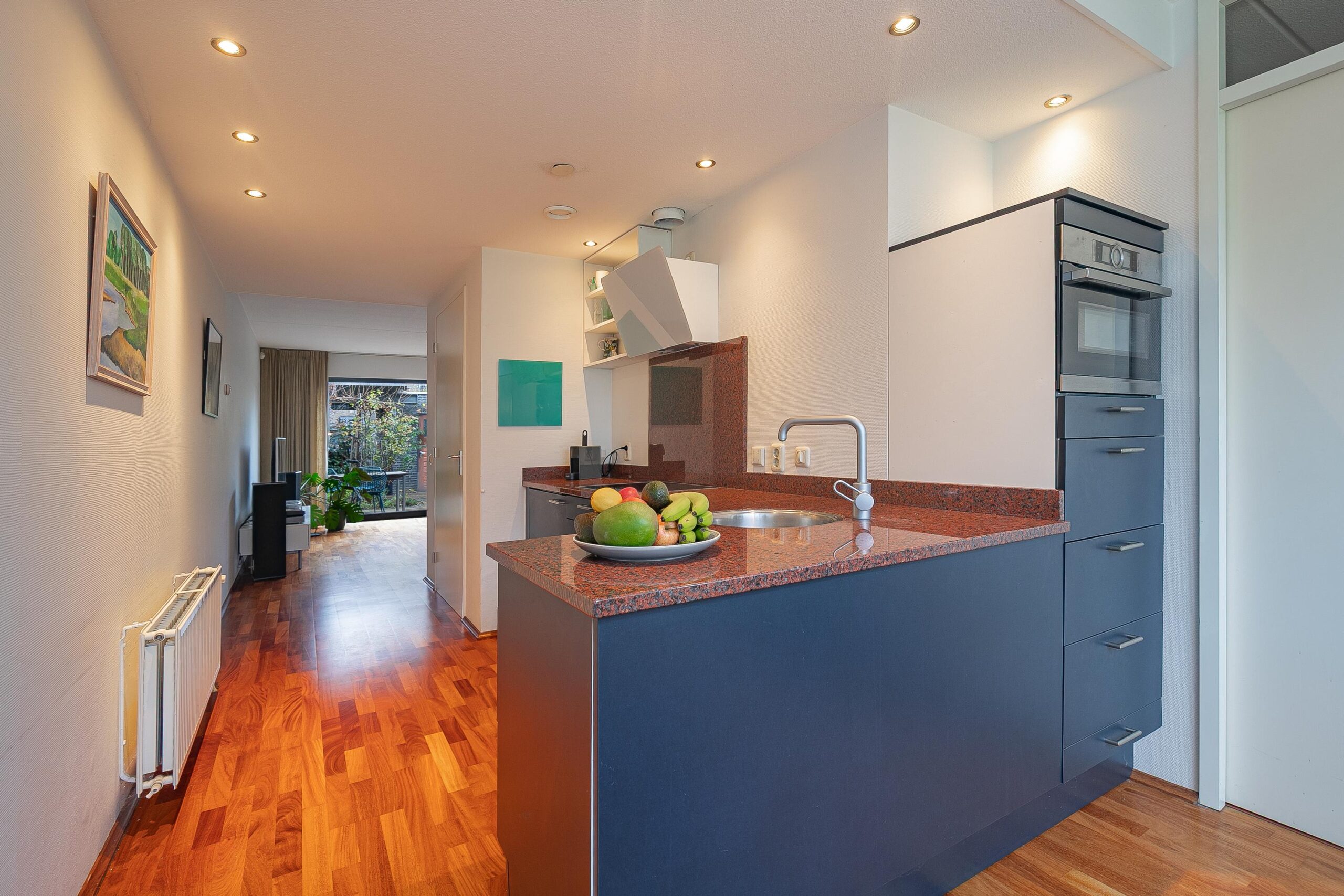 Ruime hal/entree met meterkast, berging (met aansluitingen voor wasmachine en droger), trap naar de eerste verdieping en een toilet met fonteintje. Aan de voorzijde ligt de leefkeuken met een vide, waardoor er veel licht binnenkomt. De keuken heeft een praktische L-opstelling en is uitgerust met een inductie kookplaat, afzuigkap, vaatwasser, spoelbak en combi-oven.