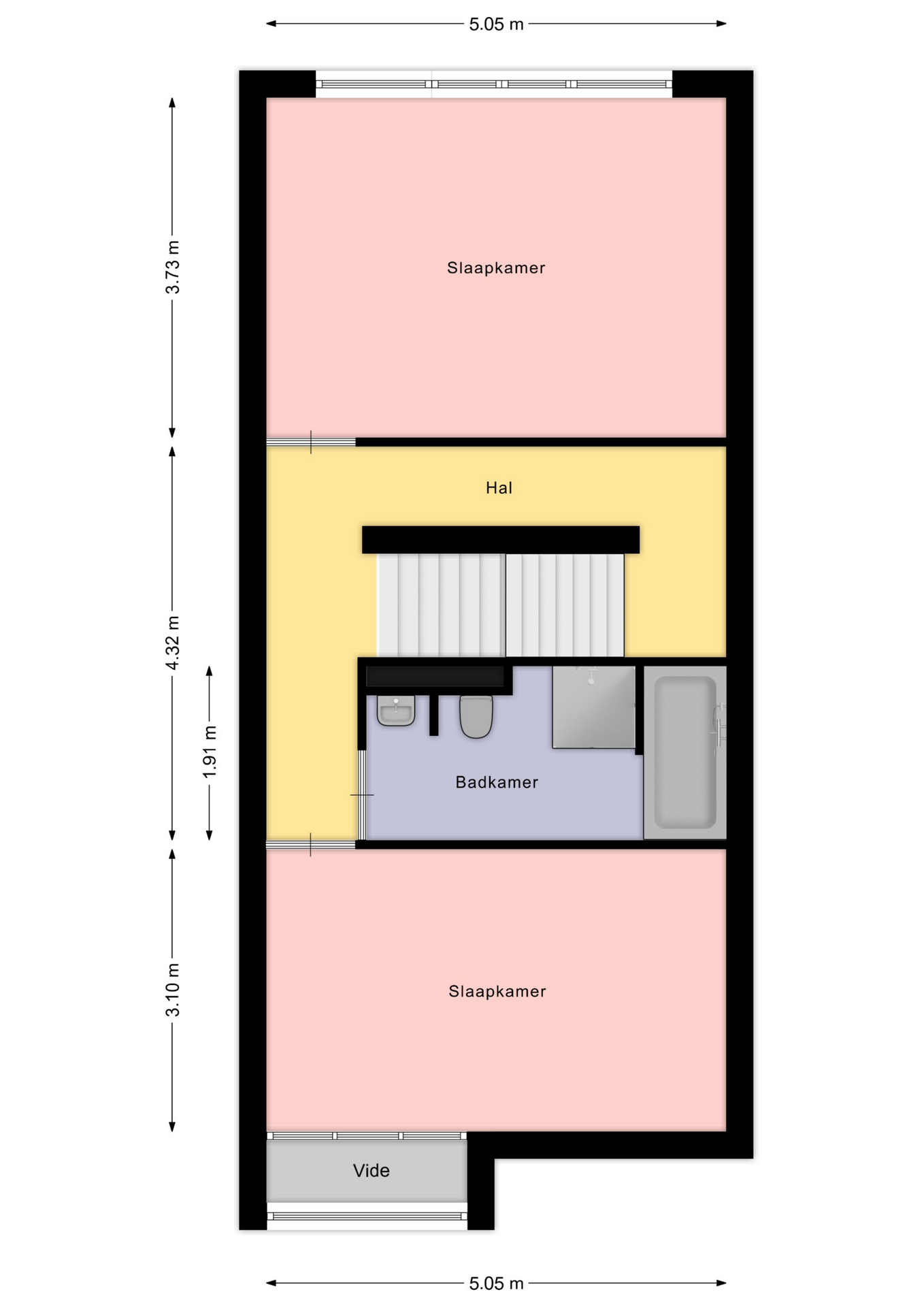 Vanaf de overloop is er toegang tot de badkamer met ligbad, douche, wastafel en toilet. Daarnaast zijn er twee ruime slaapkamers van ca. 16 m² en 19 m². Via een vaste trap is de tweede verdieping bereikbaar.