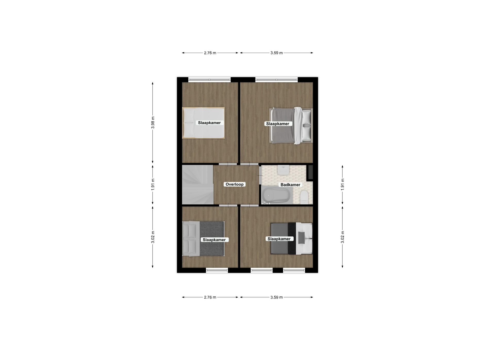Middels vaste trap te bereiken overloop vanuit waar drie slaapkamers en de bergruimte te bereiken zijn. De slaapkamers zijn respectievelijk ca. 10m2, 10m2 en 8m2 groot. De bergruimte met cv-installatie (Bosch, eigendom) is ruim van opzet en voorzien van een inbouwkast met schuifdeuren.