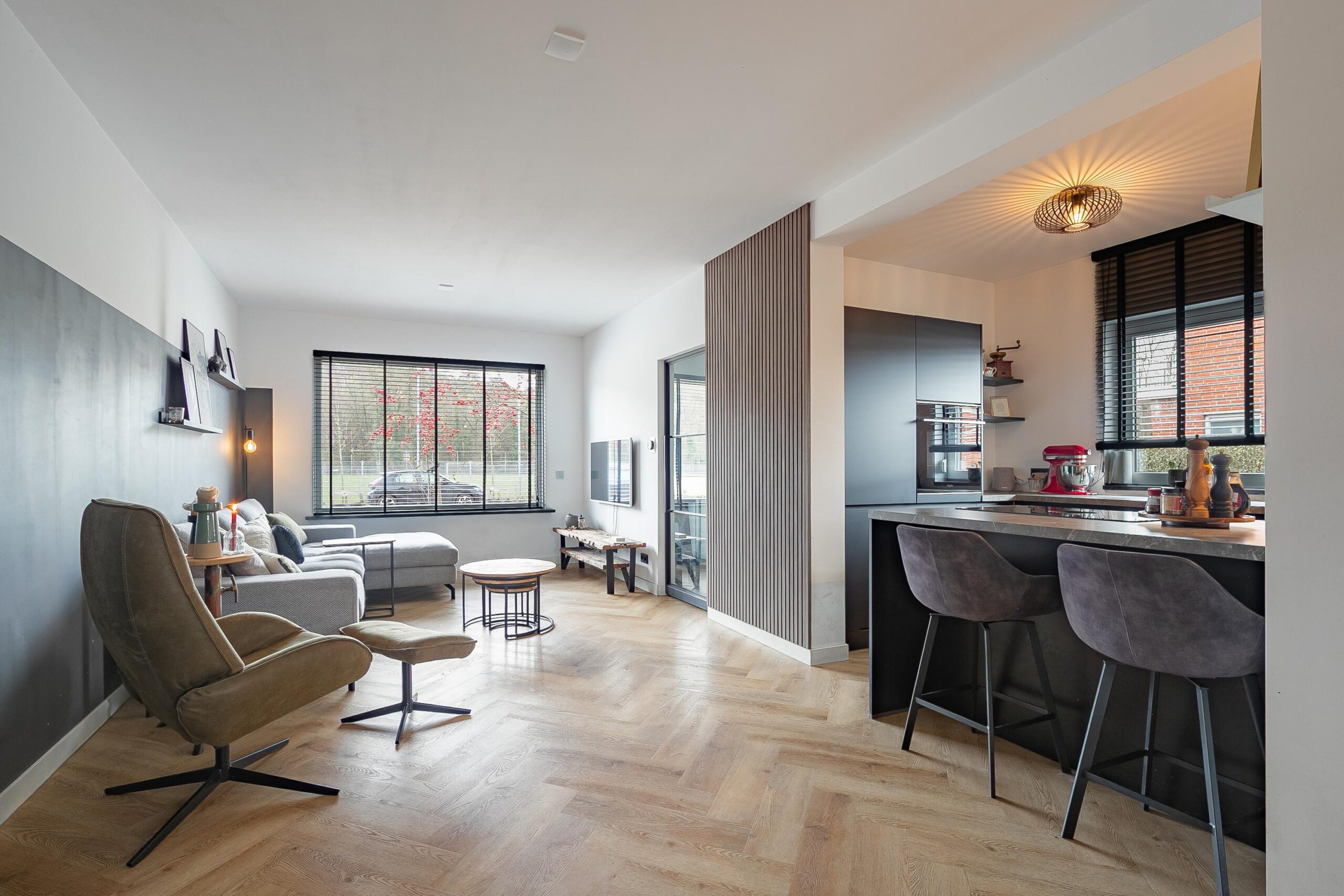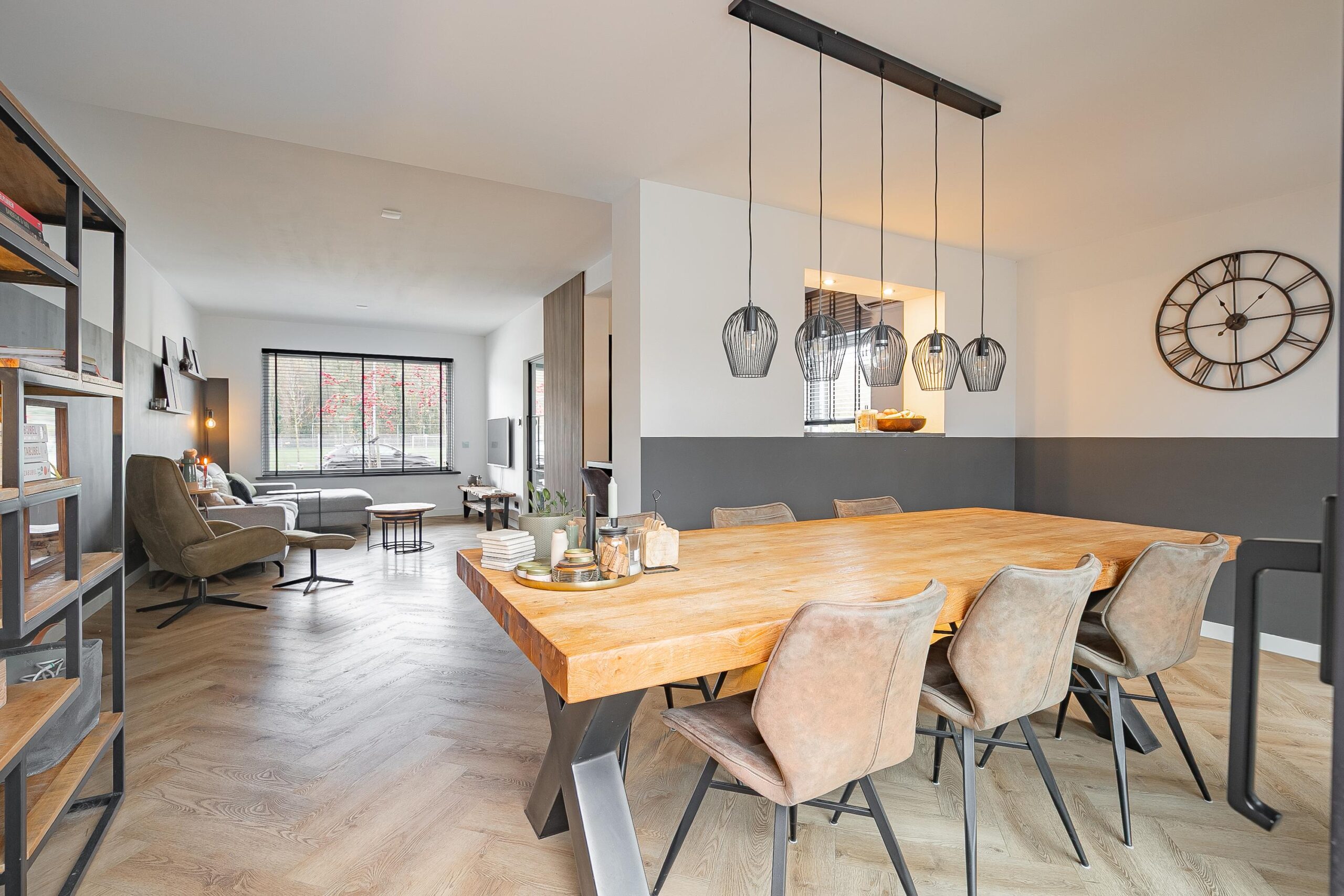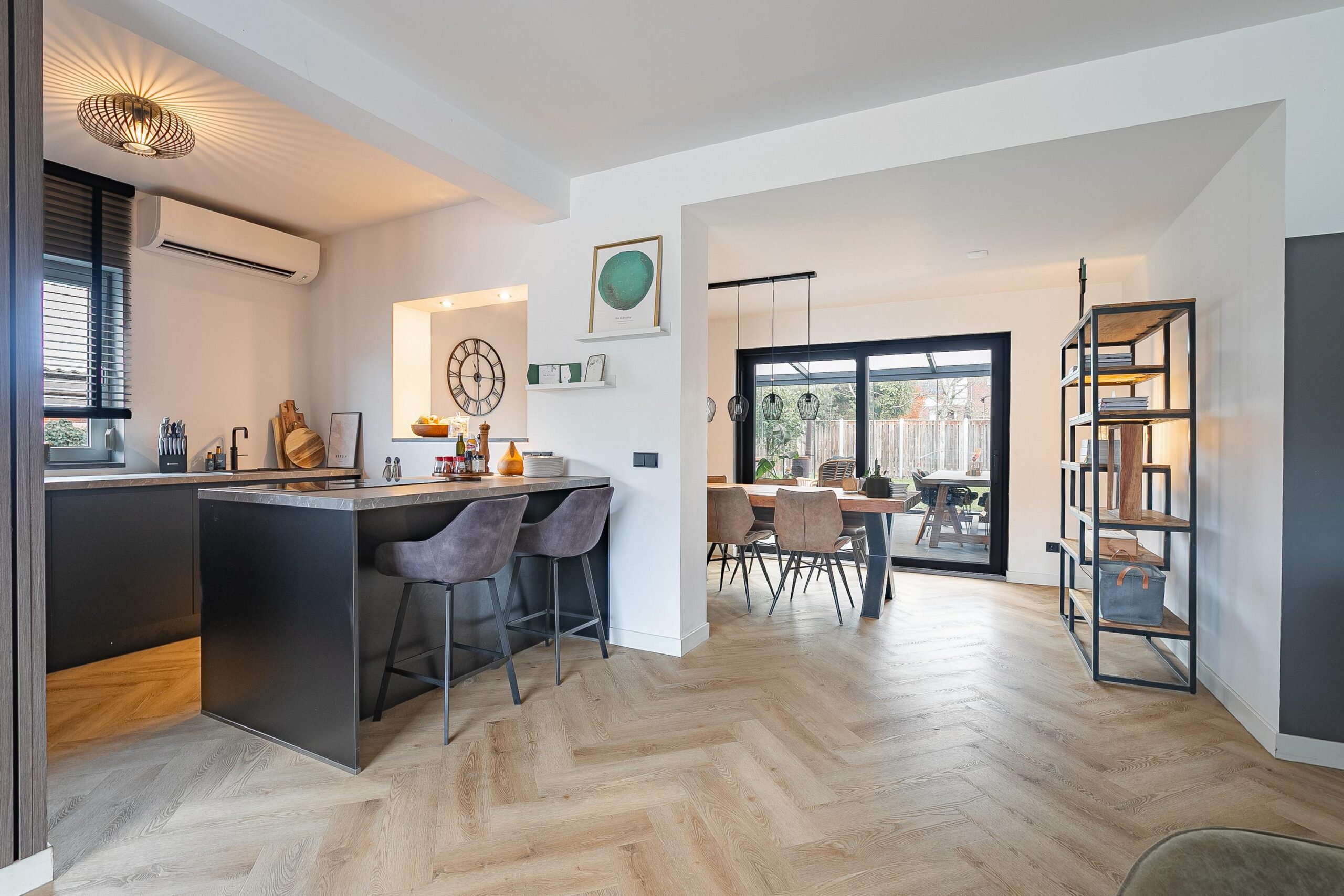 De woonkamer heeft in 2022 een complete metamorfose ondergaan. De huidige eigenaren kozen voor een moderne visgraat pvc-vloer met vloerverwarming, strak gestucte wanden en plafonds, een open leefkeuken en een prachtige aanbouw met royale schuifpui naar de overkapping. Aan de voorzijde geniet u van een vrij uitzicht over de voetbalvelden en de bosrand.