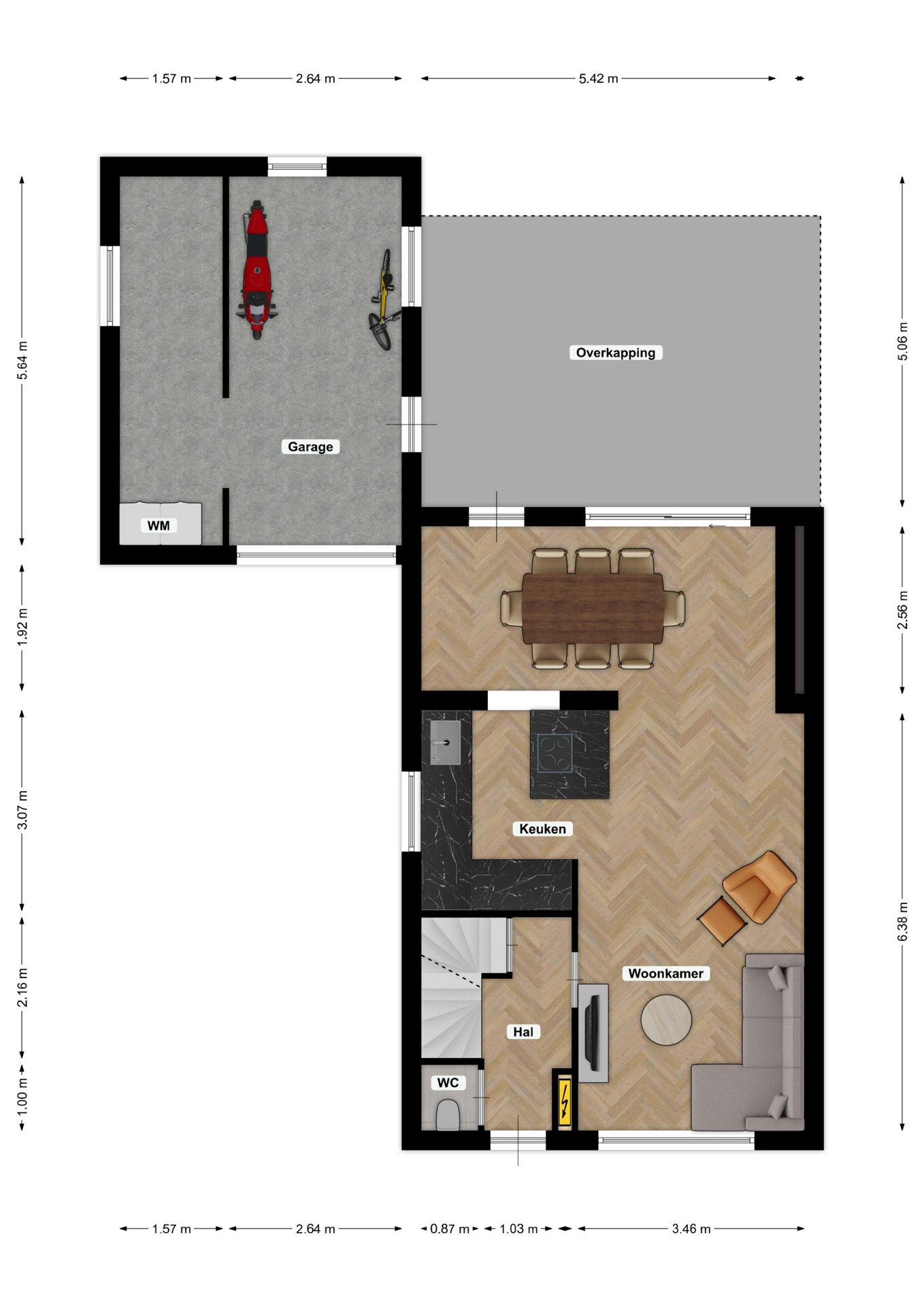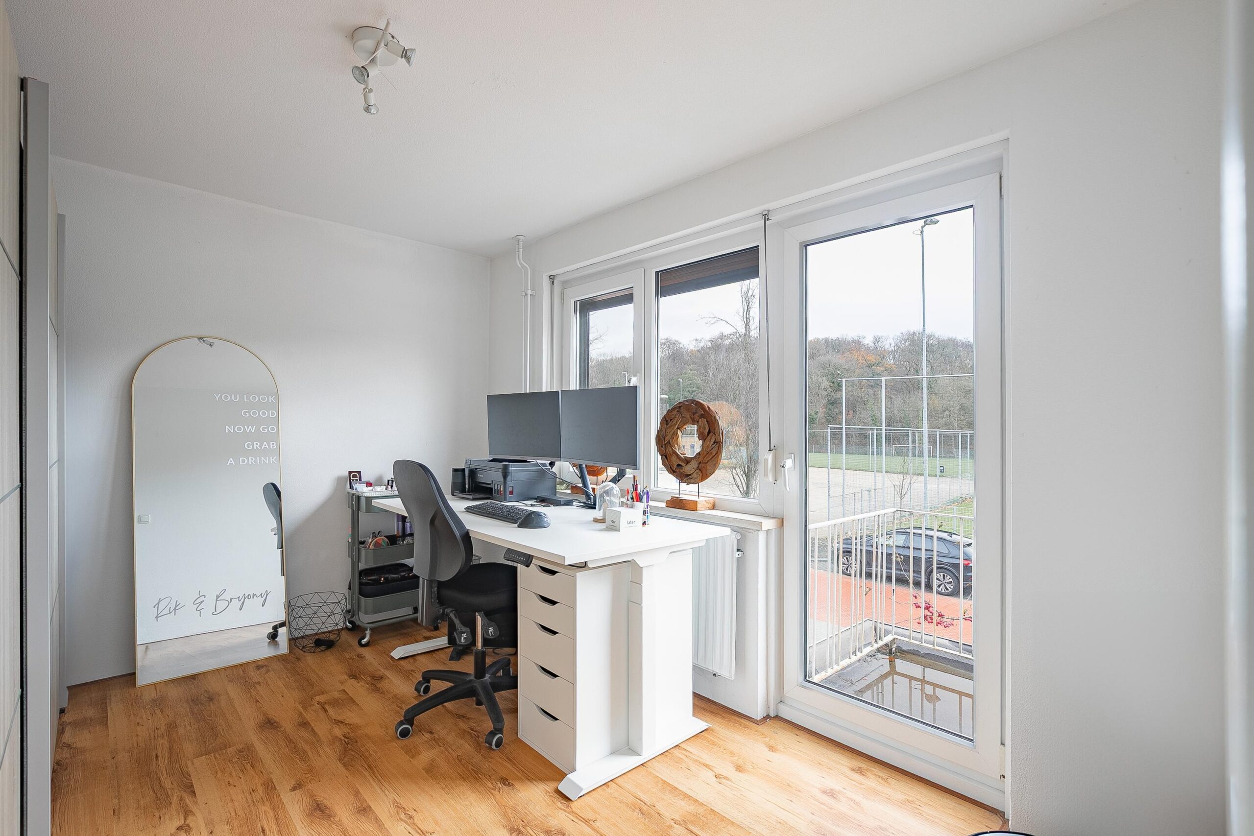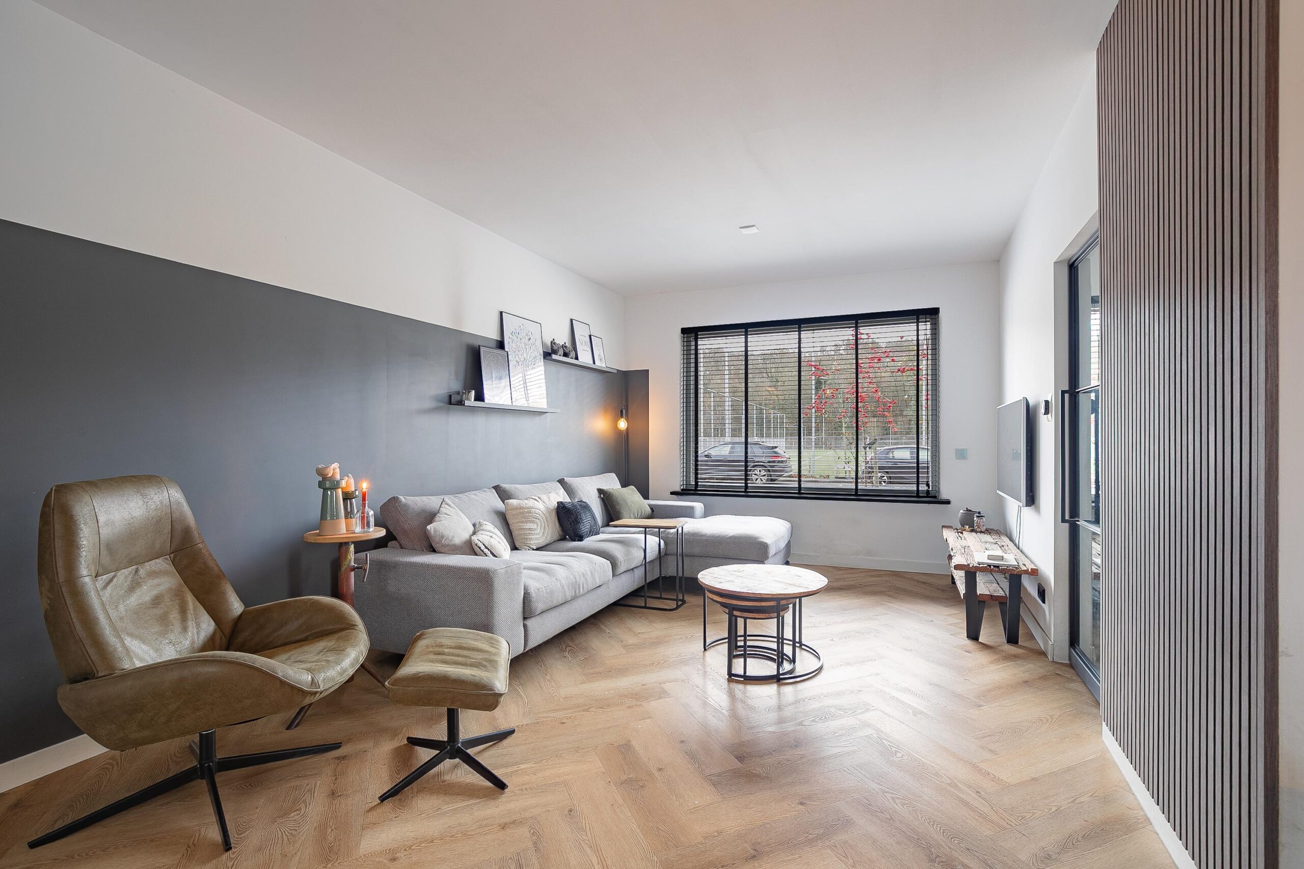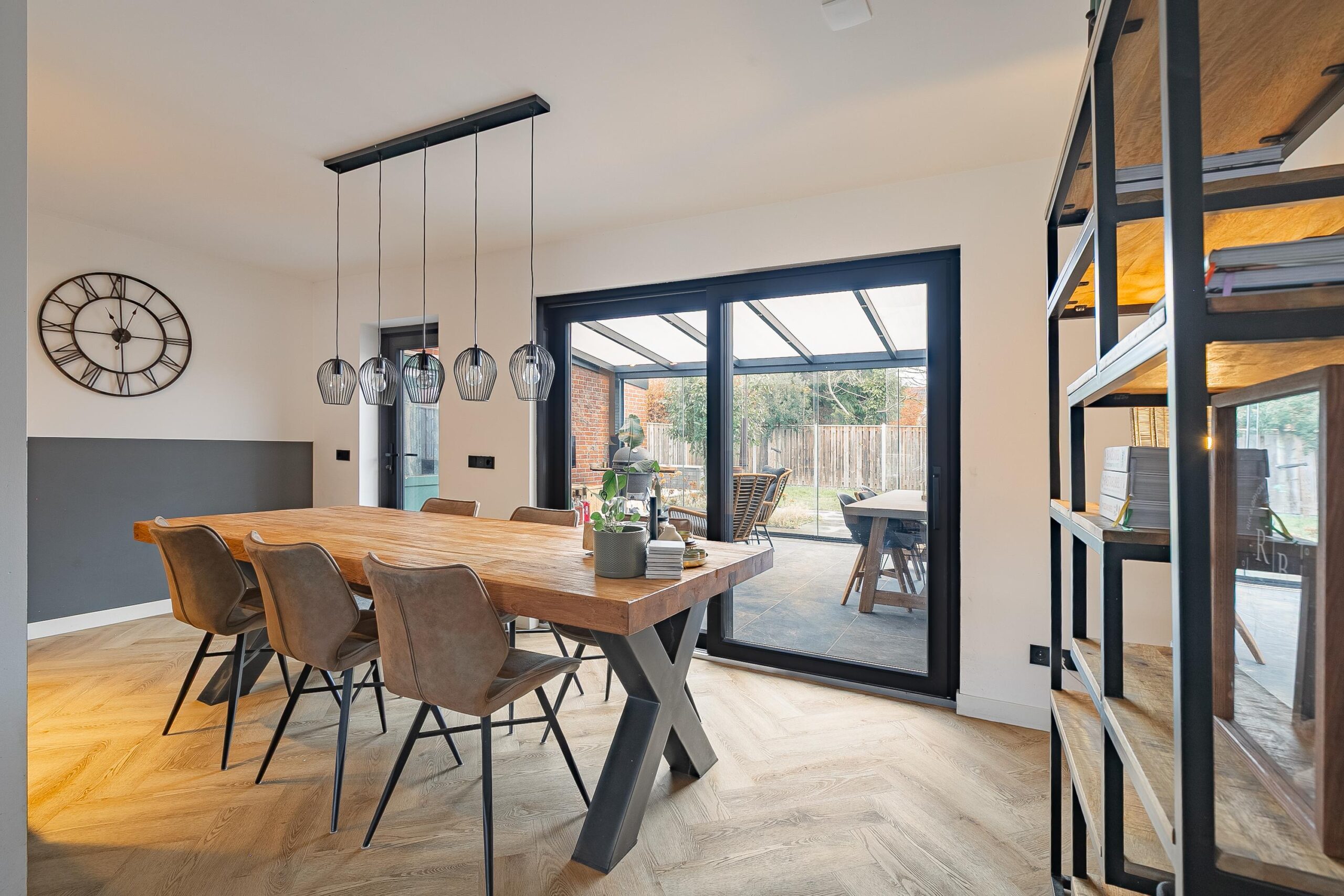 De woonkamer heeft in 2022 een complete metamorfose ondergaan. De huidige eigenaren kozen voor een moderne visgraat pvc-vloer met vloerverwarming, strak gestucte wanden en plafonds, een open leefkeuken en een prachtige aanbouw met royale schuifpui naar de overkapping. Aan de voorzijde geniet u van een vrij uitzicht over de voetbalvelden en de bosrand.