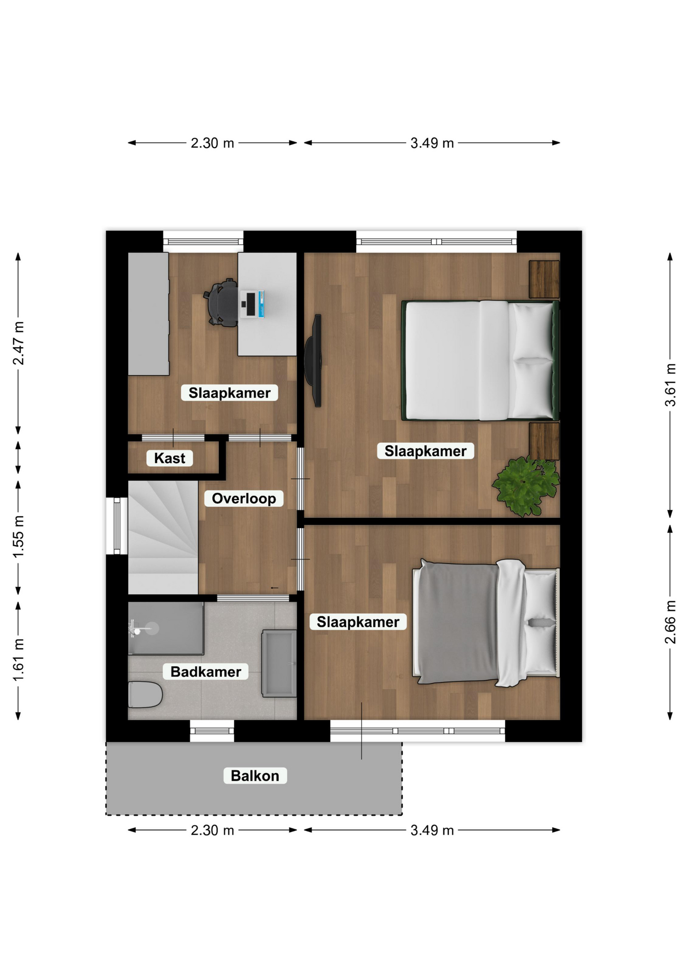 2) 3.49 x 2.66 met balkon aan voorzijde